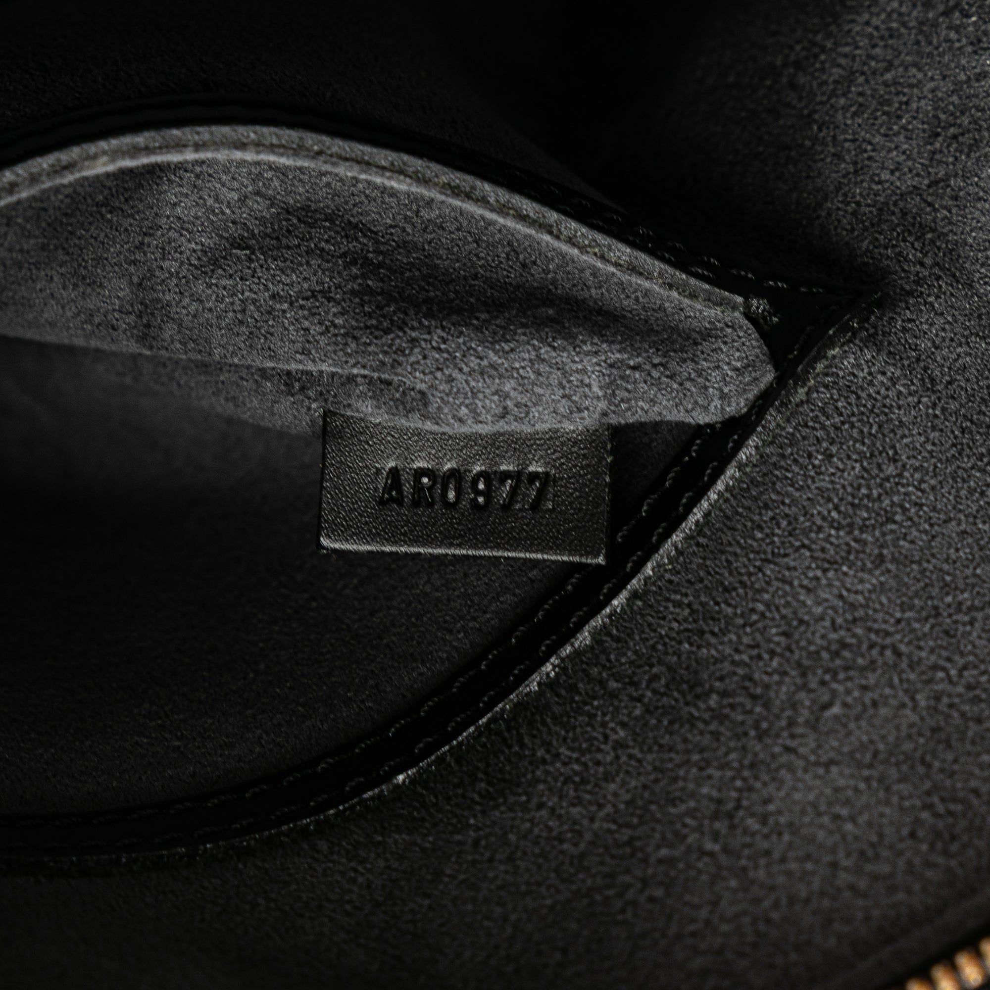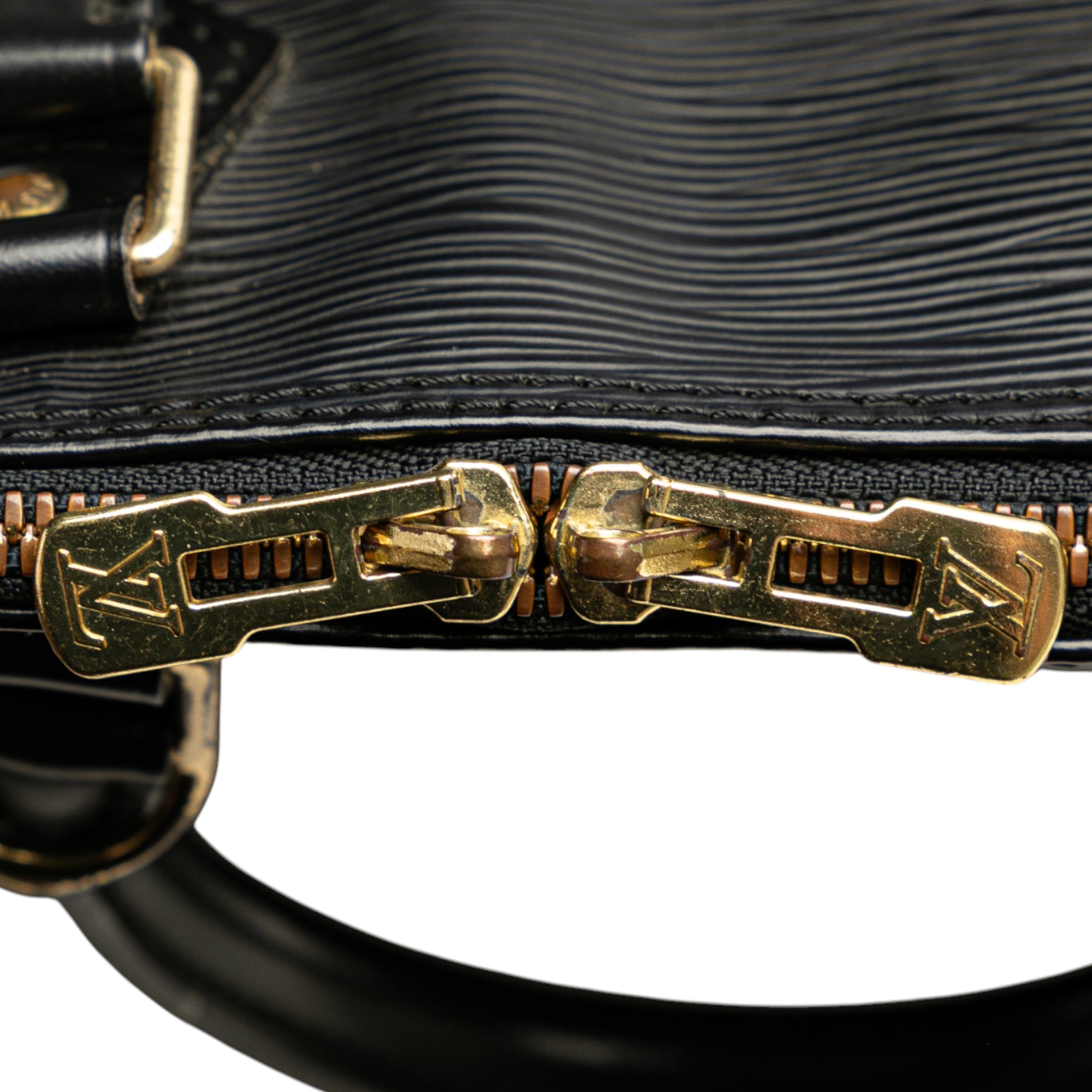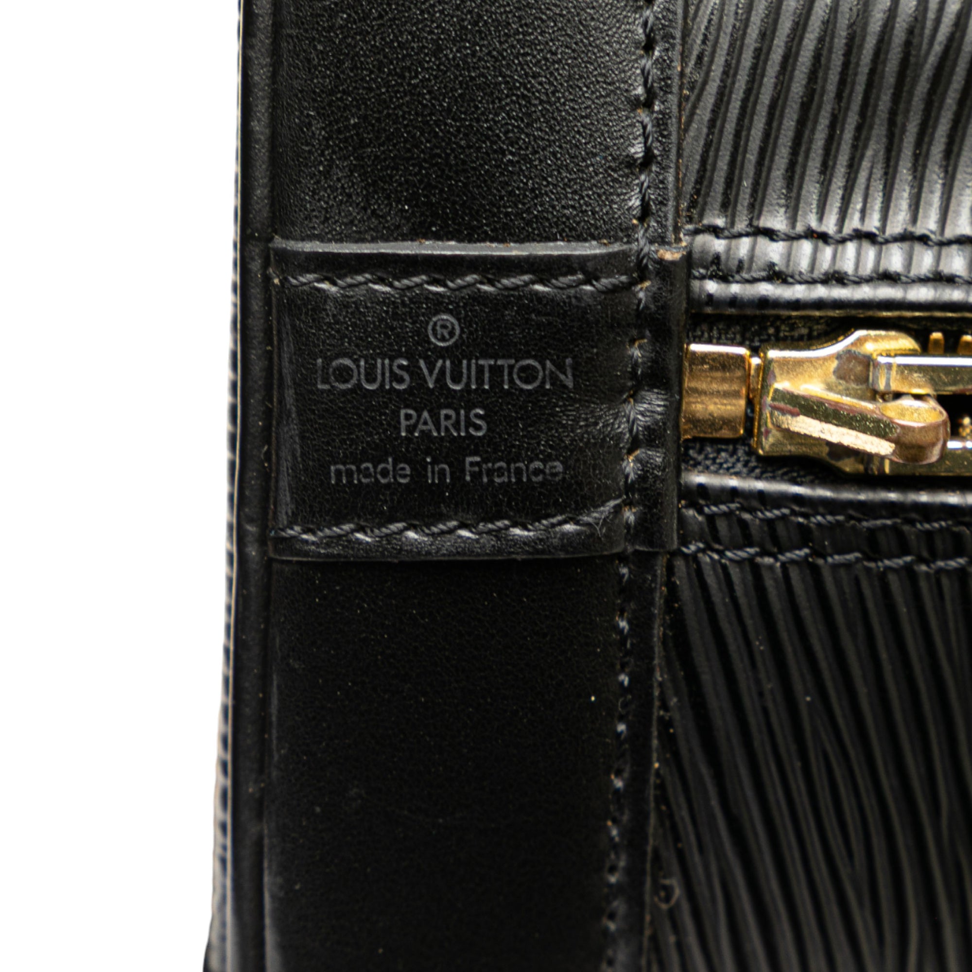 Product Details: Black Louis Vuitton Epi Alma PM Handbag. The Alma PM features an epi leather body, rolled leather handles, a top zip closure and an interior slip pocket. 9.4" L x 12" W x 6.3" D, 3.3" drop. Serial number AR0977.