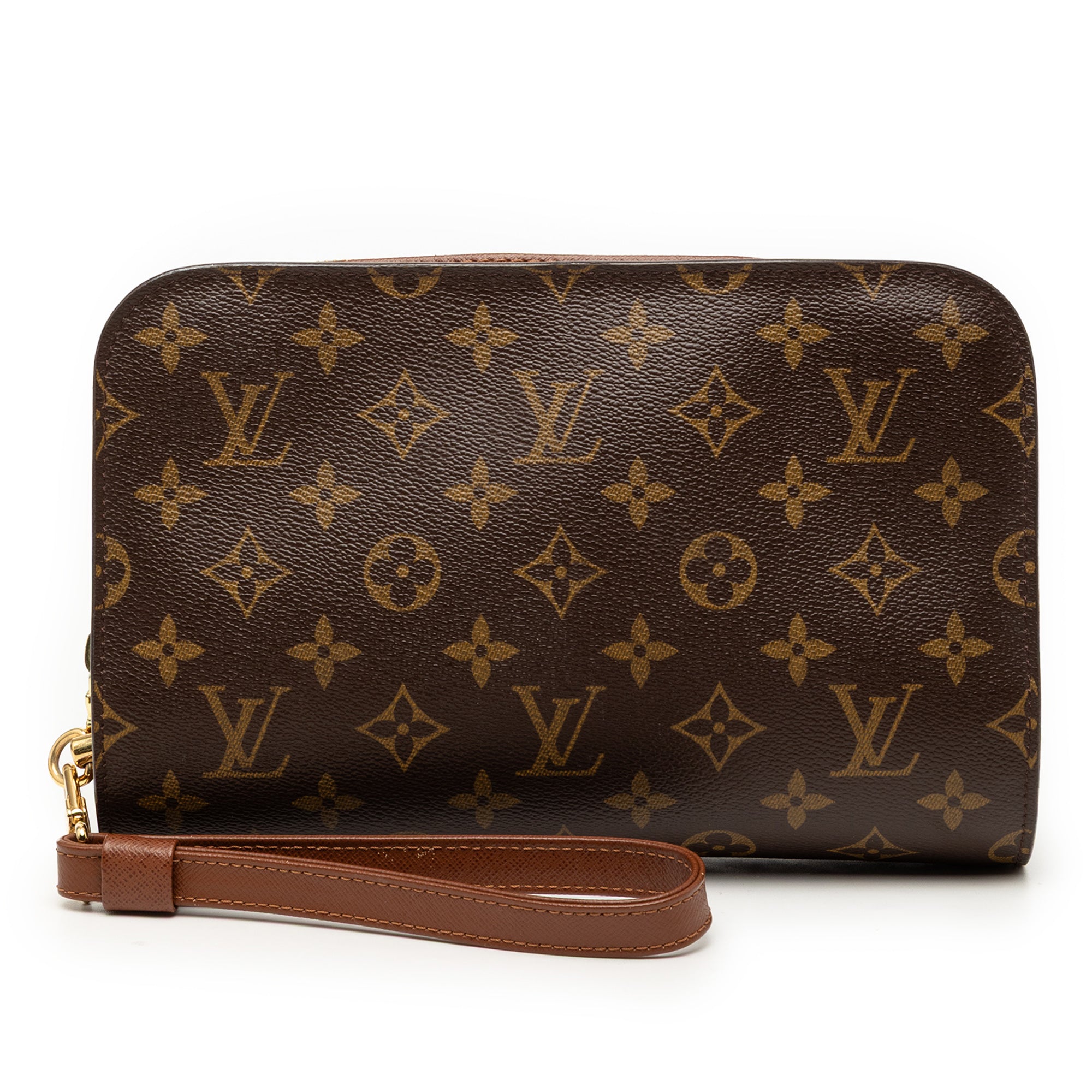 Product Details: Brown Louis Vuitton Monogram Orsay Clutch Bag. The Orsay features a monogram canvas body, a flat leather wrist strap, a zip around closure, and an interior slip pocket. 6.3" L x 9.4" W x 2.2" D, 8.3" drop. Serial number AR1006.