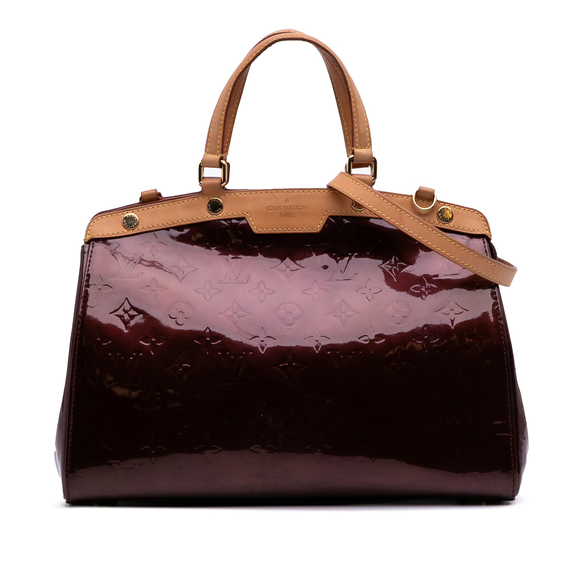 Product Details: Red Louis Vuitton Monogram Vernis Brea MM Satchel. The Brea MM features a vernis leather body with vachetta leather trim, flat vachetta leather top handles, a top zip closure, and interior zip and slip pockets. 9.8" L x 13" W x 4.7" D, 4.7" drop. Serial number V1111.