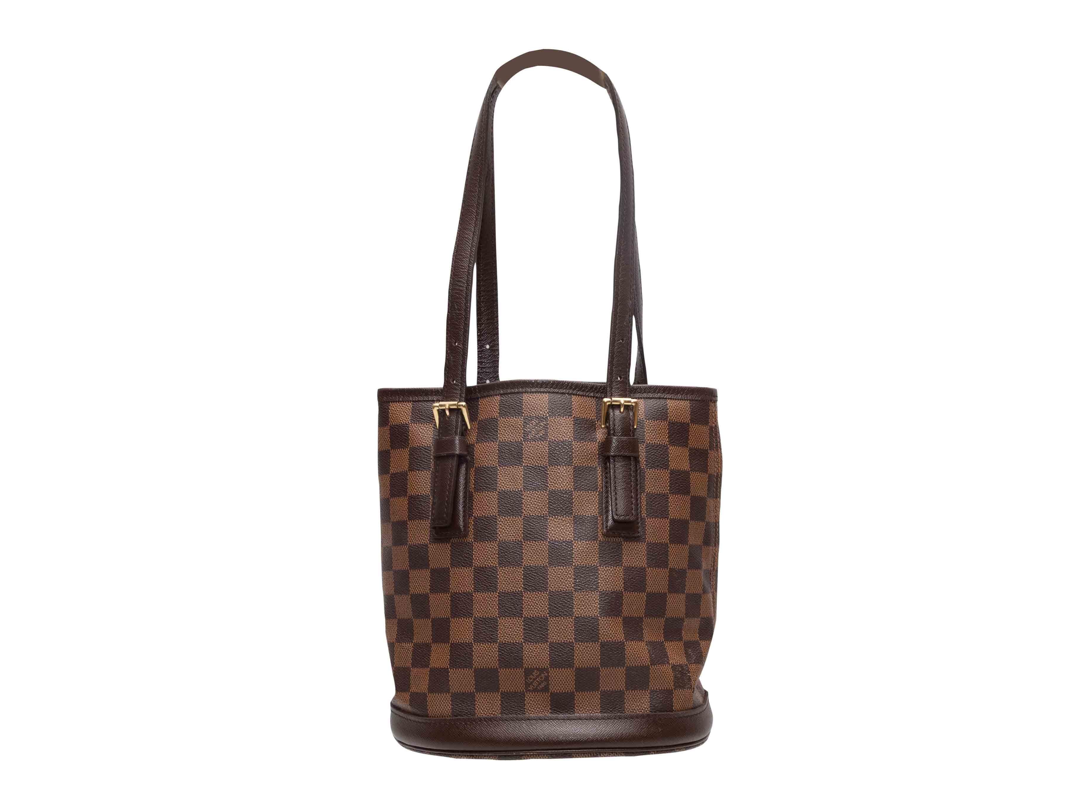 Product Details: Vintage Brown Louis Vuitton Damier Ebene Marais Bag. Circa 2003. This handbag features a coated canvas body, gold-tone hardware, dual flat shoulder straps, and an open top. 10" L x 9.5" H x 4" D, 9.5" shoulder strap drop.