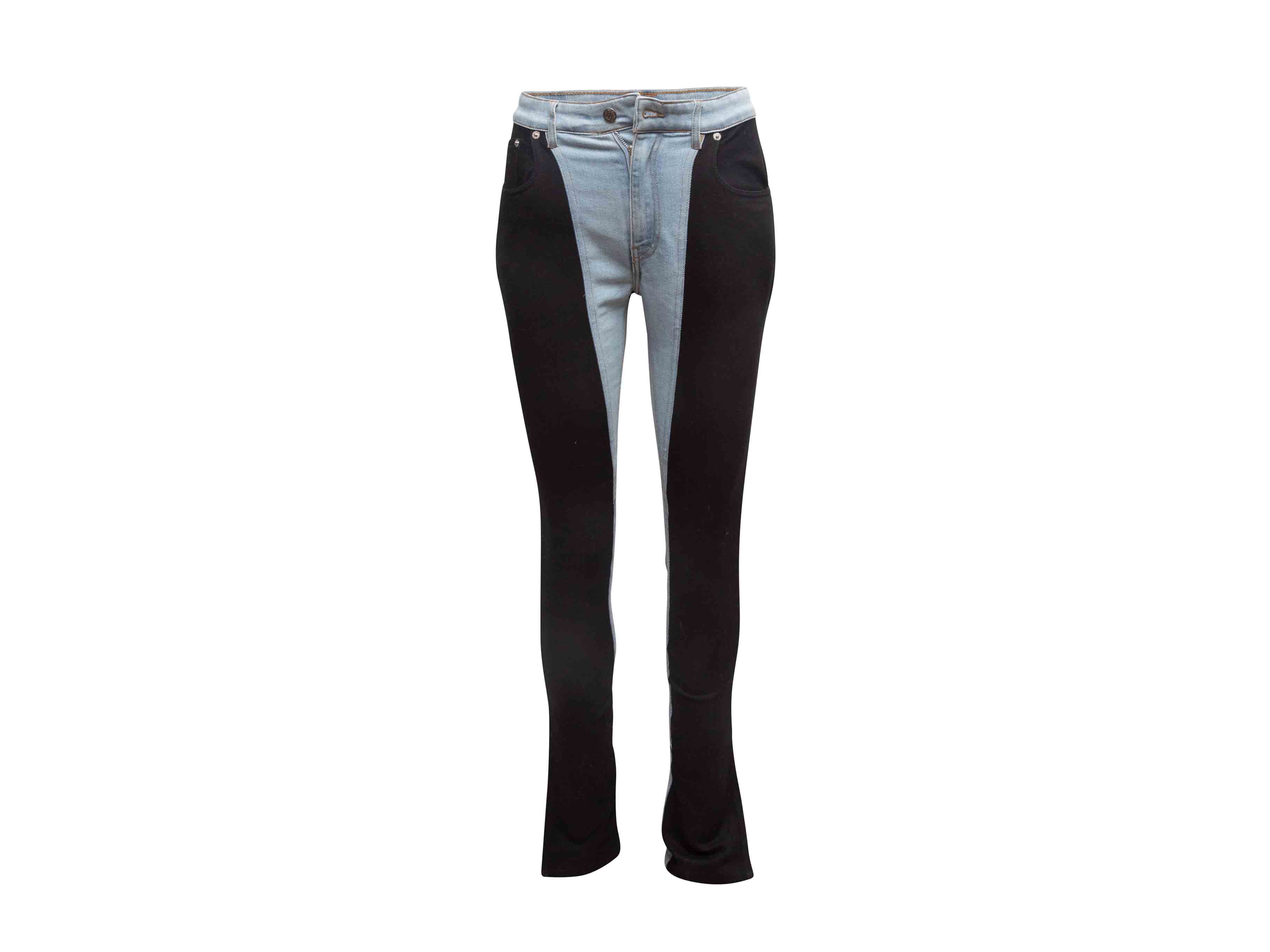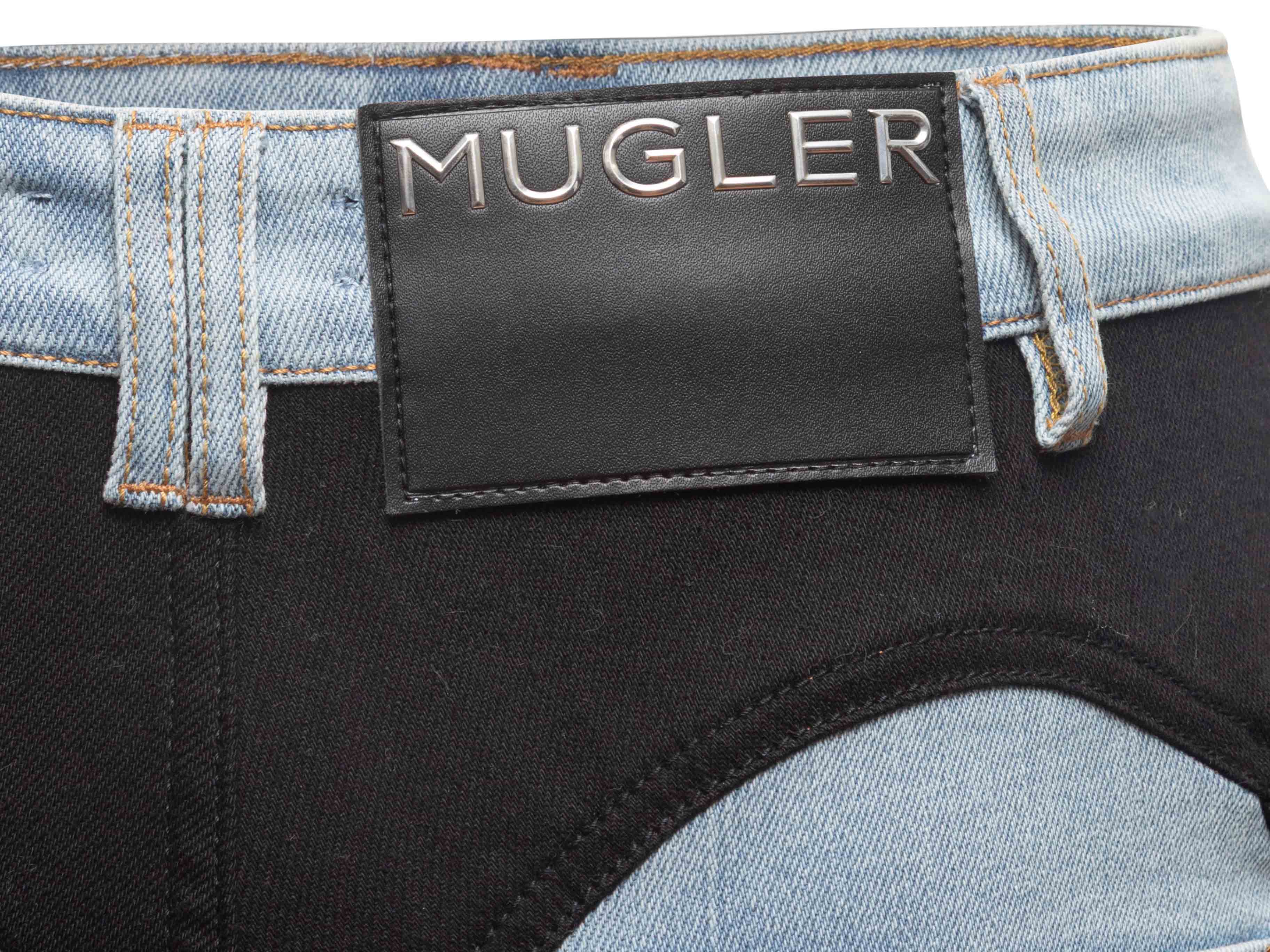 Product Details: Light wash and black two-tone denim jeans by Mugler. Five pockets. Zip and button closures at front. 27" waist, 30" hips, 32" inseam, 42" length.