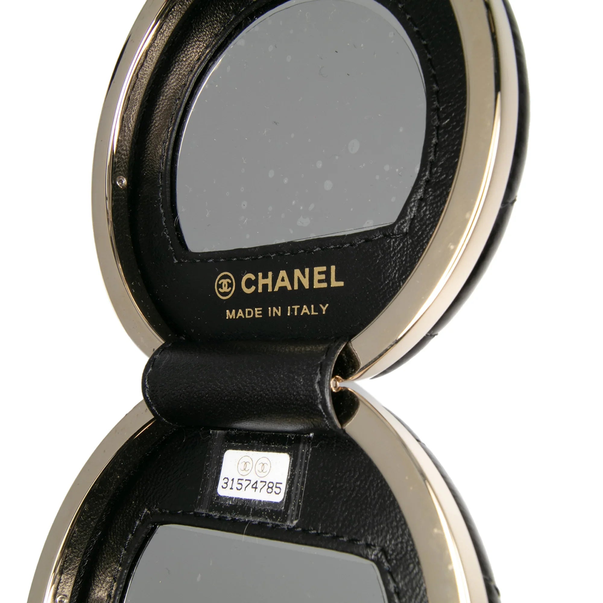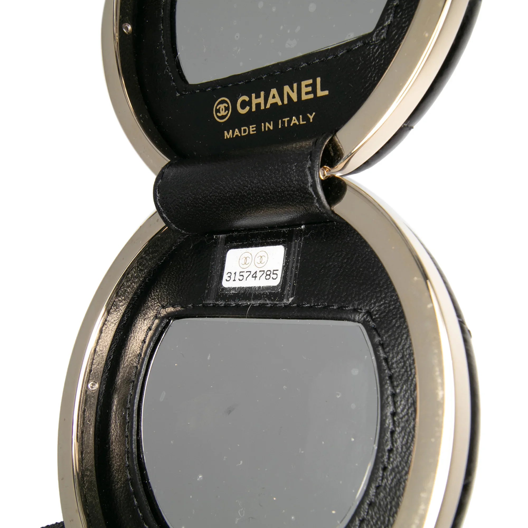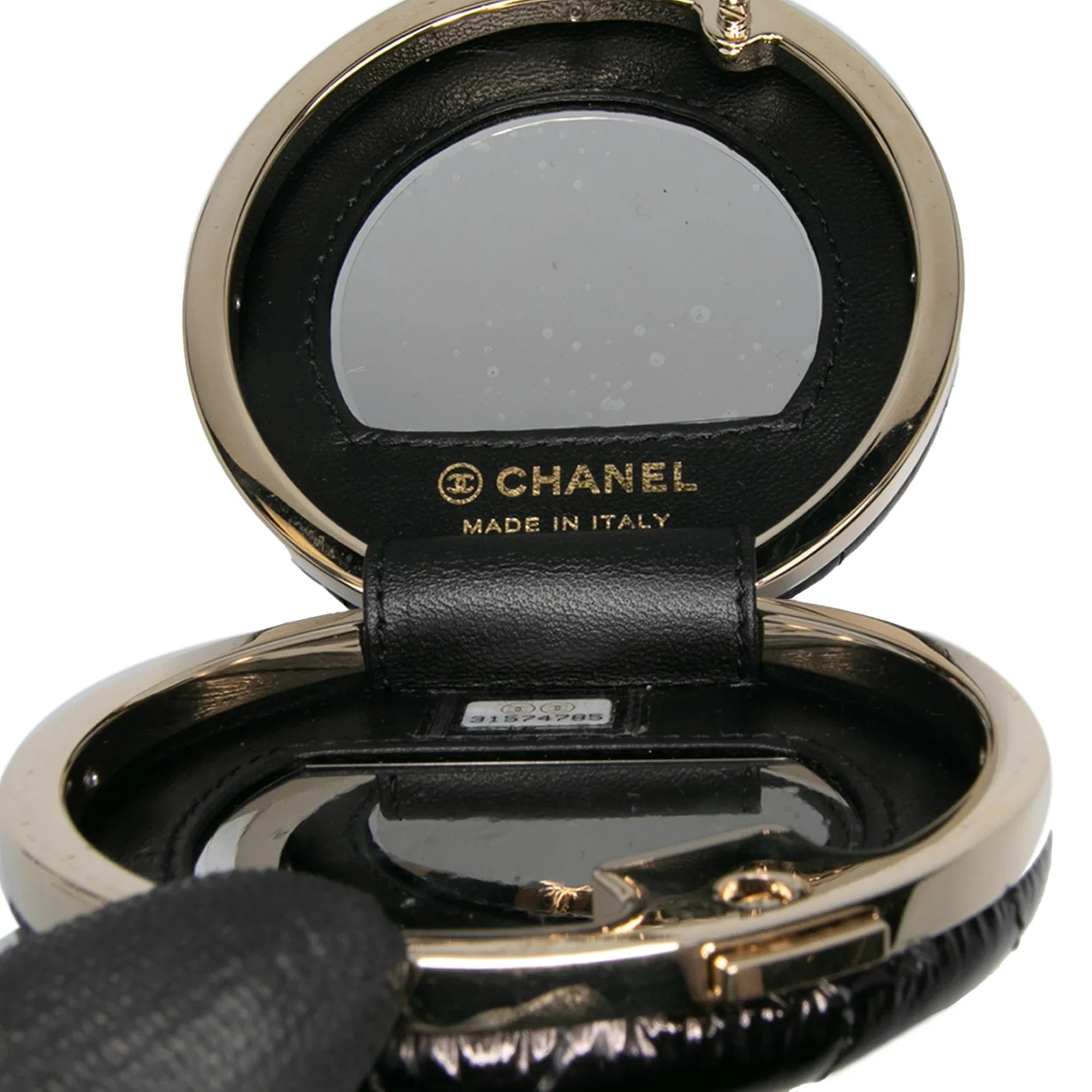 Product Details: Black Chanel Quilted Patent Round Mirror Chain Necklace. This accessory features a quilted patent leather body, a leather woven chain strap, a magnetic closure, and an interior mirror. 3" L x 3.1" W x 1" D. Serial number 31574785.