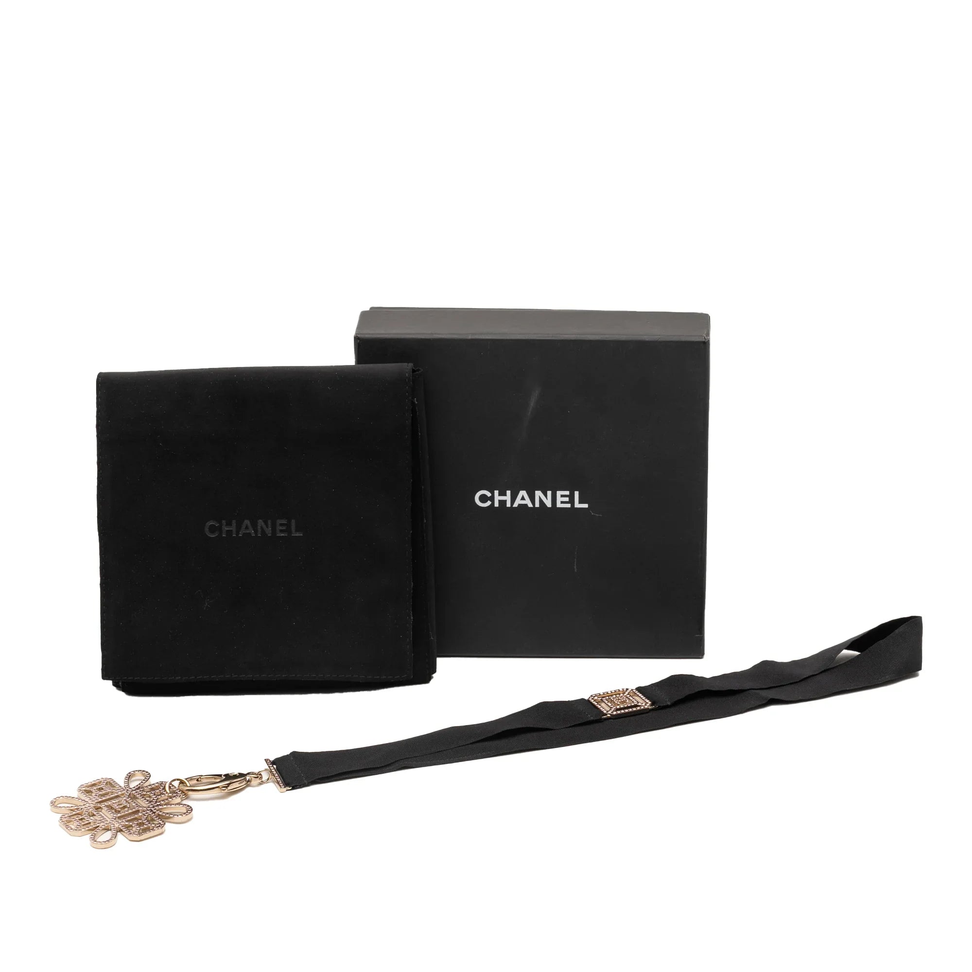 Product Details: Gold Chanel Gold Plated Rhinestones Embellished Snowflake Pendant Necklace. This necklace features a gold-tone metal pendant with rhinestone embellishments, and a grosgrain lace with lobster clasp attachment. 26.4" L x 3.9" W x 0" D. Serial number B17S.