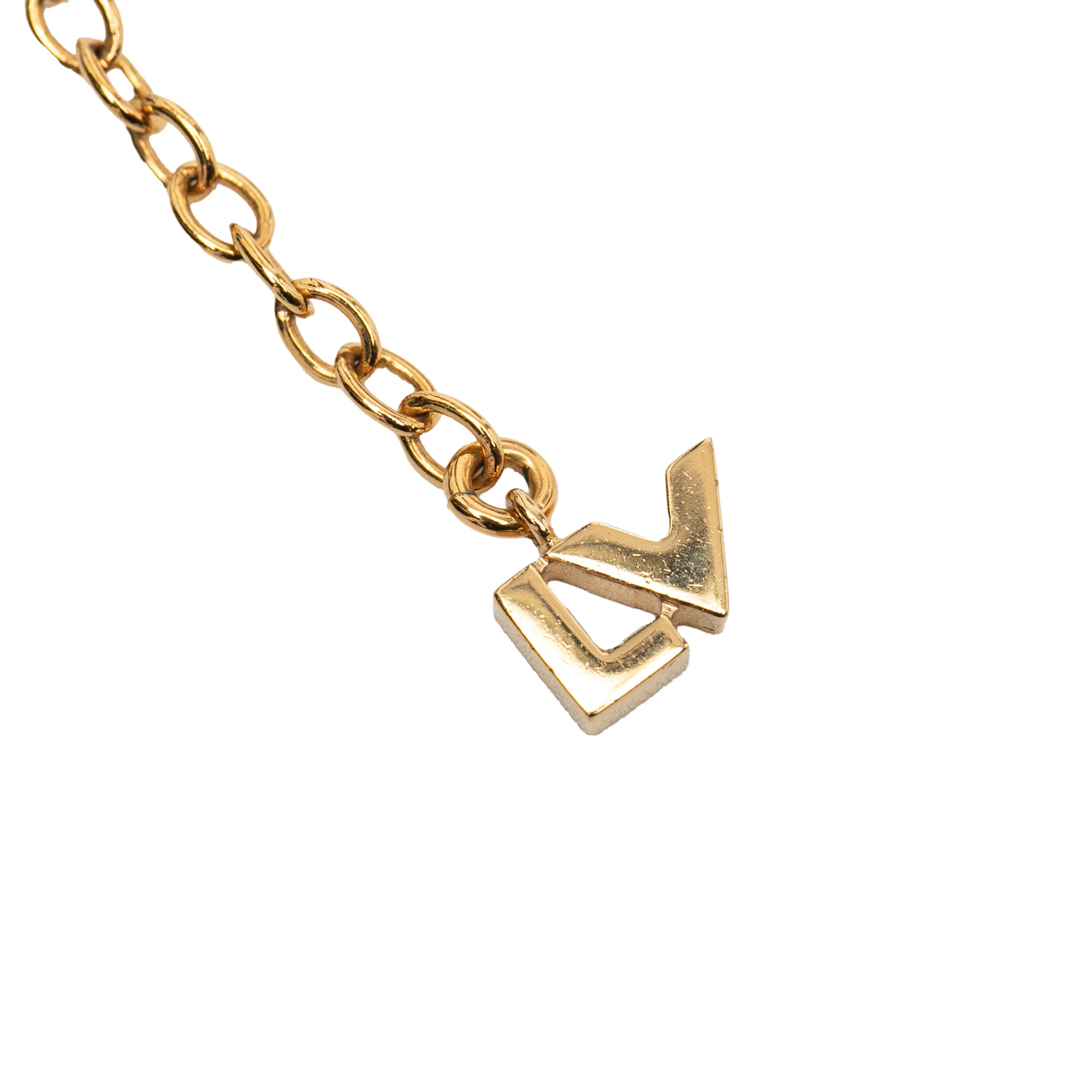 Product Details: Gold Louis Vuitton Gold Plated Rhinestones Love Letters Necklace. This necklace features a gold-tone chain, gold-tone with rhinestones LV pendants, and a lobster claw closure. 22.4" L x 0.8" W x 0" D. Serial number LE0113.