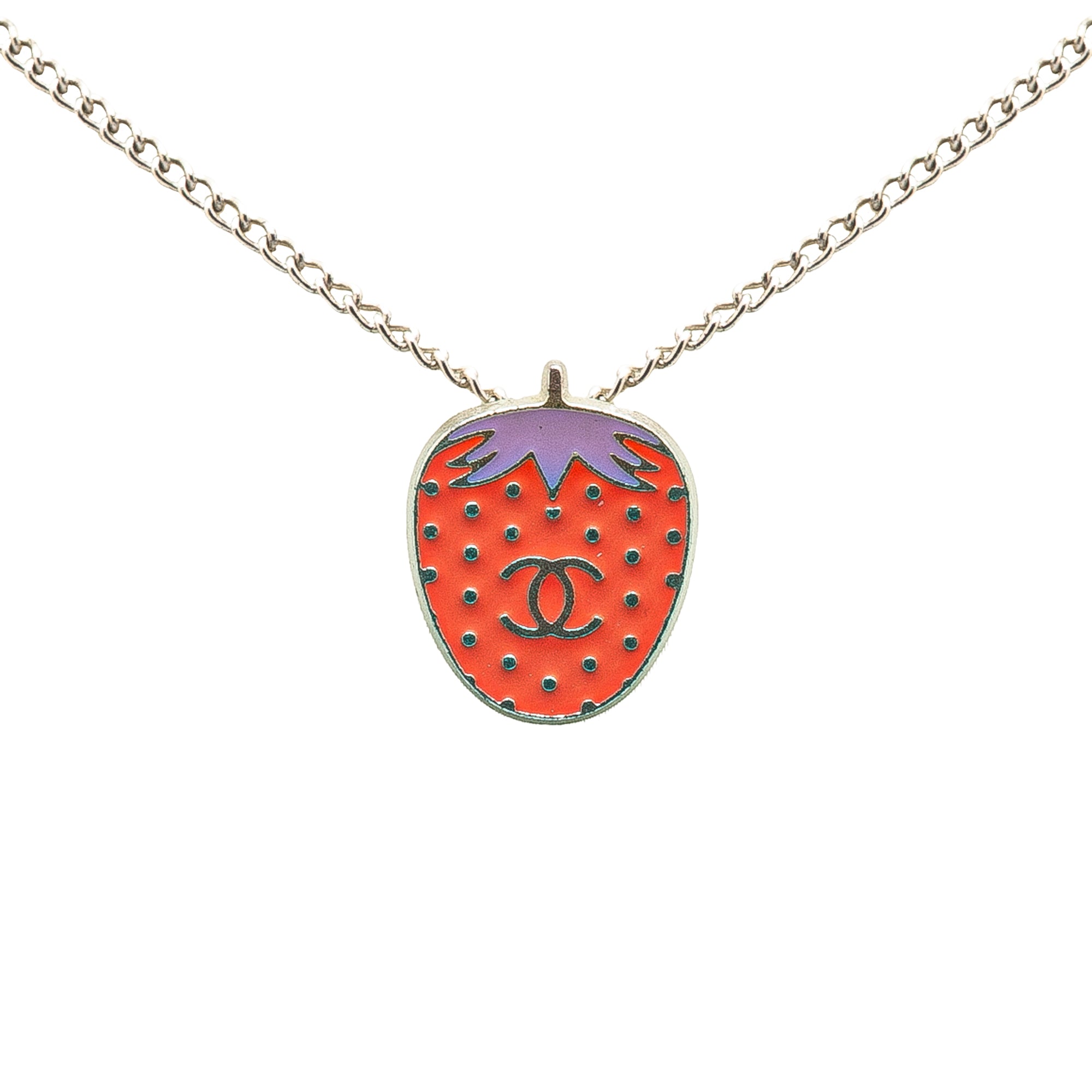 Product Details: Silver Chanel Silver Plated Enamel CC Strawberry Charm Pendant Necklace. This necklace features a silver-tone body, an enamel strawberry charm pendant, and a lobster claw closure. 16.5" L x 0.8" W x 0" D. Serial number 04P.