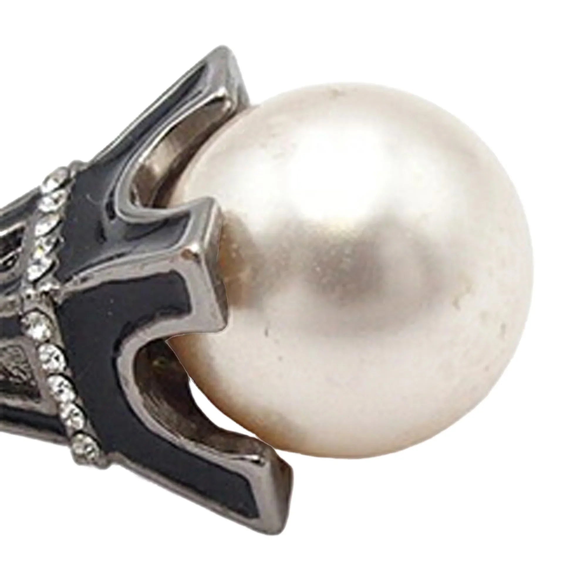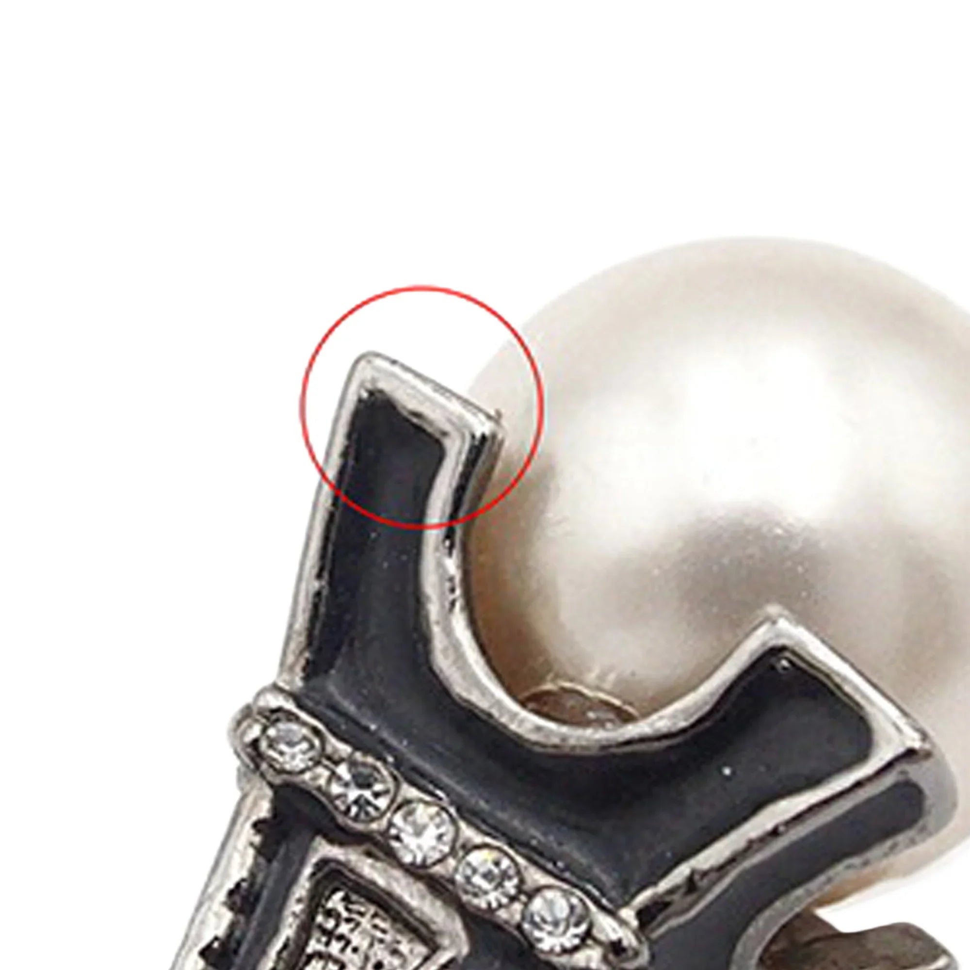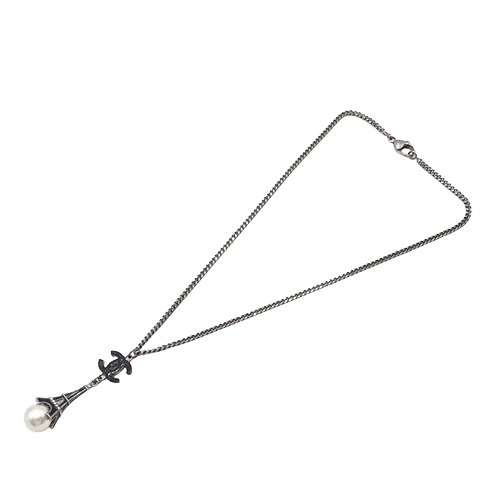 Silver Chanel Silver Plated Faux Pearl Enamel CC Eiffel Tower Charm Necklace