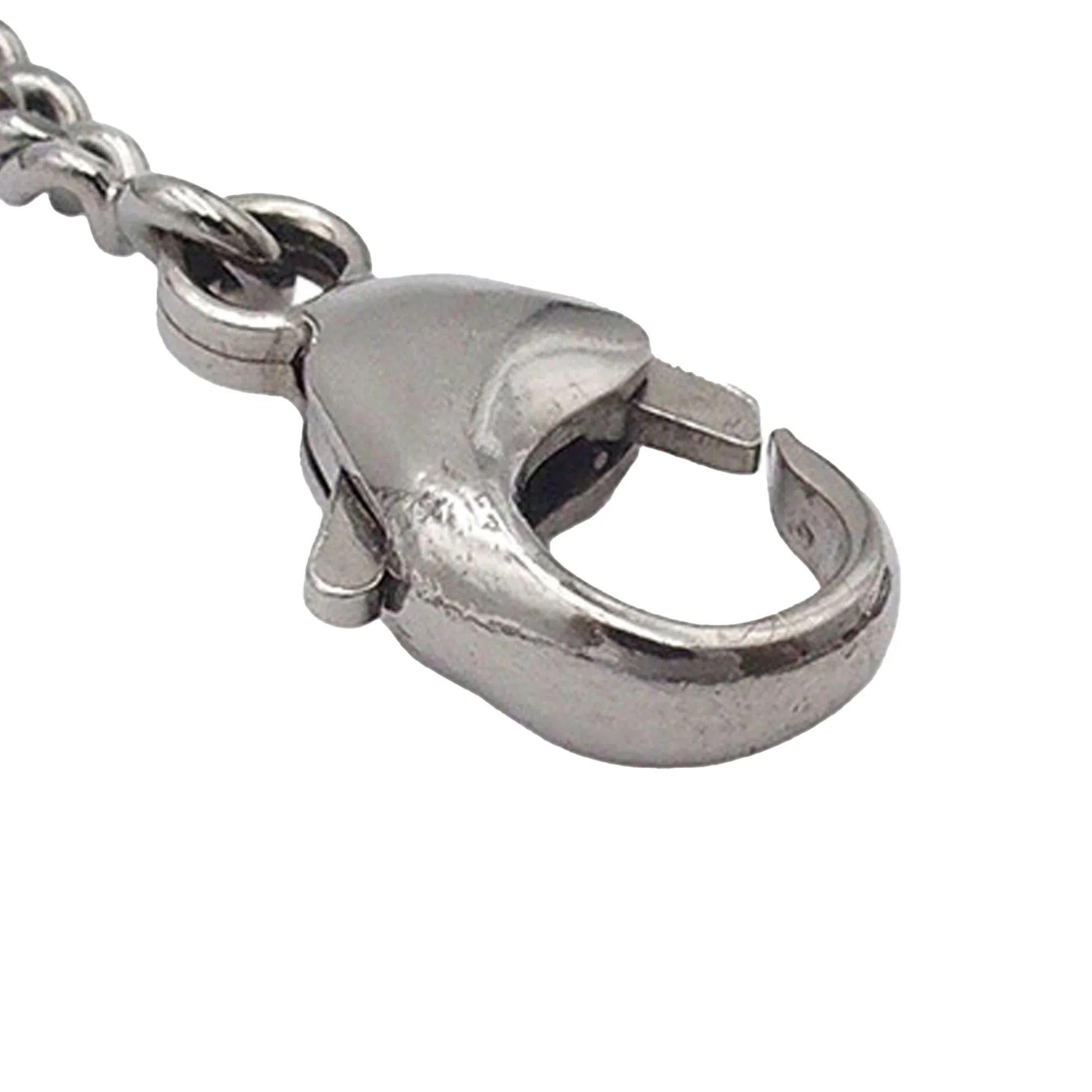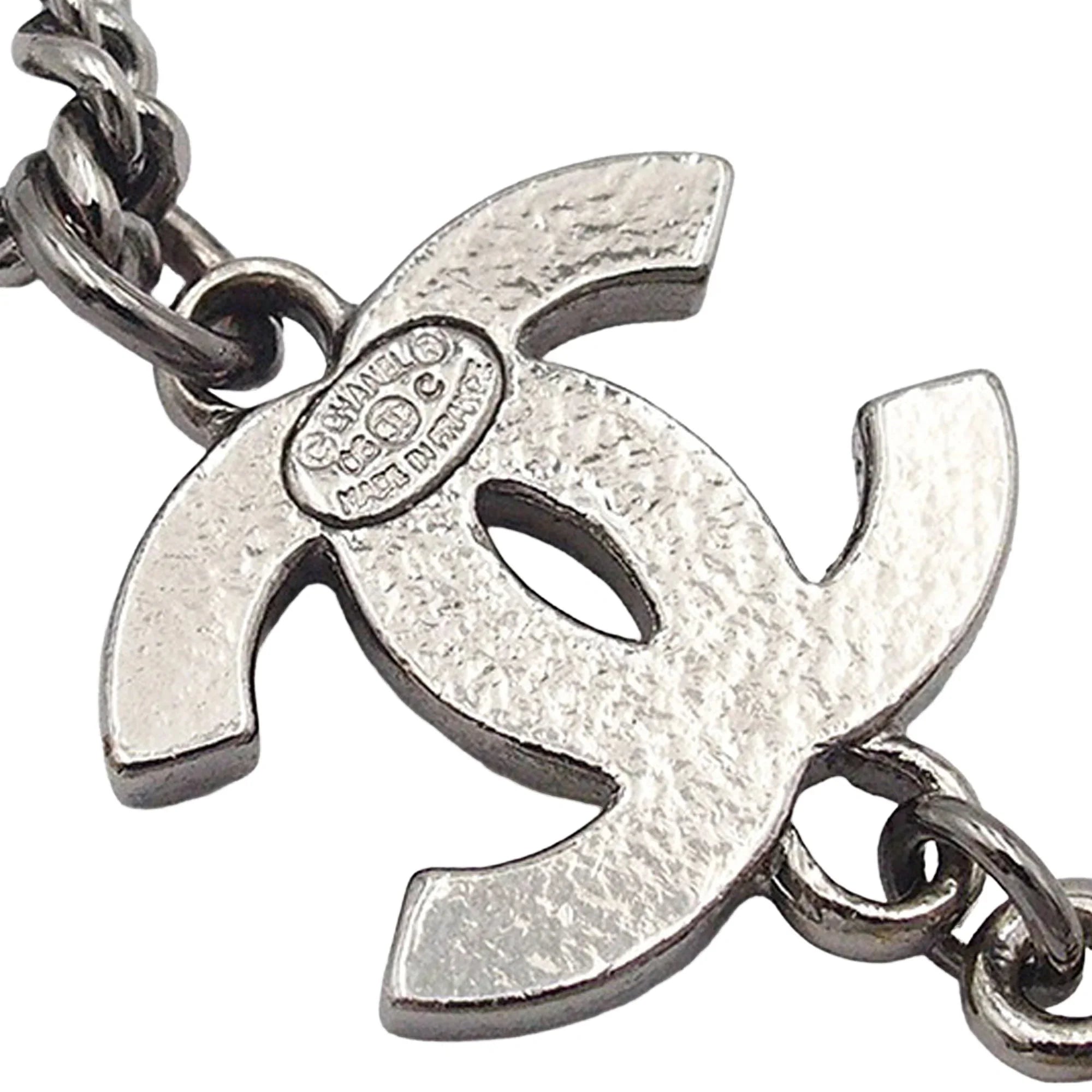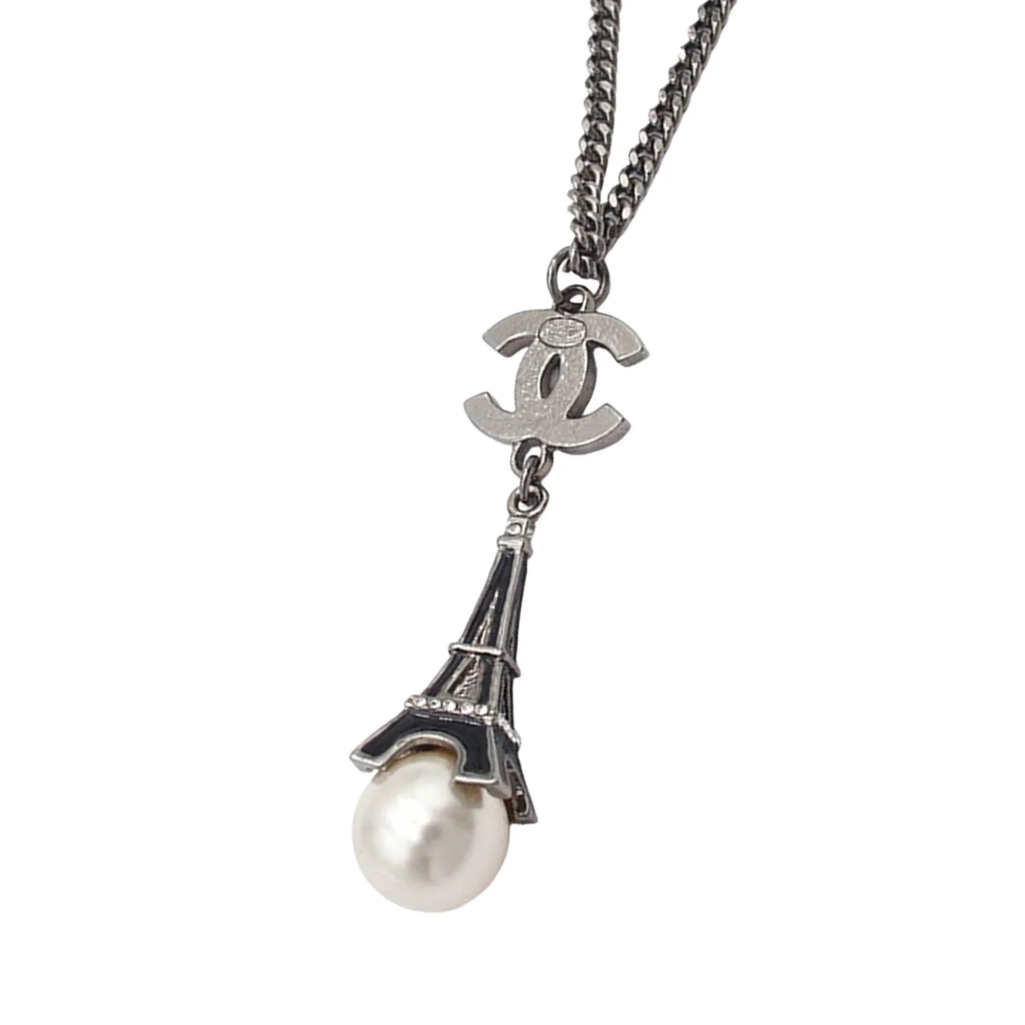 Product Details: Silver Chanel Silver Plated Faux Pearl Enamel CC Eiffel Tower Charm Necklace. This necklace features a silver-tone chain, a faux pearl, and a lobster clasp closure. 17.1" L x 6.3" W x 0" D. Serial number 06C.