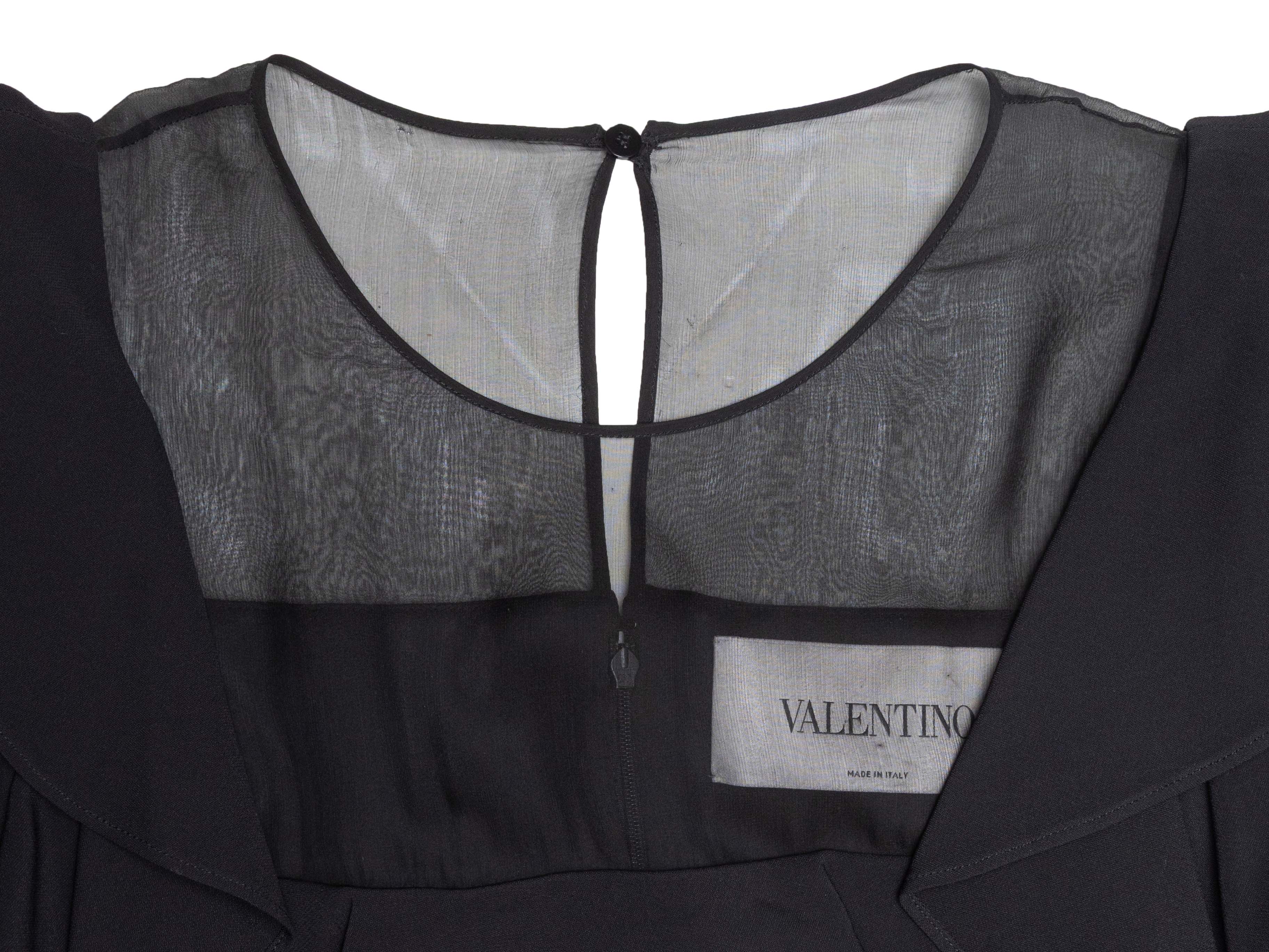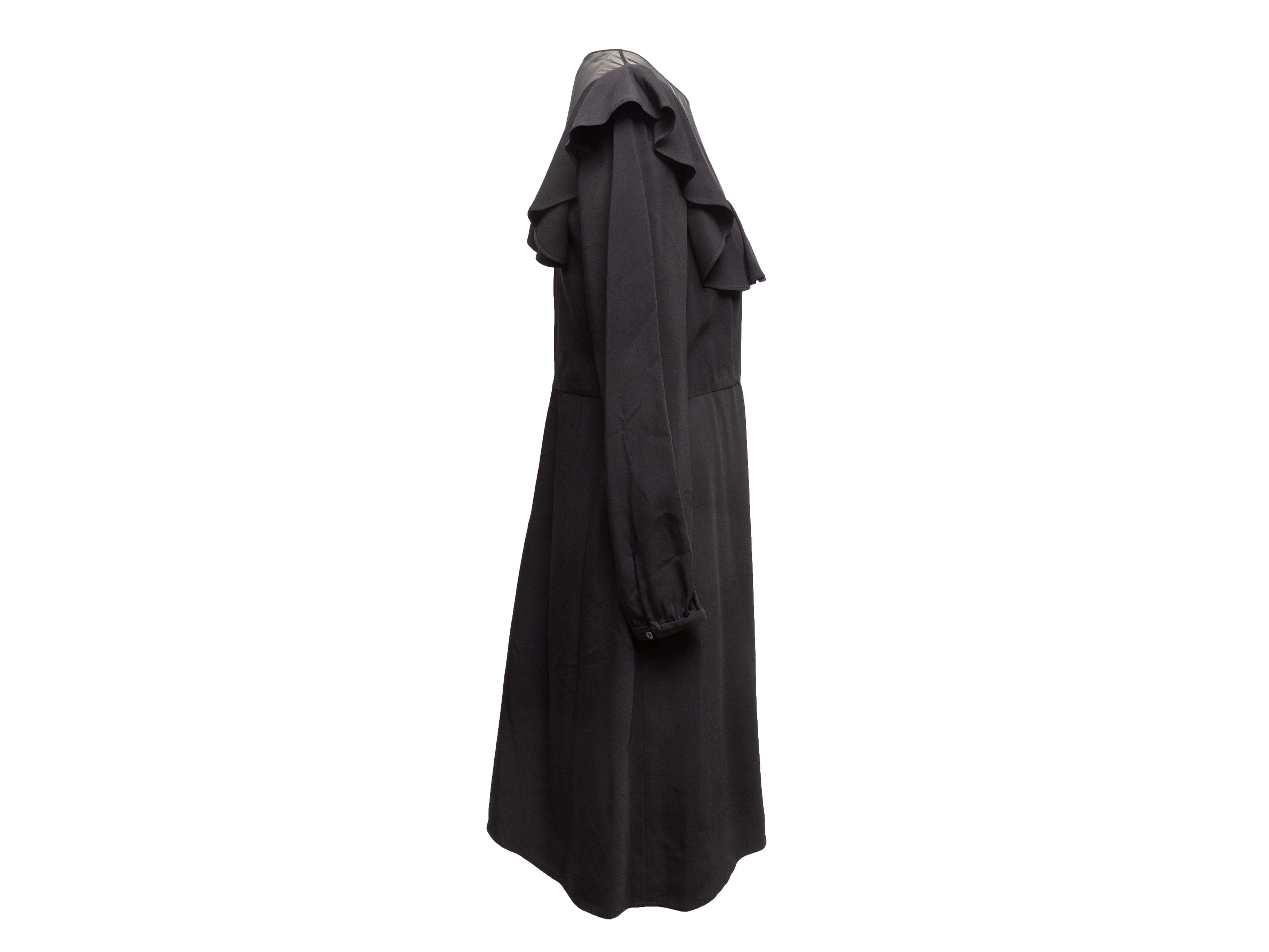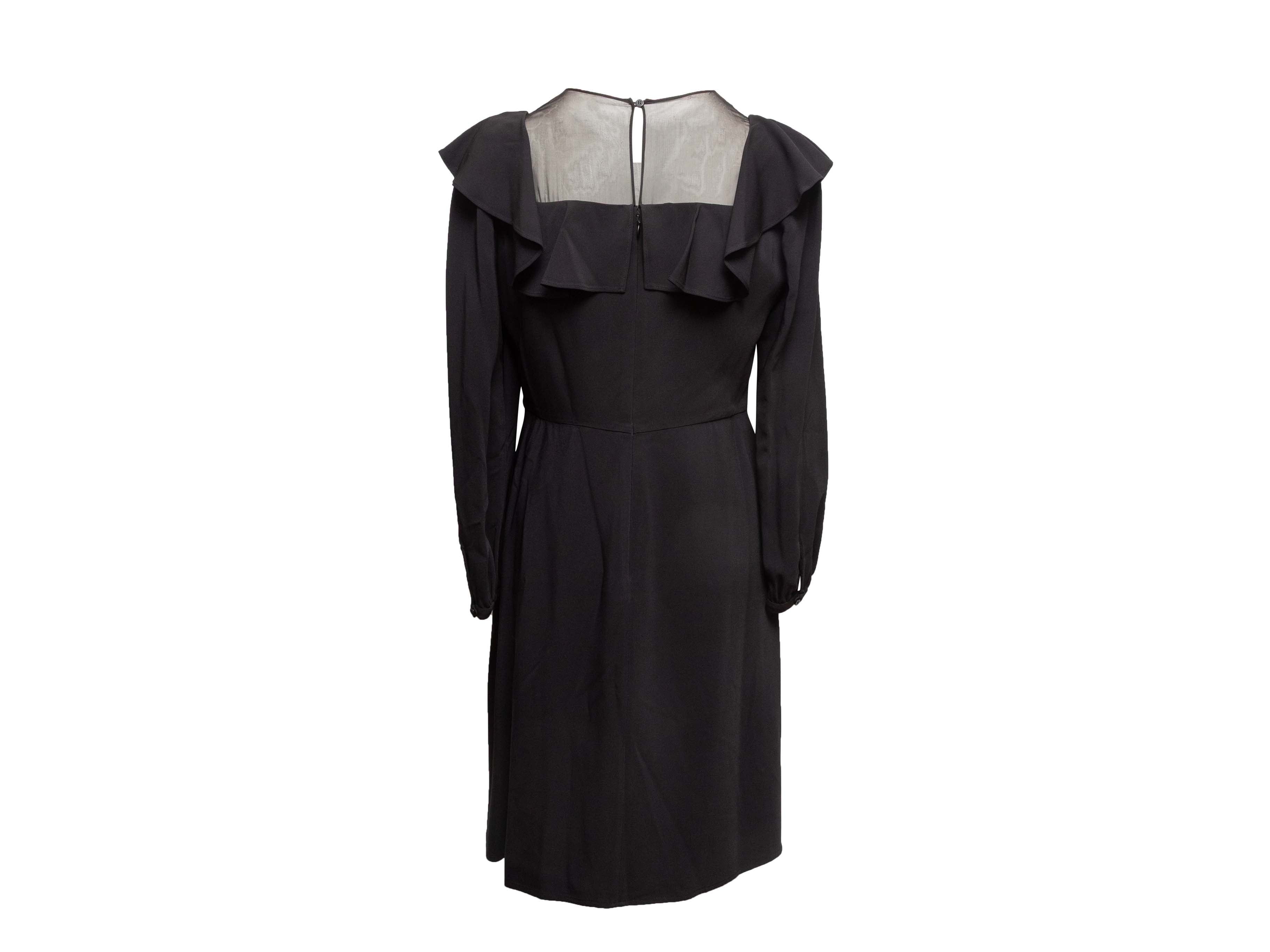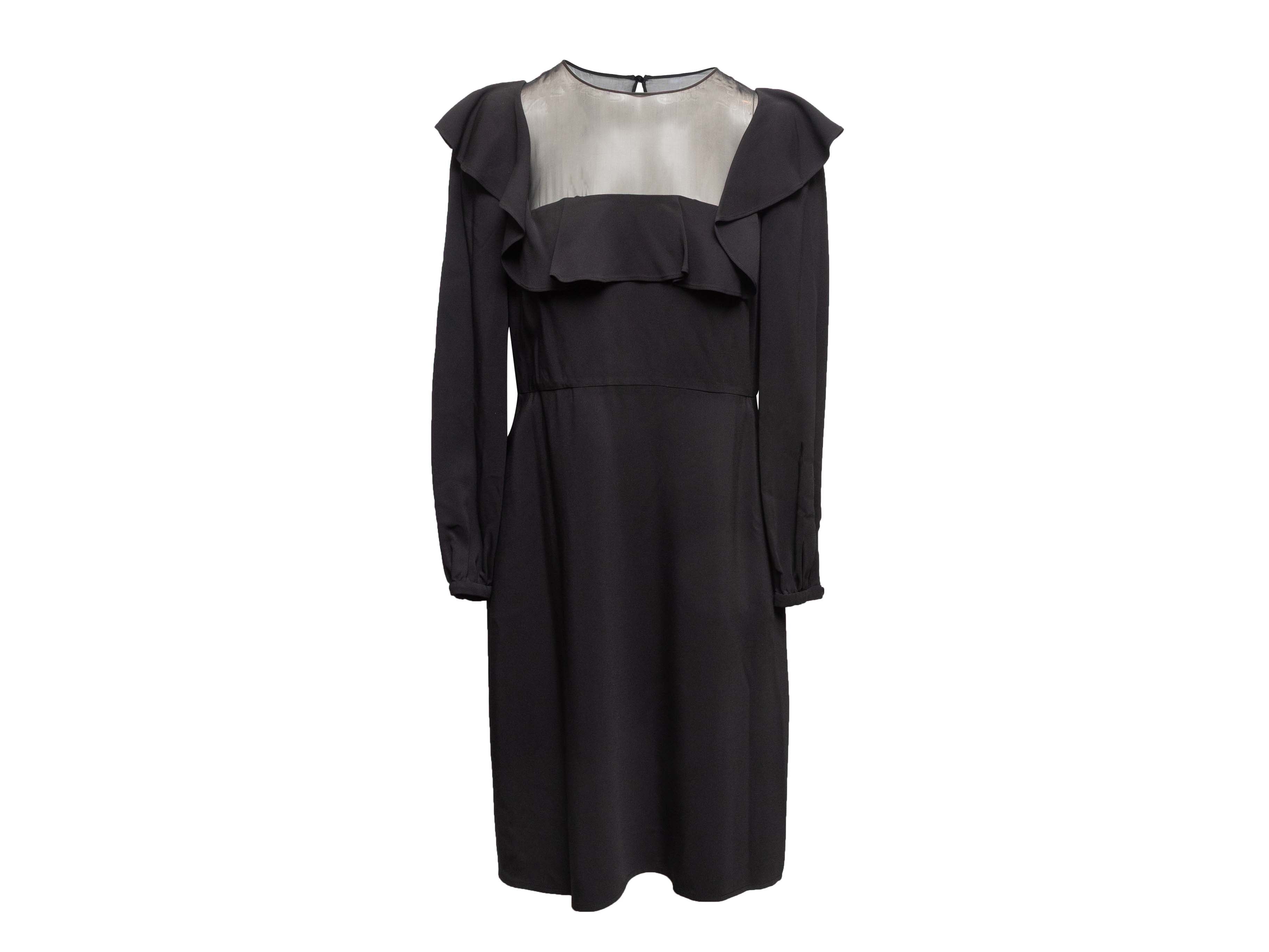 Product Details: Black long sleeve ruffle-trimmed dress by Valentino. Crew neck. Sheer panel at bust. Zip and nape closures at back. 36" bust, 32" waist, 39" length, 12" shoulder width.