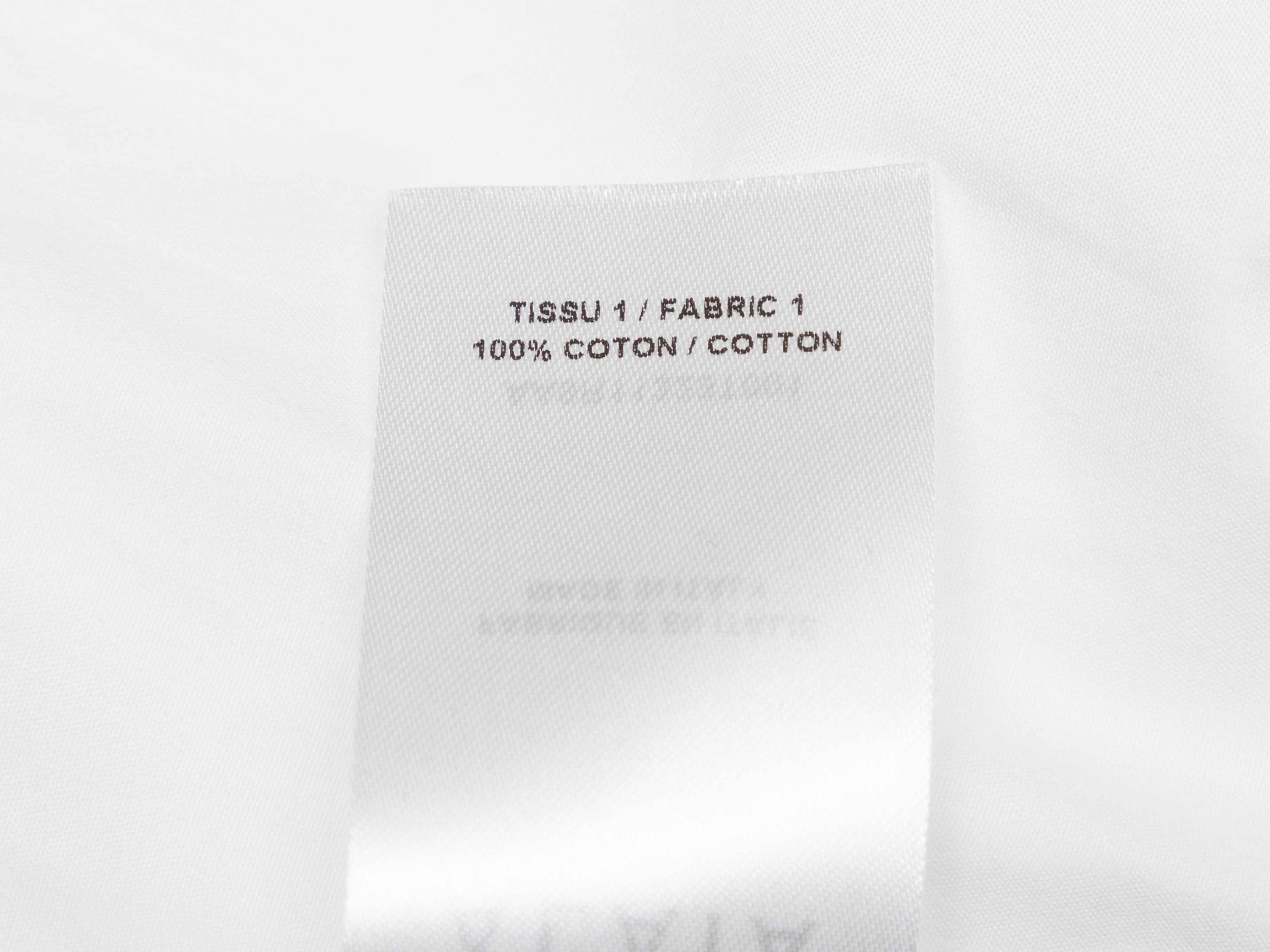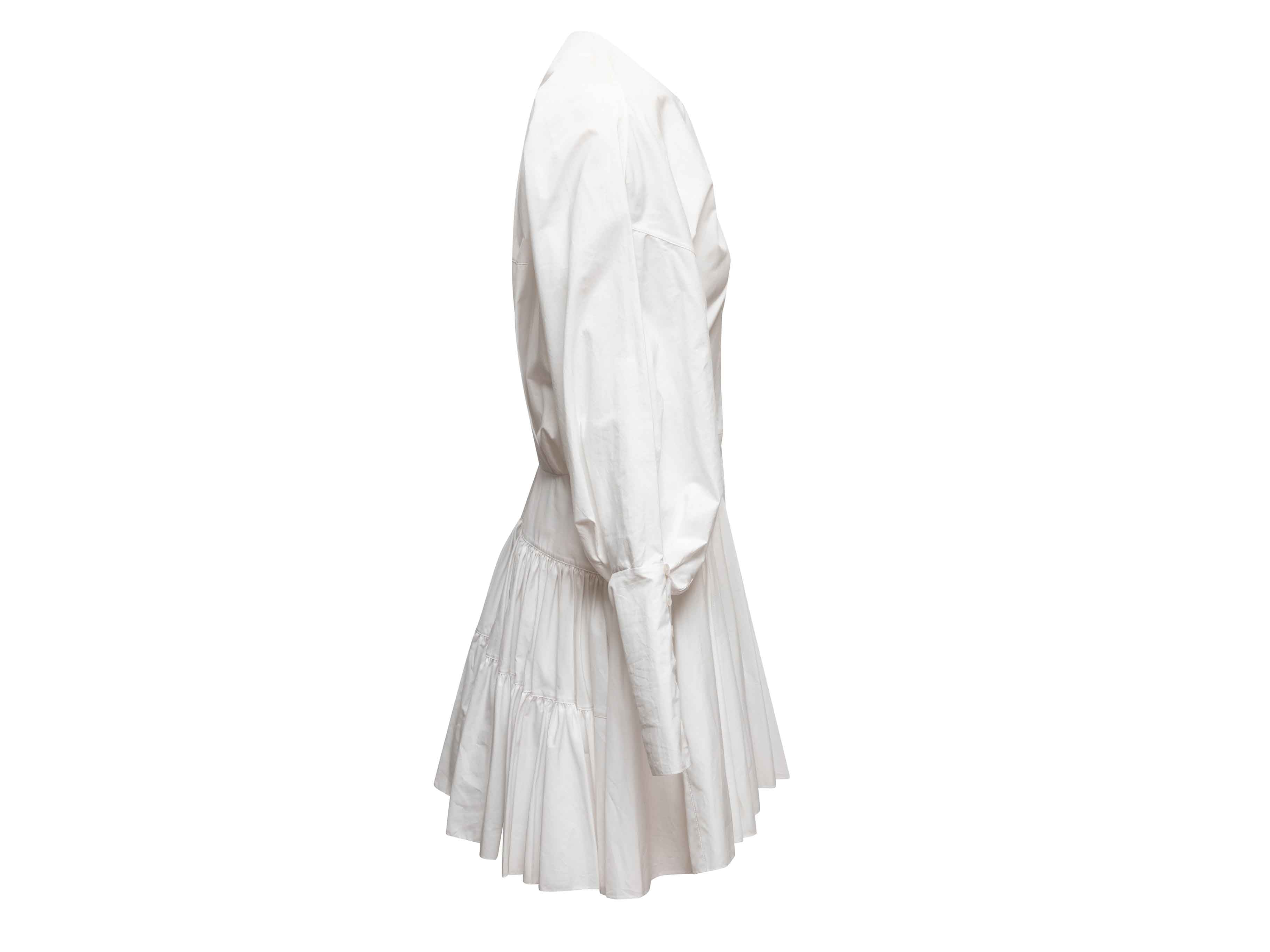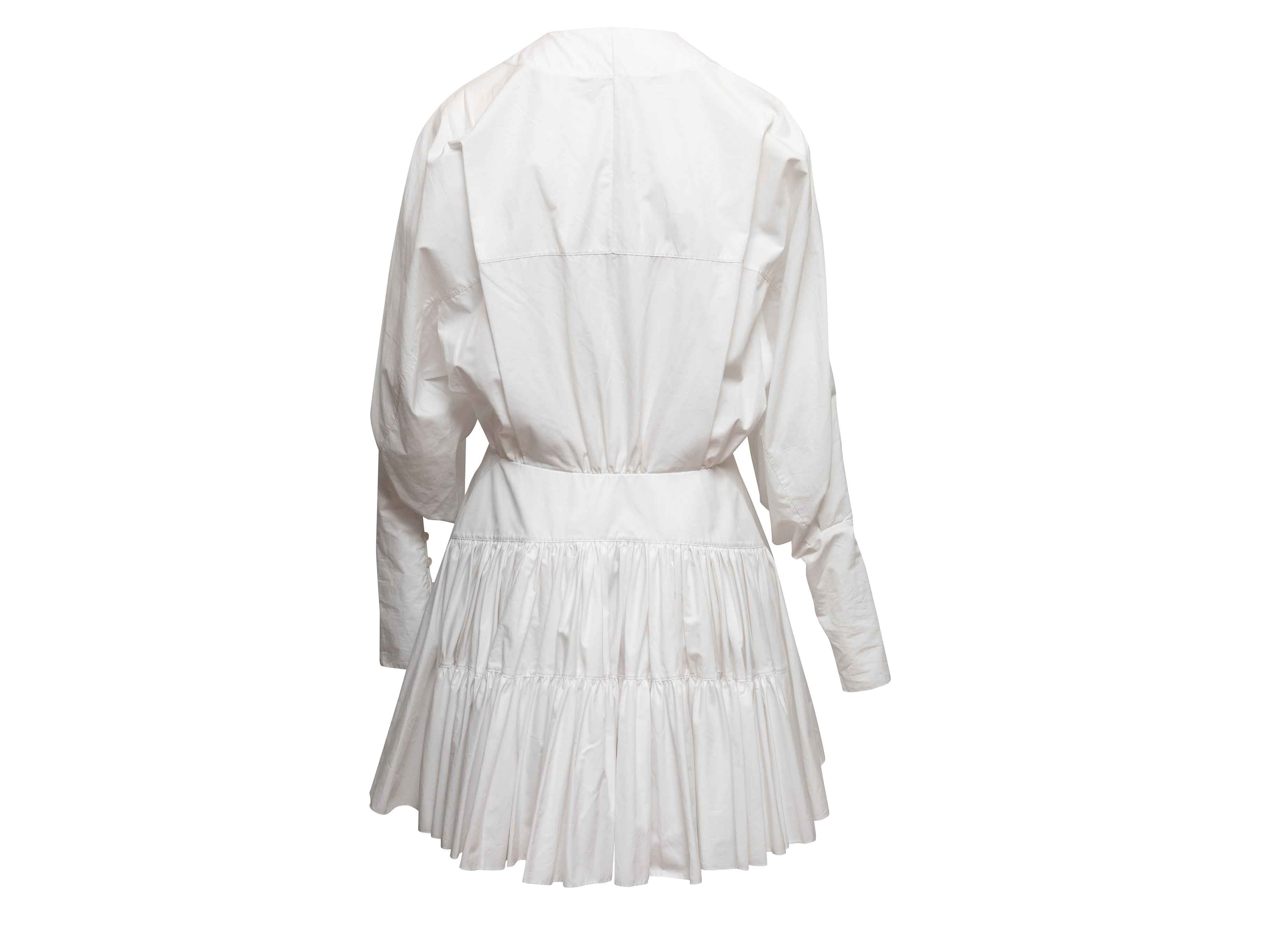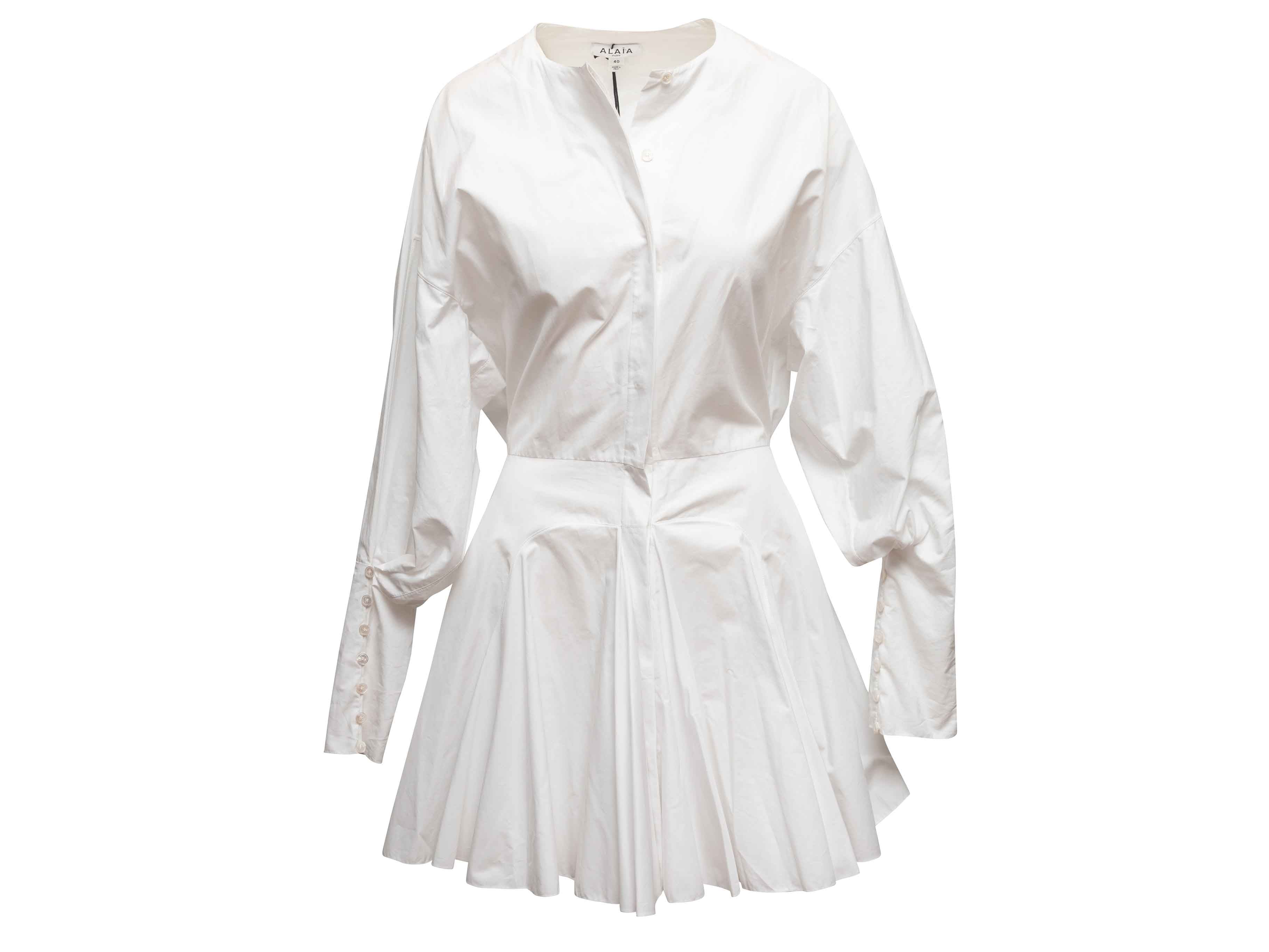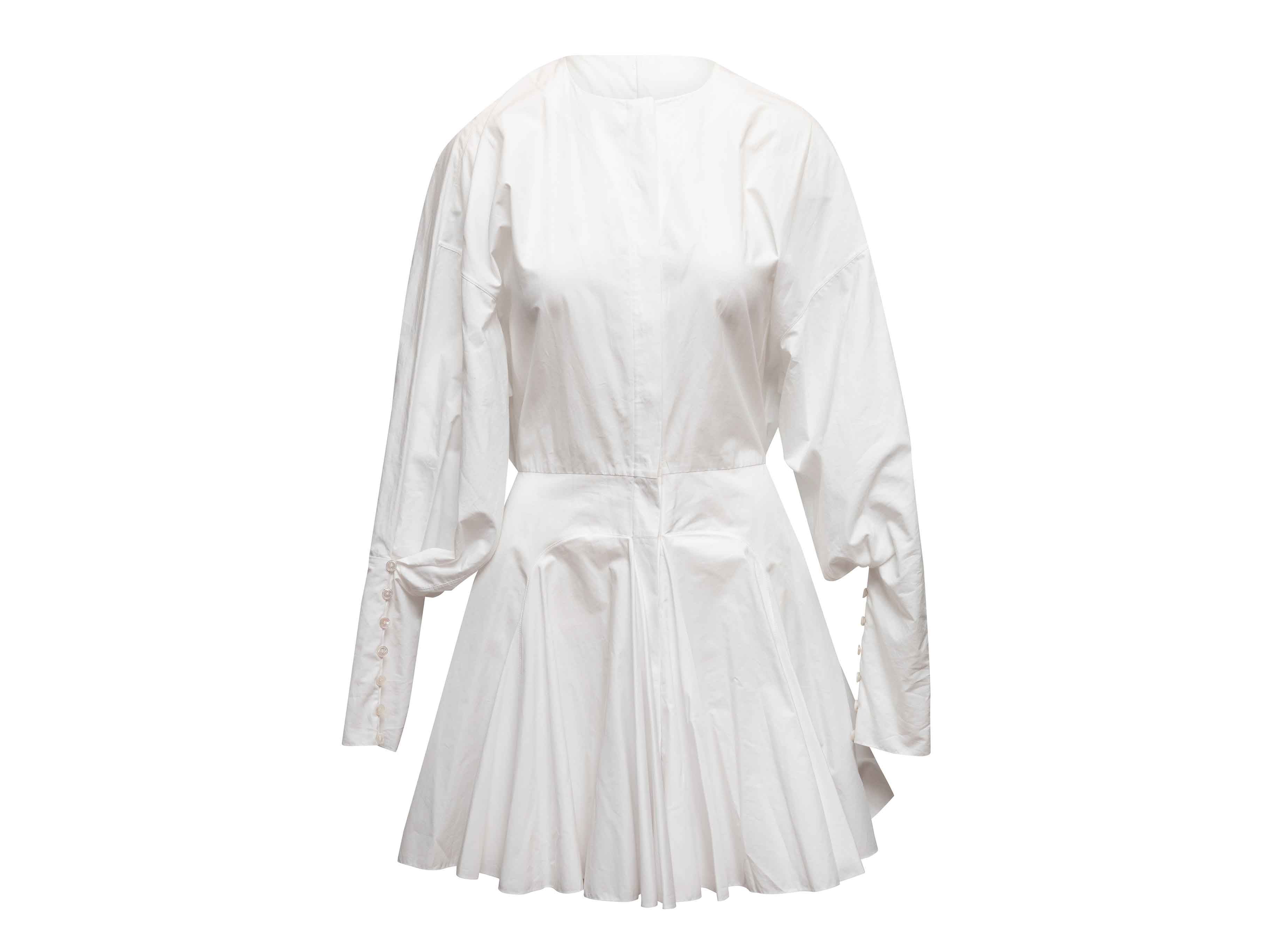Product Details: White cotton long sleeve mini dress by Alaia. Crew neck. Pleating at skirt. Button closures at front. 36" bust, 28" waist, 35" length, 23" shoulder width.
