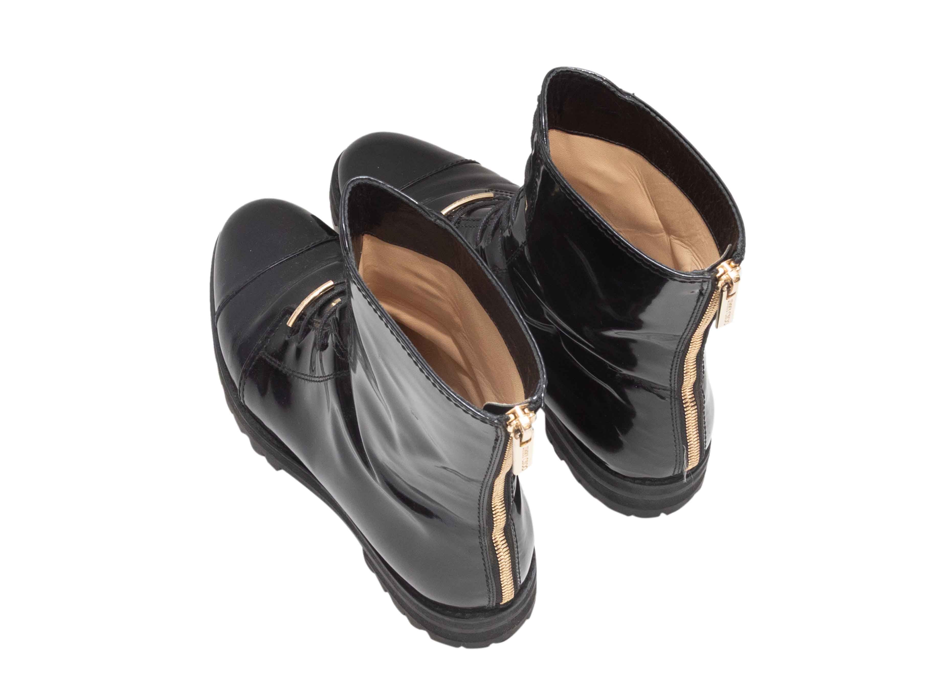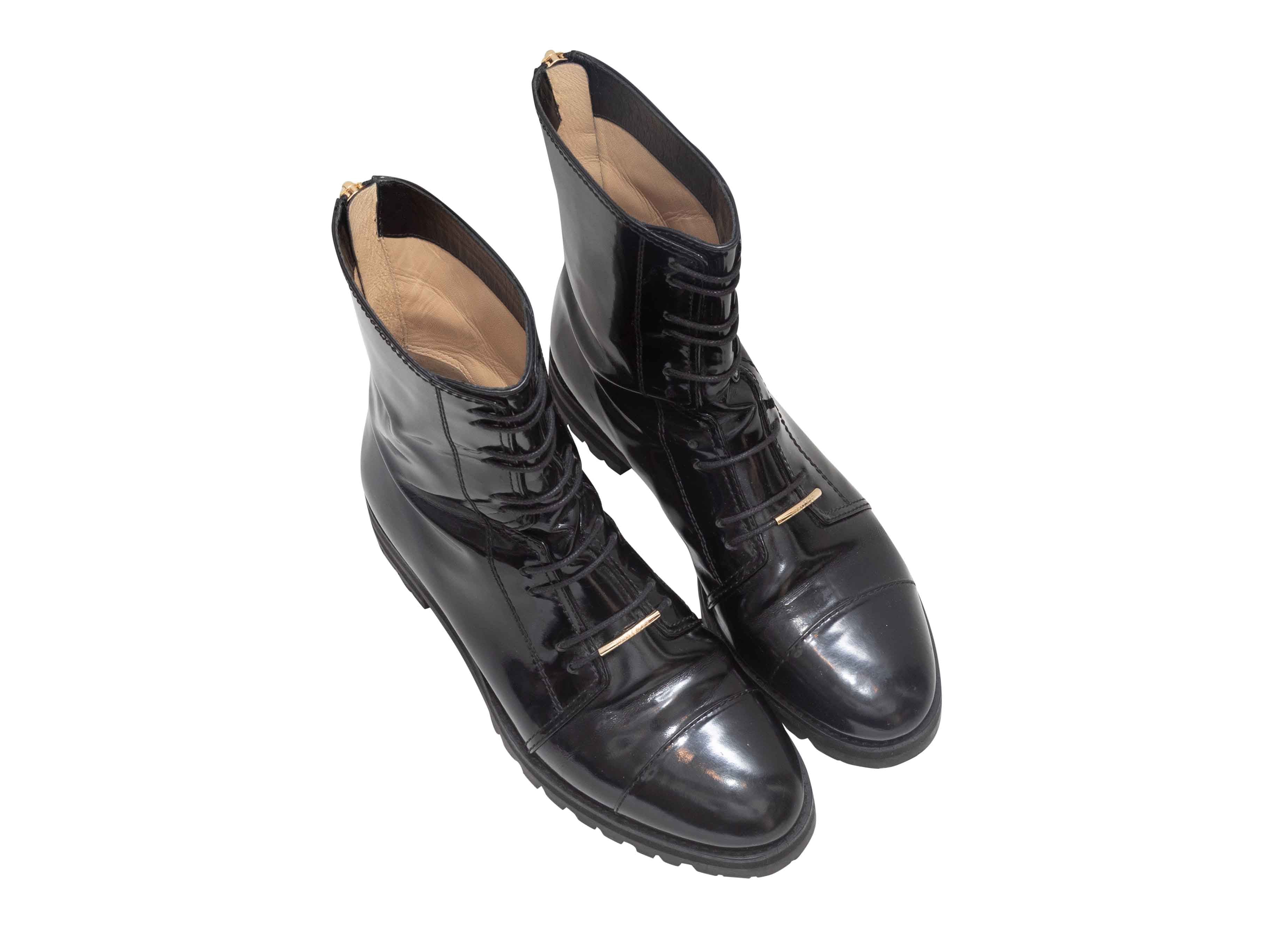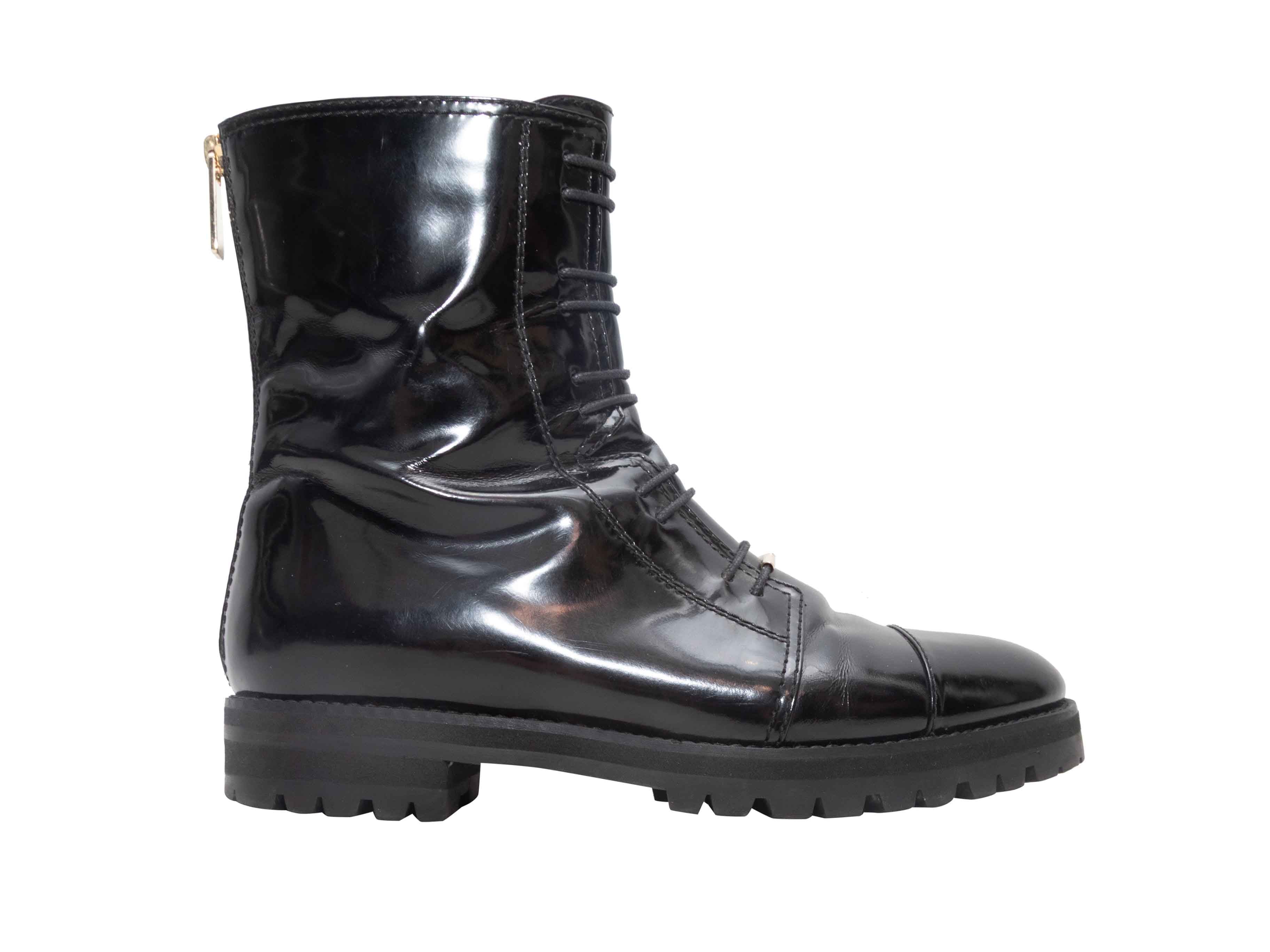 Product Details: Black patent leather combat boots by Jimmy Choo. Lace-up tie accents at tops. Lug soles. Zip closures at counters. 7" shaft height, 0.75" platform height, 1.75" heel height.