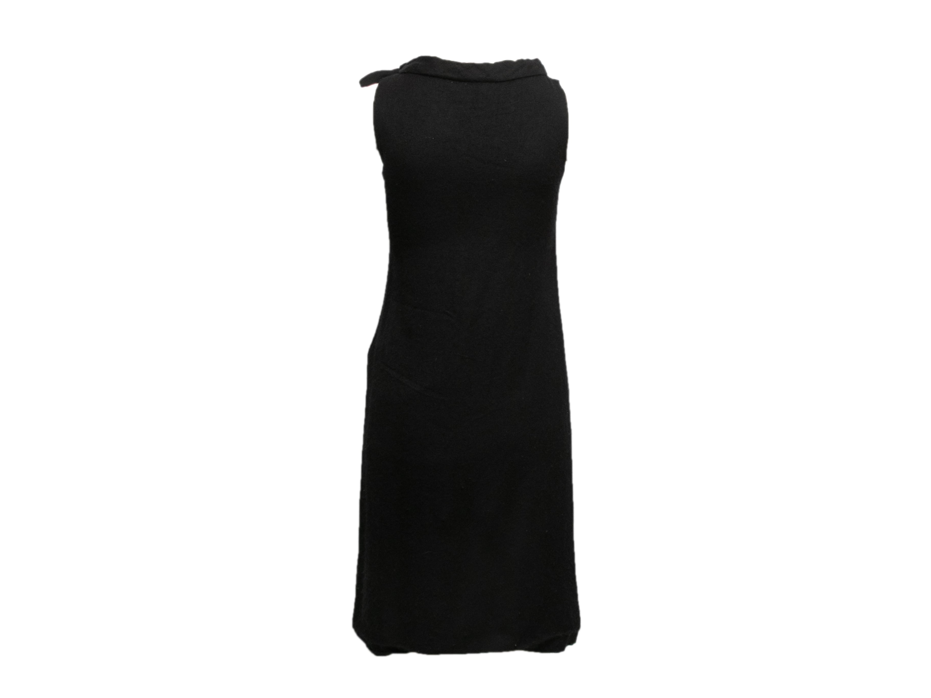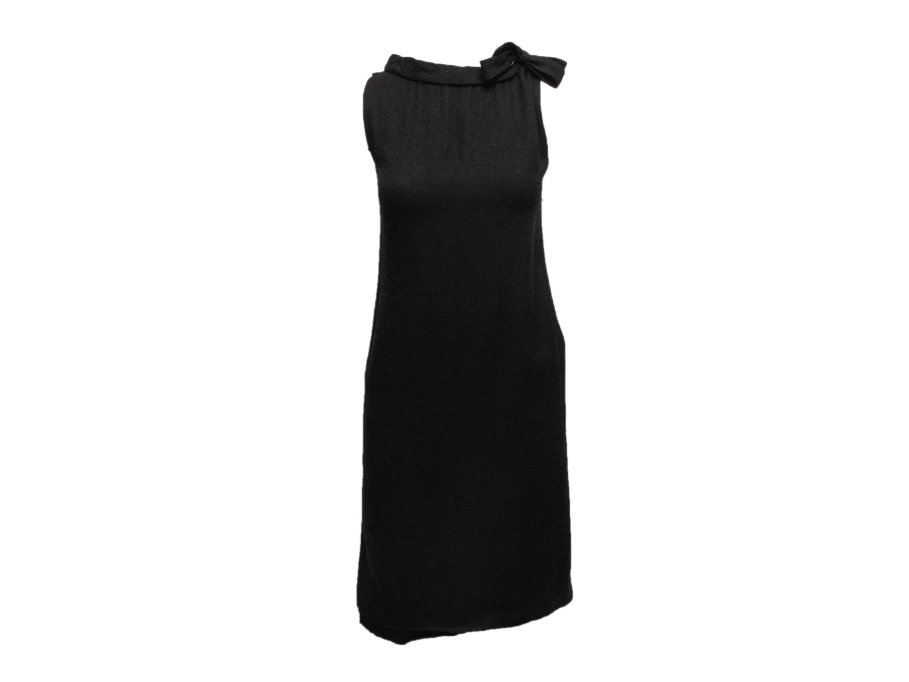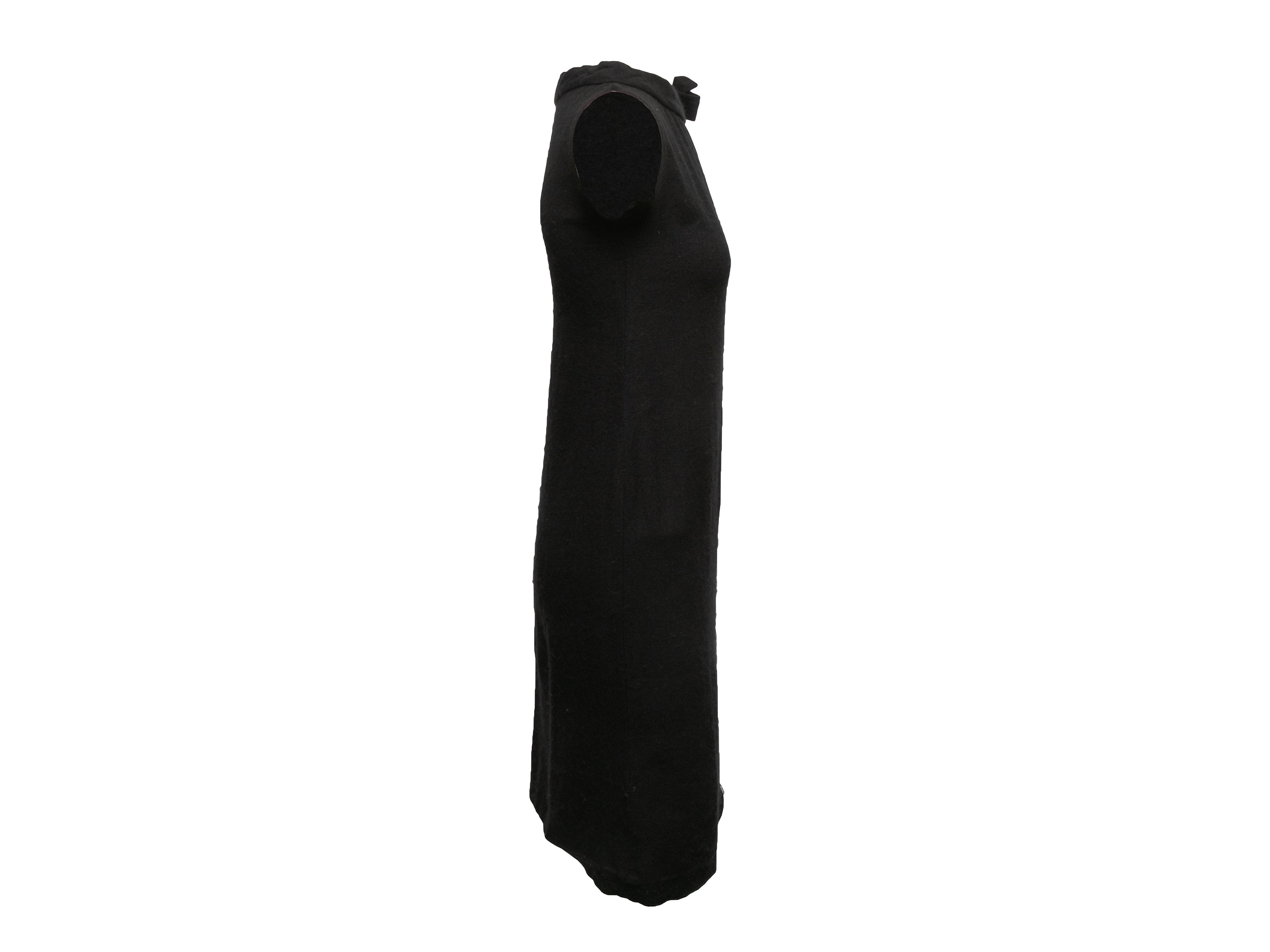 Product Details: Black cashmere and silk-blend sleeveless dress by Maurizio Pecoraro. Crew neck featuring bow accent. 31" bust, 32" waist, 36" length, 11.5" shoulder width.
