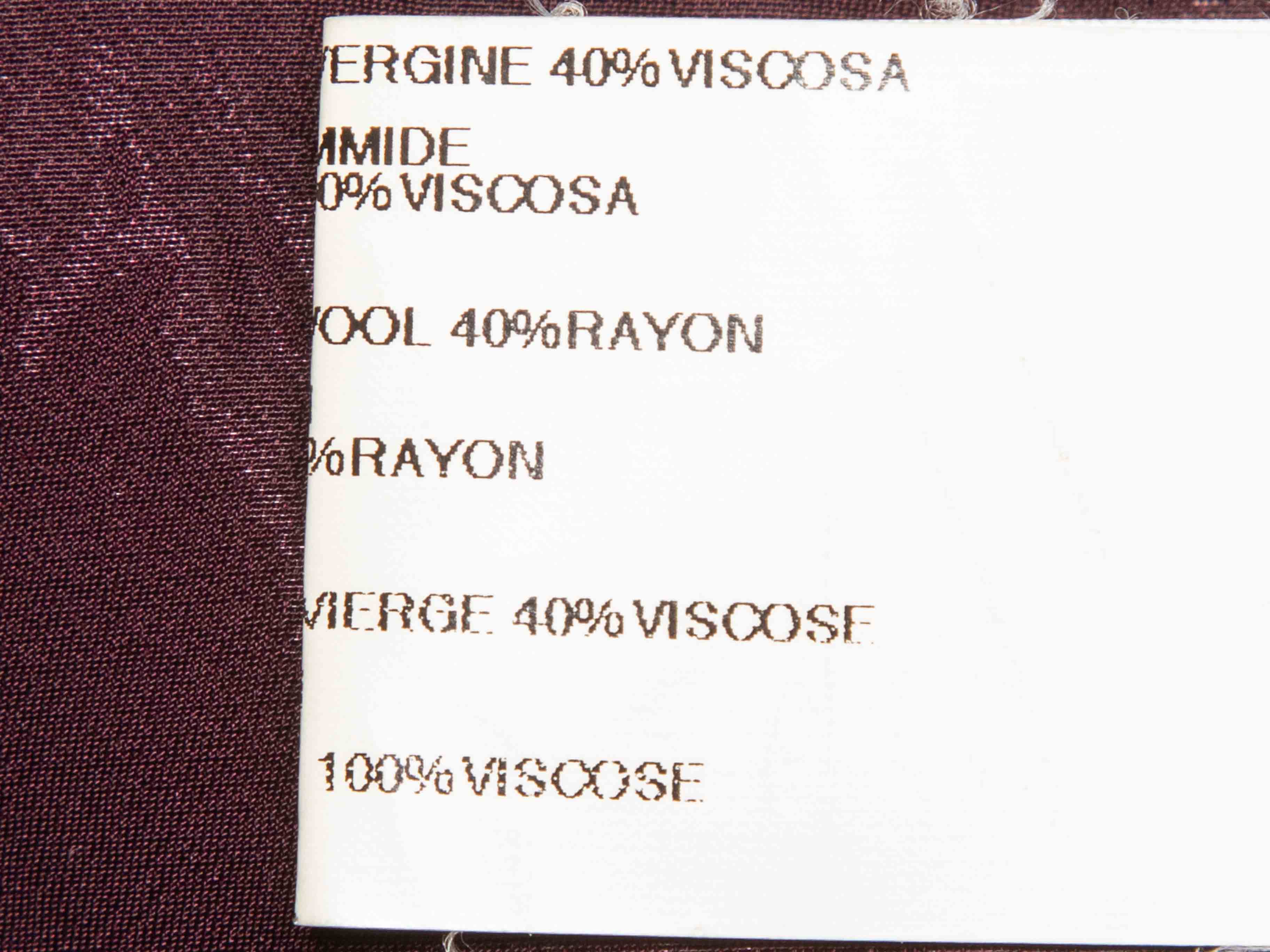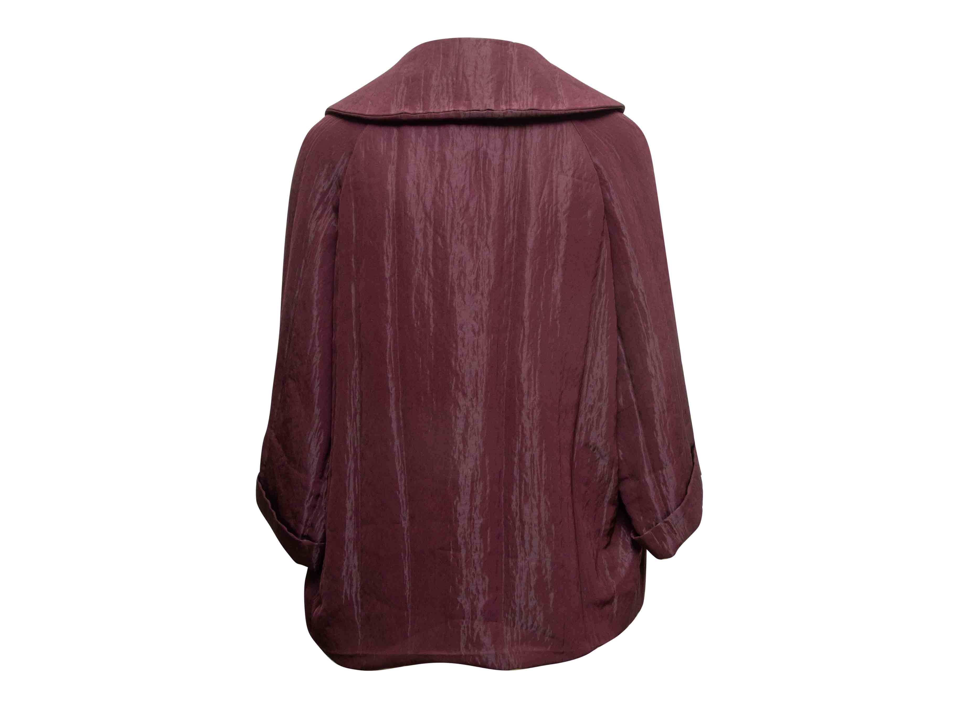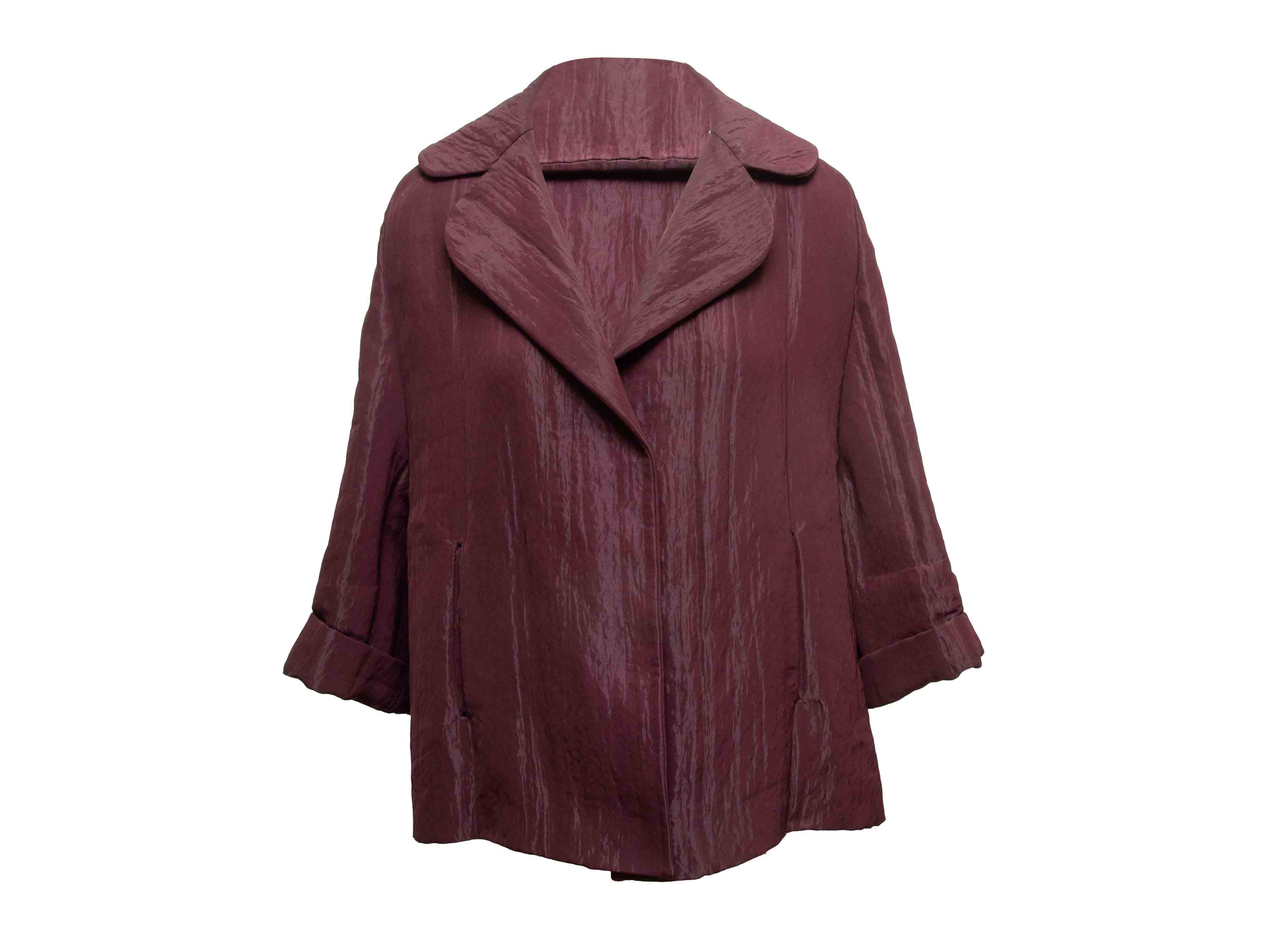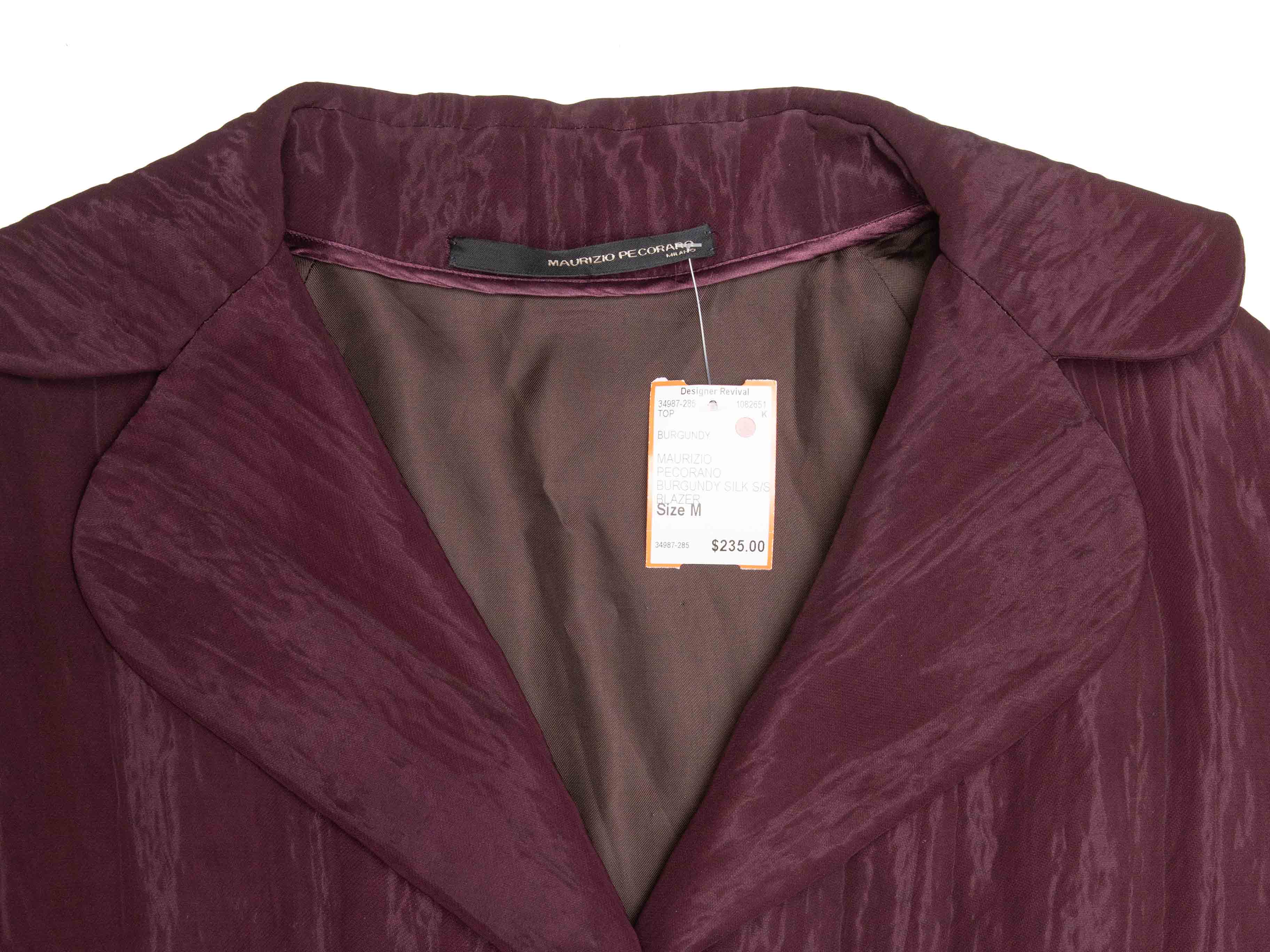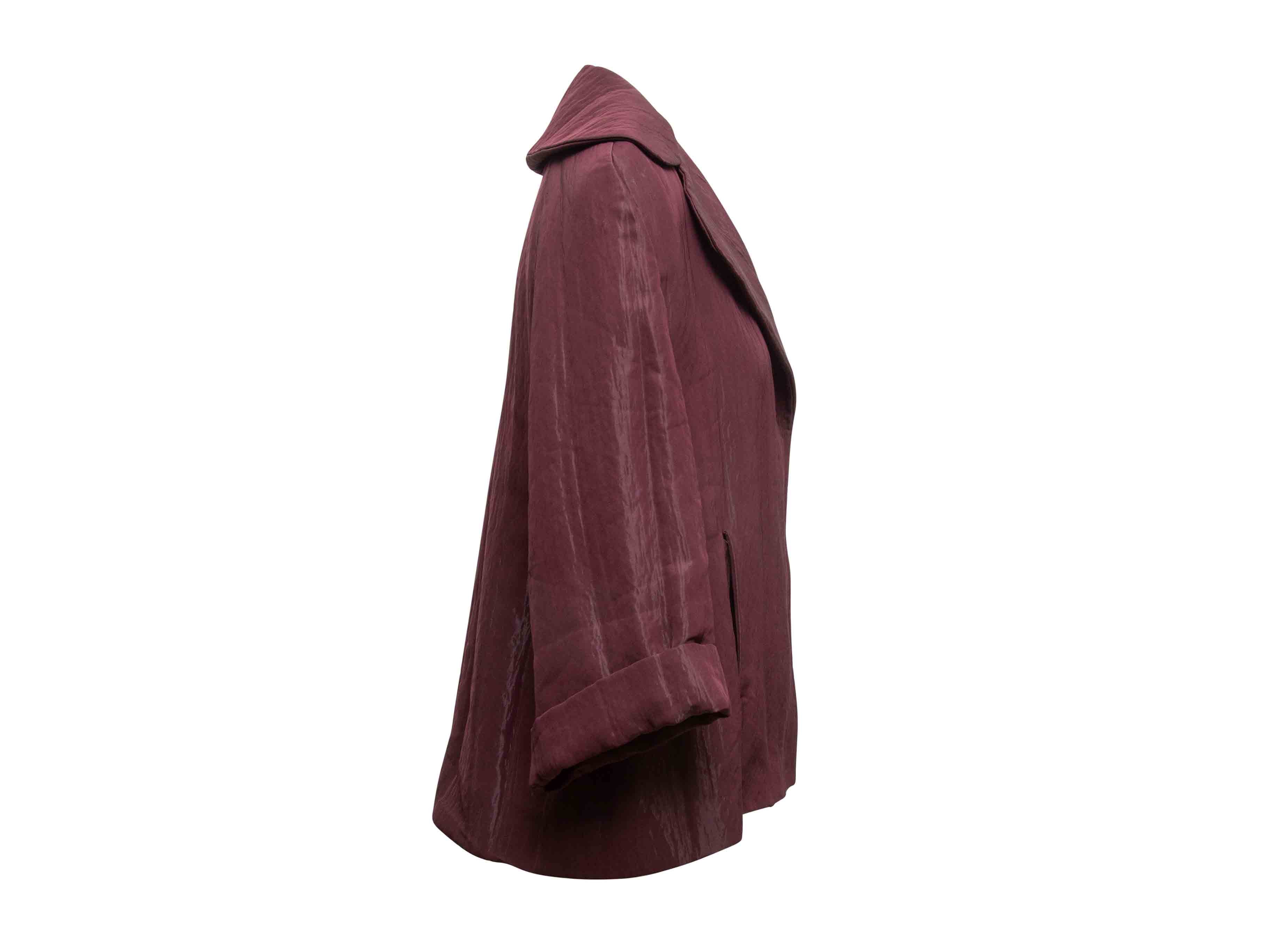 Product Details: Burgundy satin blazer by Maurizio Pecoraro. Rounded notch lapel. Dual hip pockets. Concealed front closure. 46" bust, 19.5" shoulder width, 16" sleeve length, 30" length.
