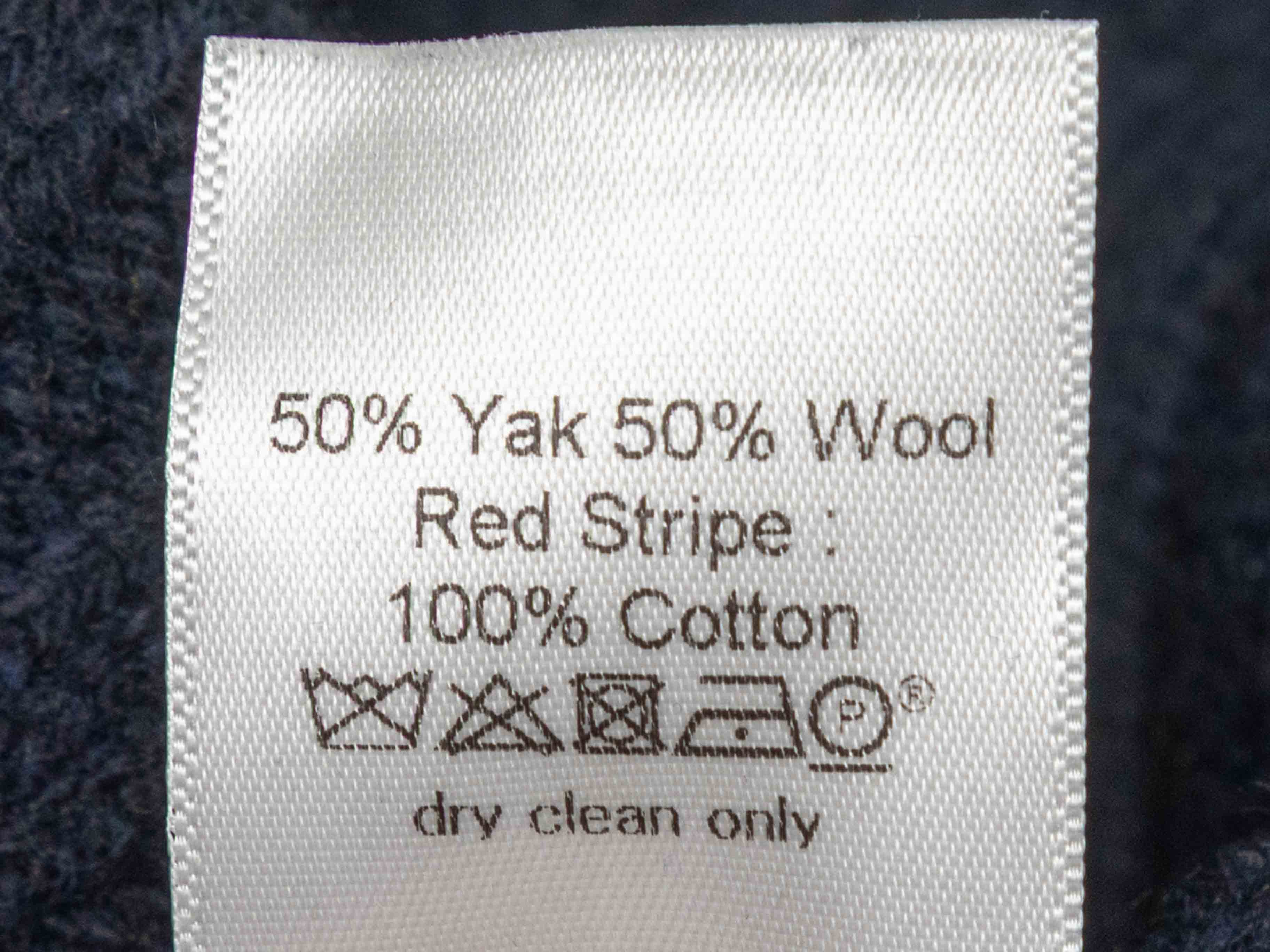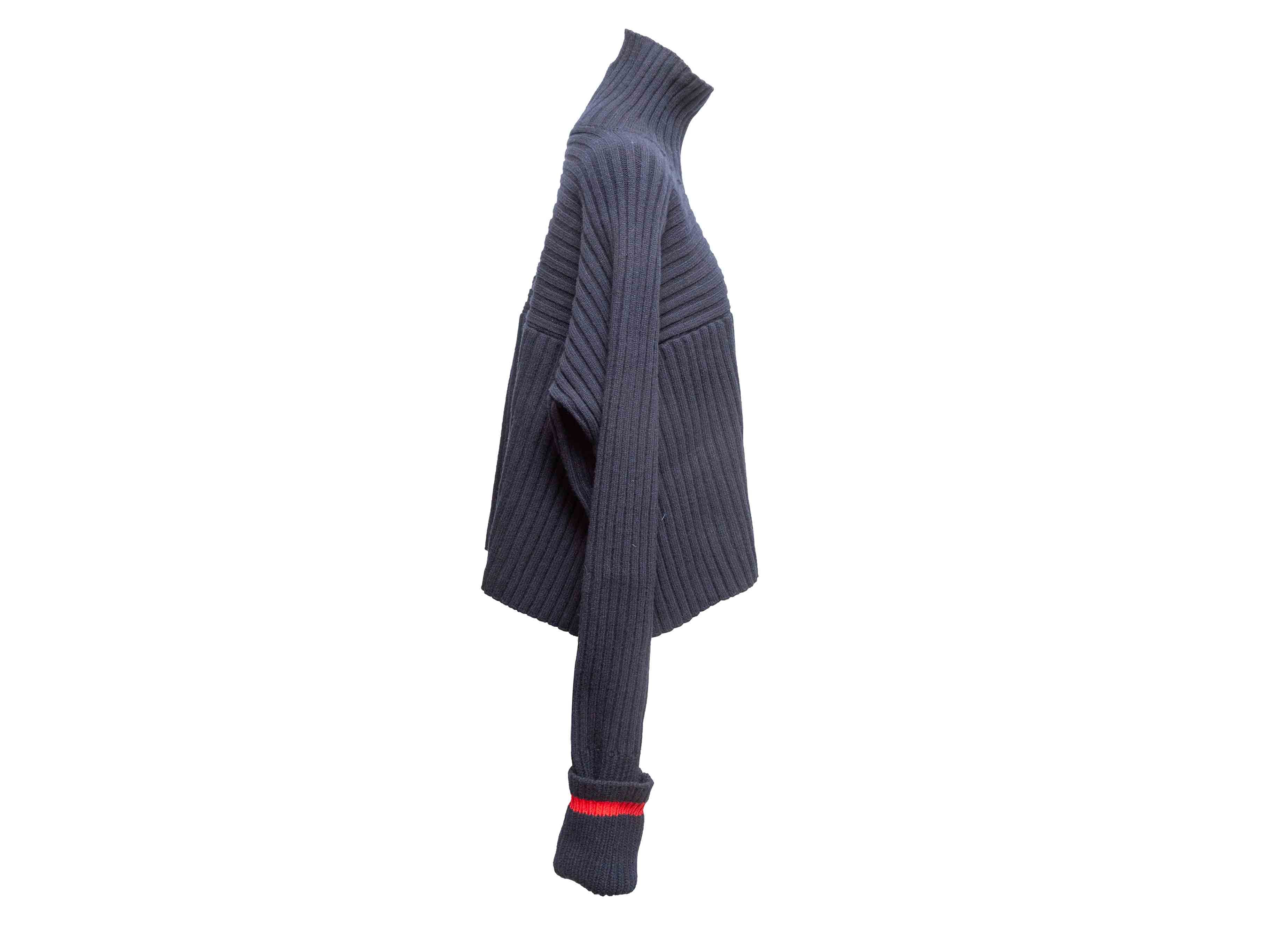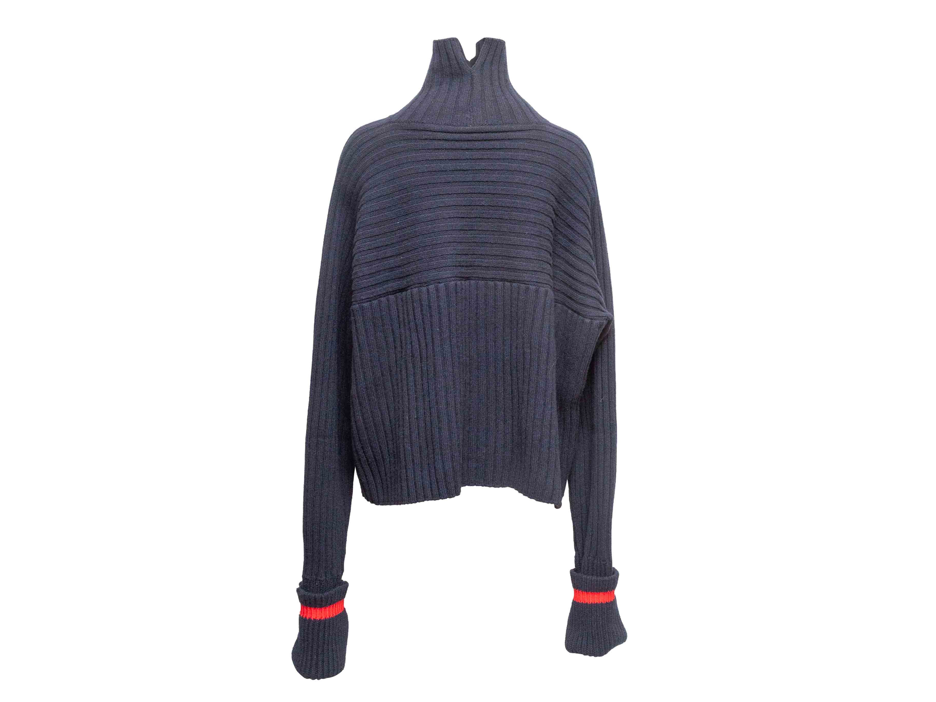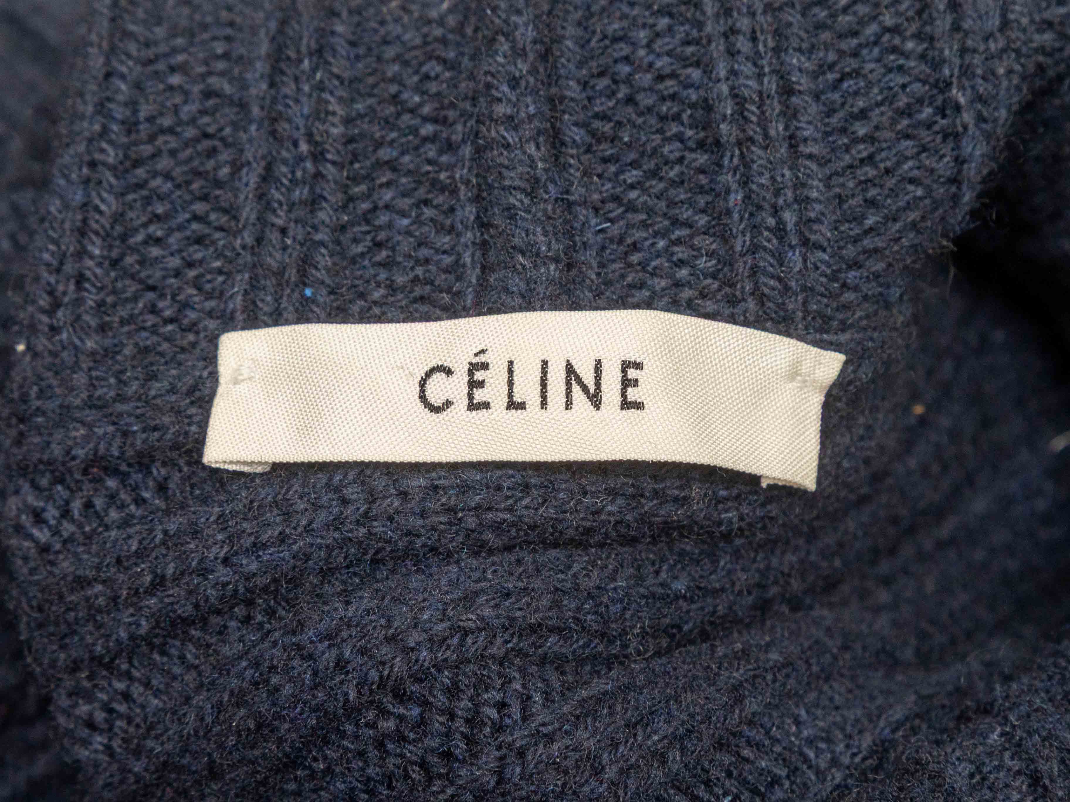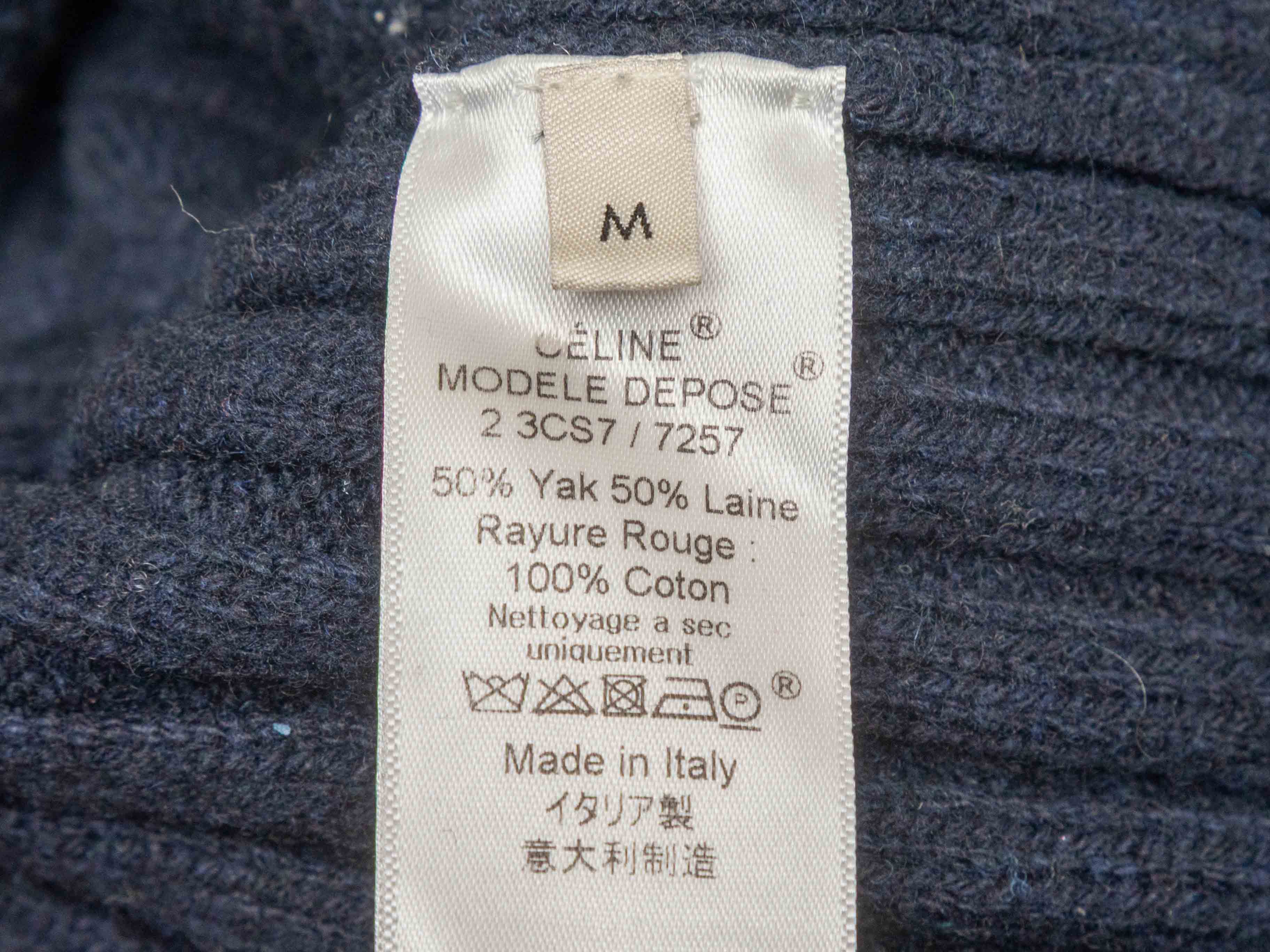 Product Details: Navy and red yak hair and wool-blend turtleneck sweater by Celine. From the Phoebe Philo Era. Ribbed texture throughout. 58" bust, 19" shoulder width, 28.5" length.
