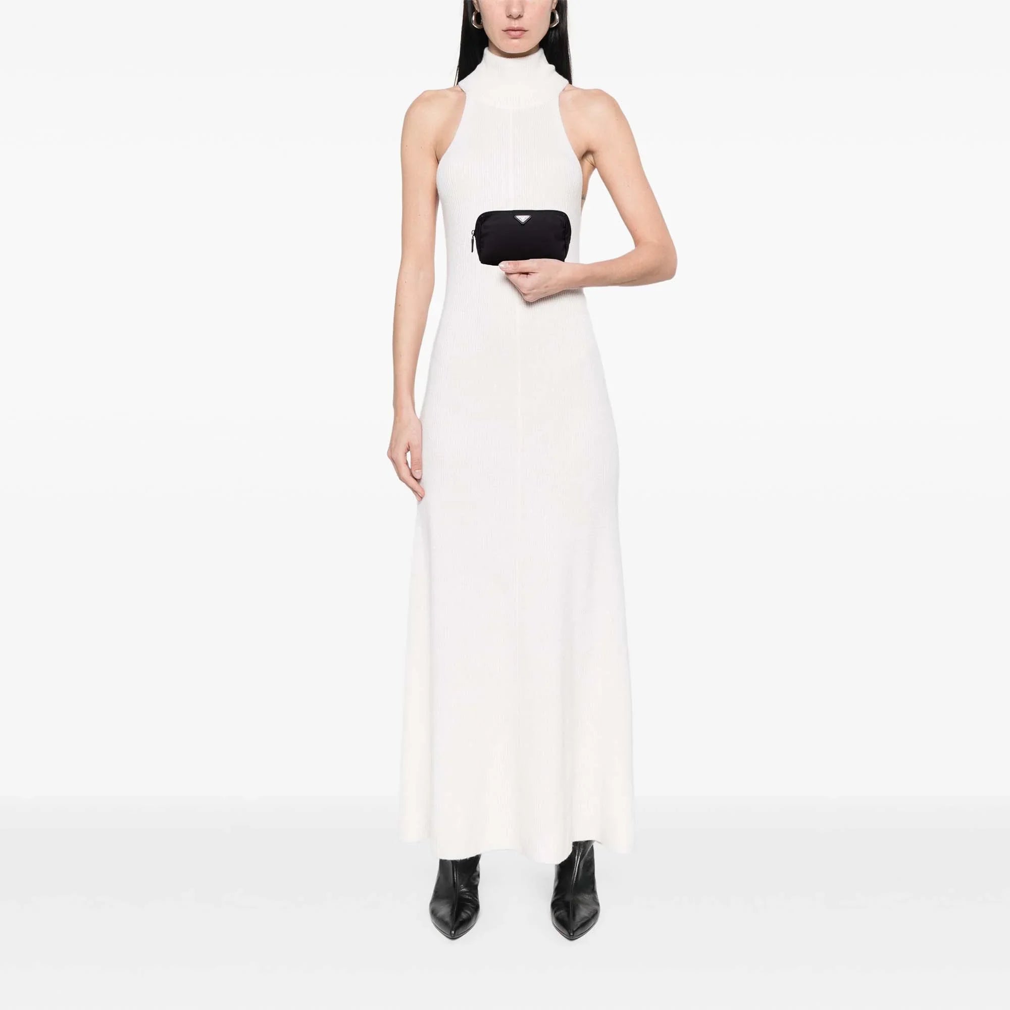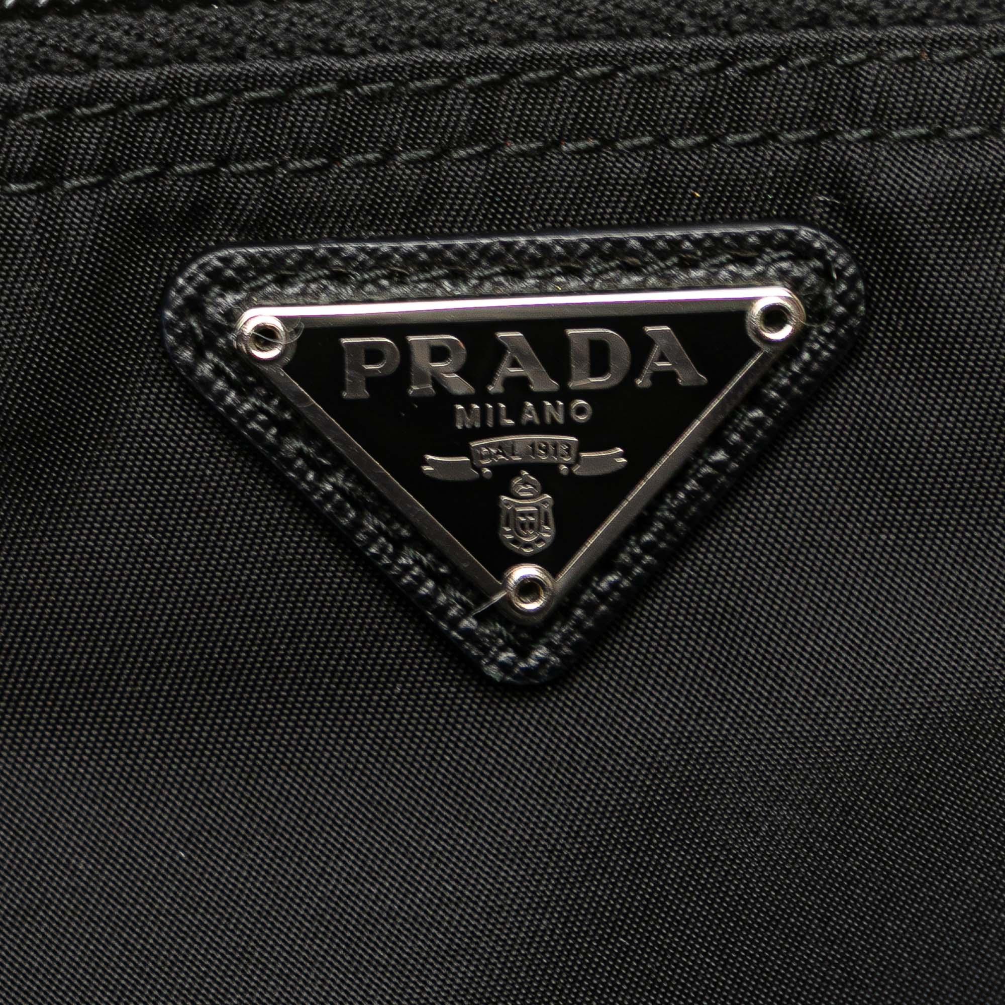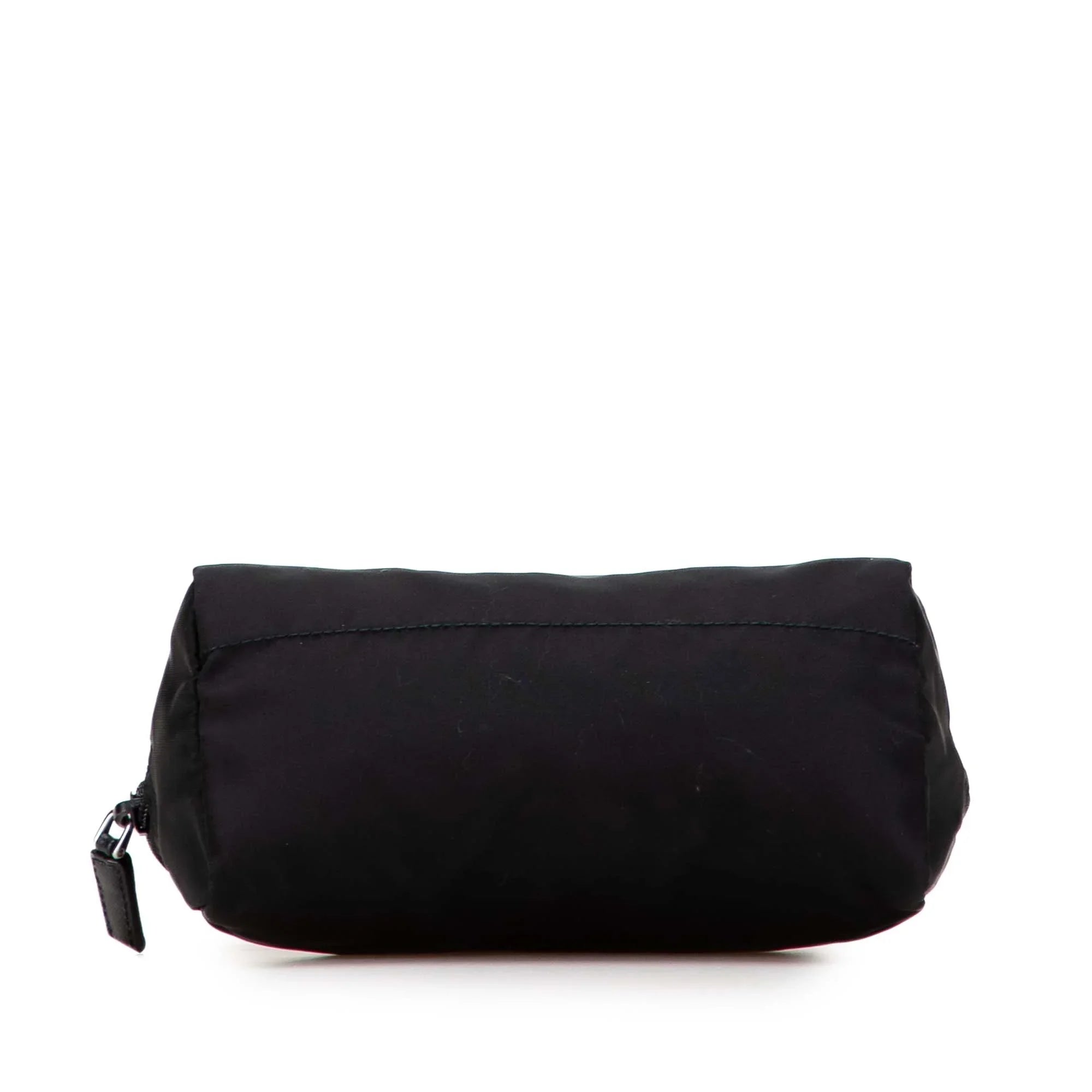 Product Details: Black Prada Tessuto Cosmetic Pouch. This pouch features a nylon body, a top zip closure, and an interior zip pocket. 3.9" L x 7.5" W x 3.3" D.