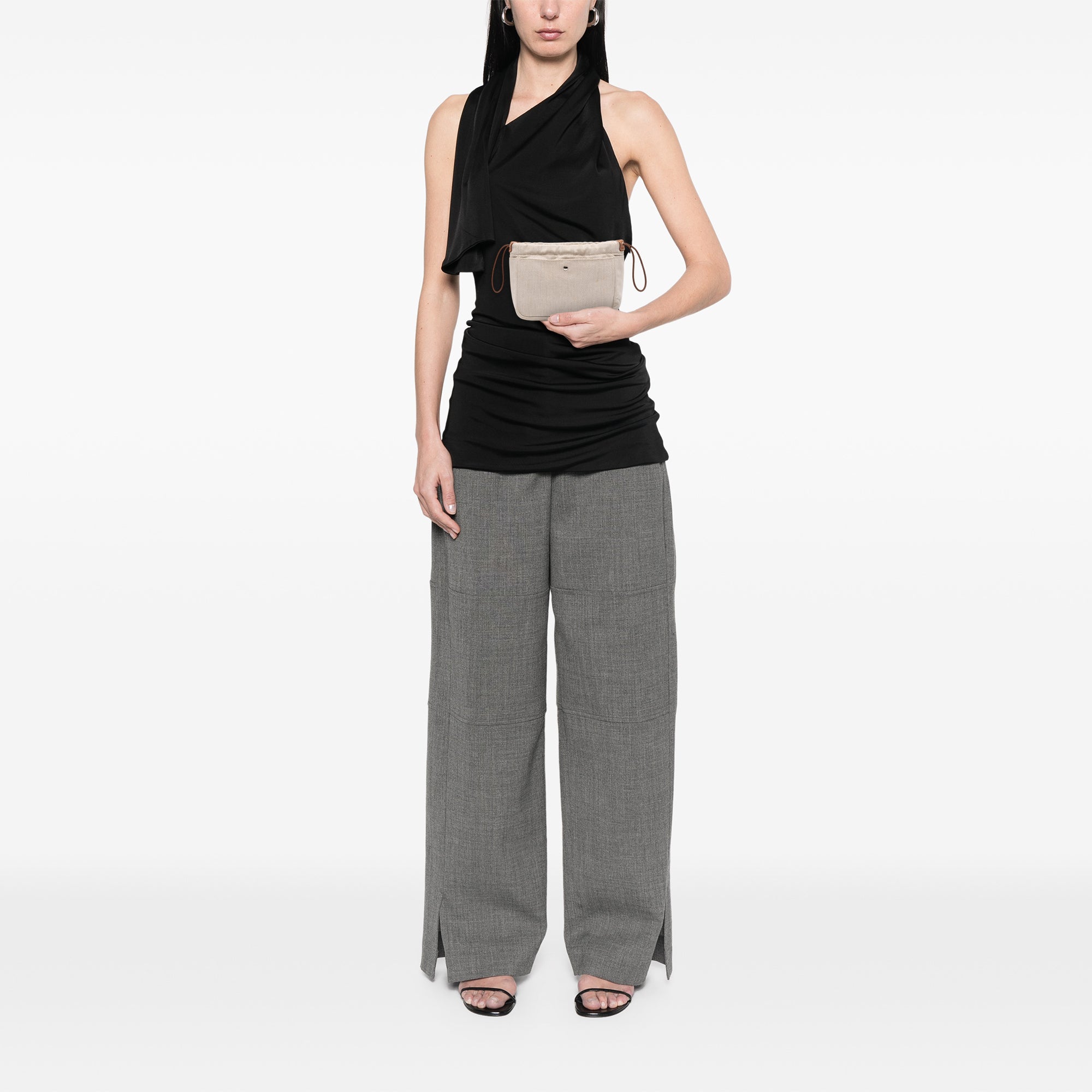 Product Details: Brown Hermès Toile and Barenia Fourbi 20 Pouch. This pouch features a canvas body and Barenia calfskin trim, a drawstring closure, and exterior slip pockets with snap closures. 6.1" L x 7.5" W x 2.8" D, 5.1" drop. Serial number 063912CKAA.