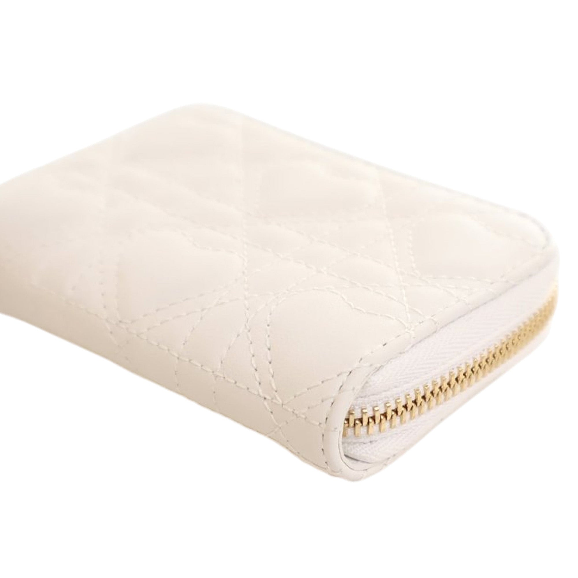 Product Details: White Dior Small Lambskin Heart Motif Lady Dior Voyageur Coin Pouch. This wallet features a quilted lambskin leather body, a zip around closure, and interior zip and slip compartments. 3.1" L x 4.3" W x 1" D. Serial number 43-MA-1202.