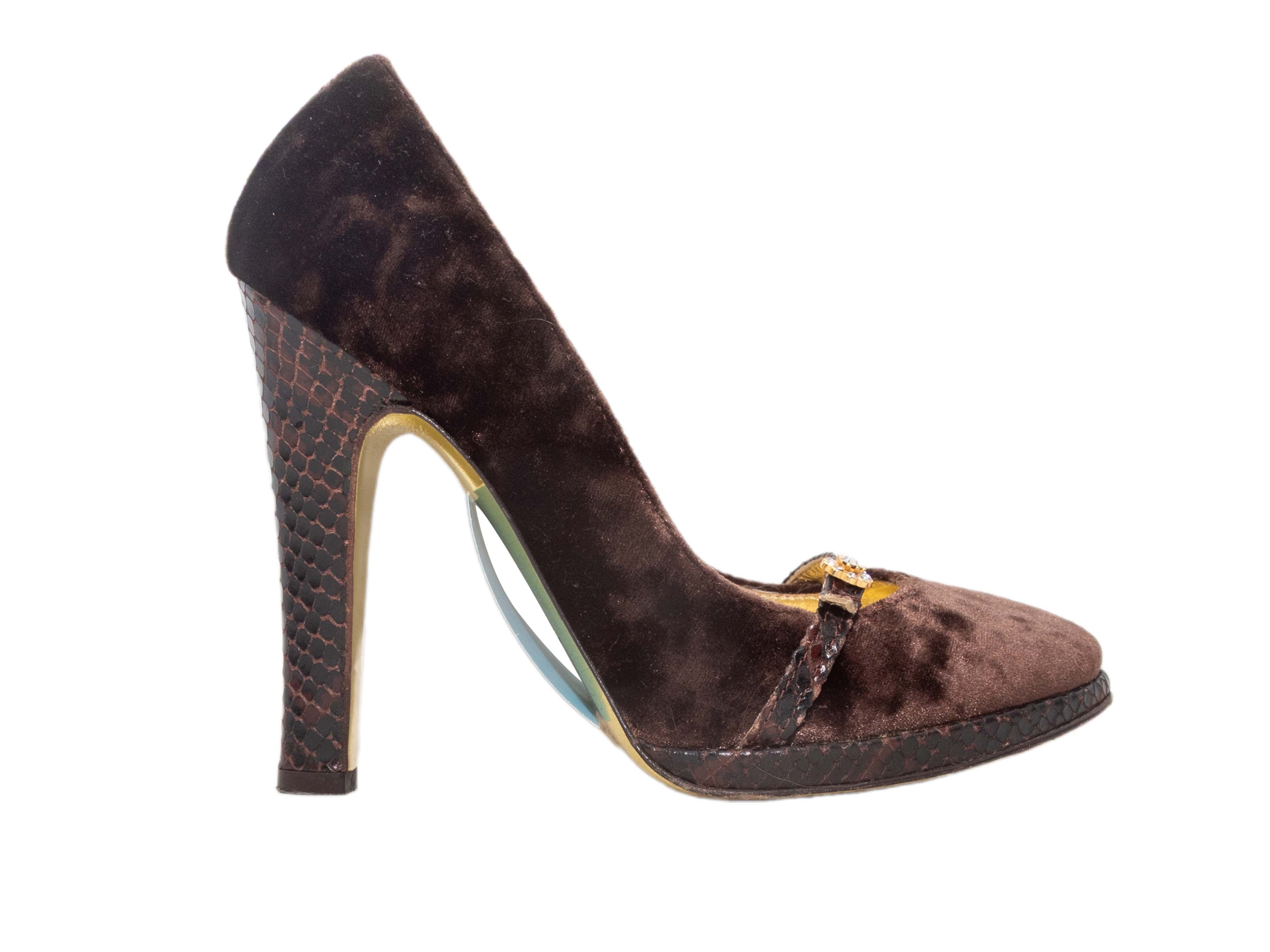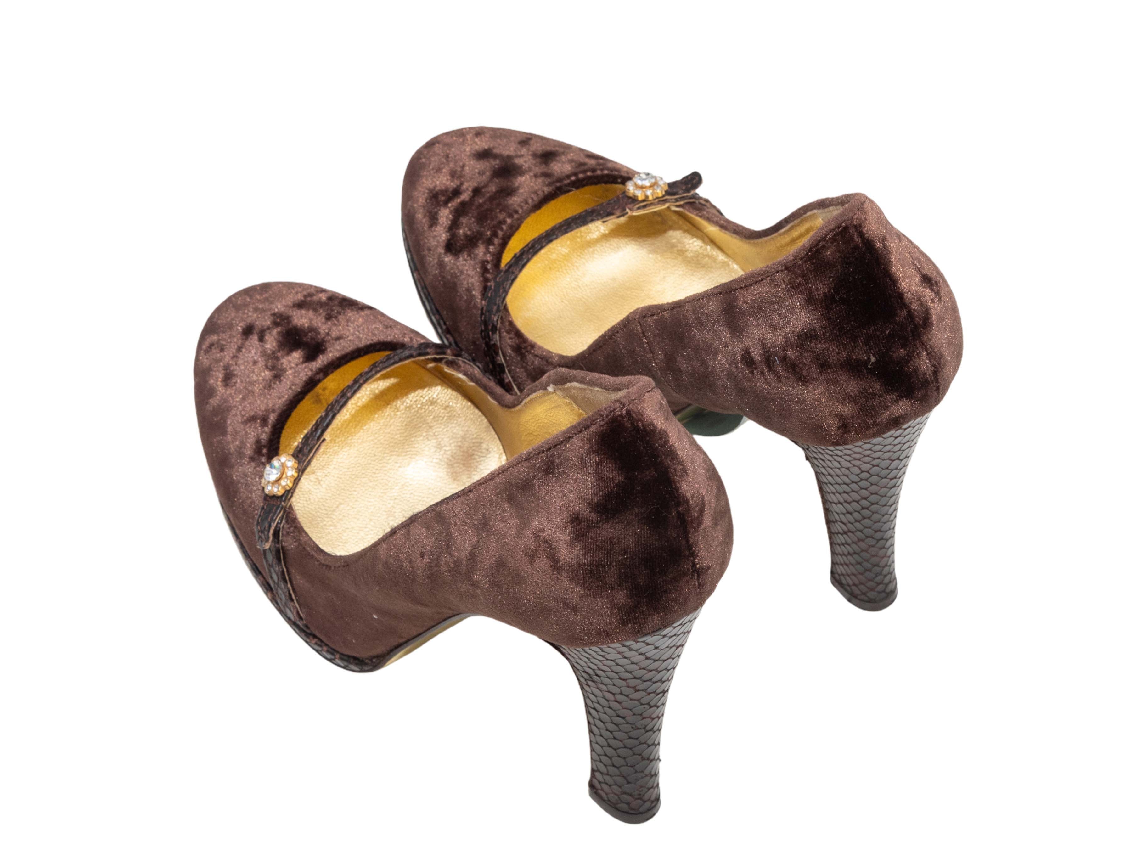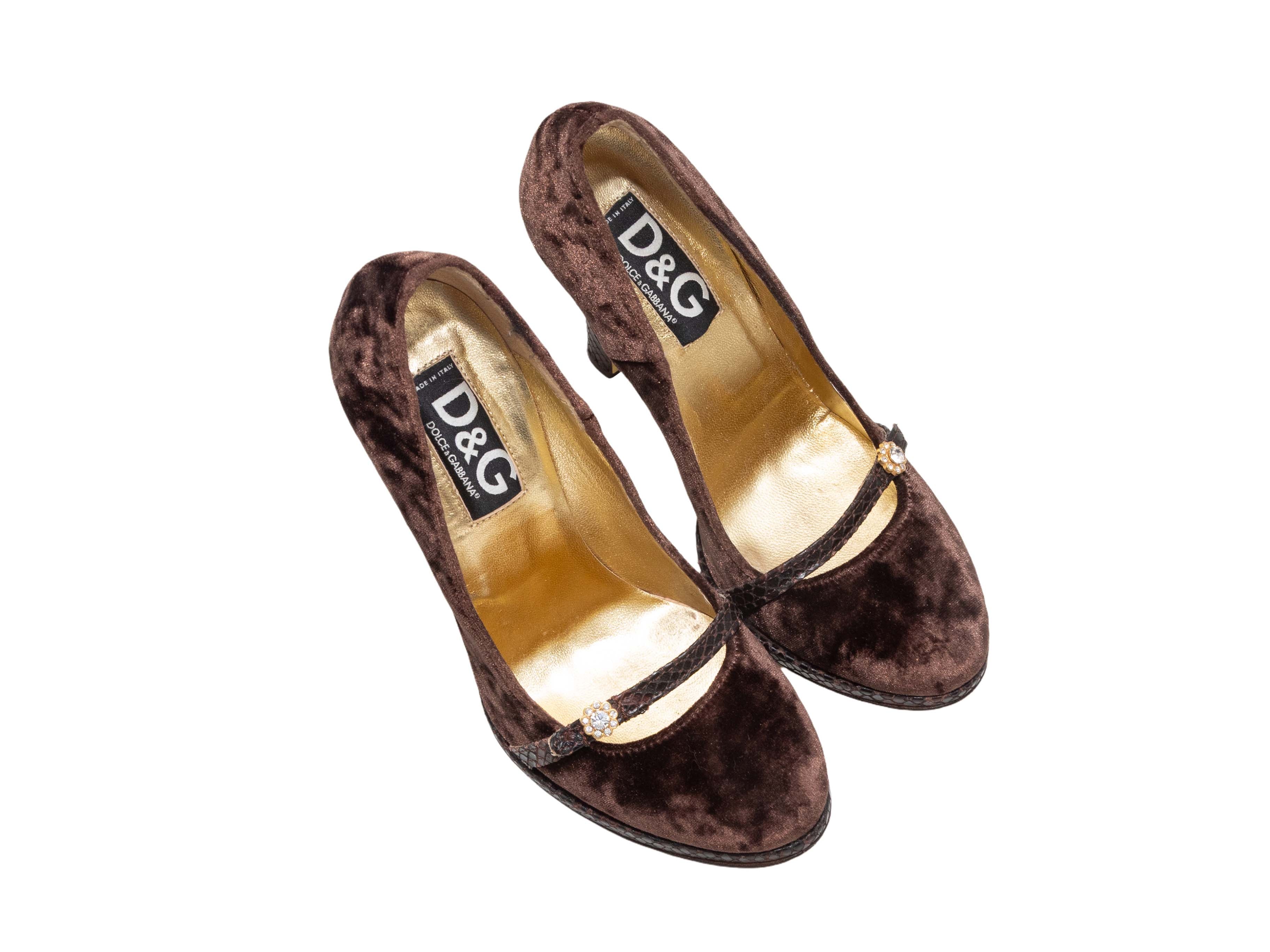 Product Details: Brown velvet and snakeskin heeled Mary Jane pumps by Dolce & Gabbana. Gold-tone and crystal adornments at straps. 0.5" platform height, 4.75" heel height.