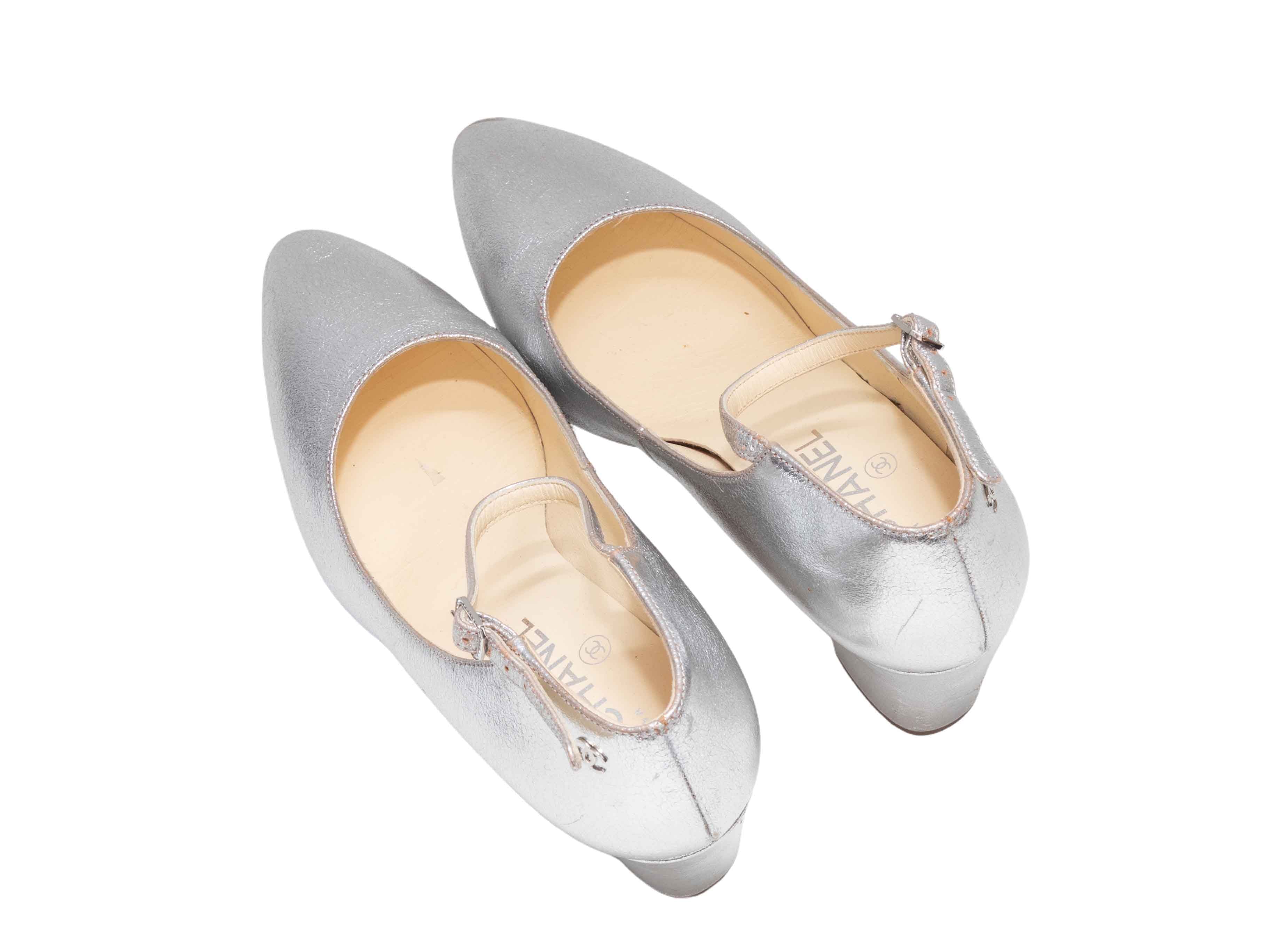 Product Details: Silver metallic leather pointed-toe ankle strap pumps by Chanel. Buckle closures at ankle straps. 3" heel height.