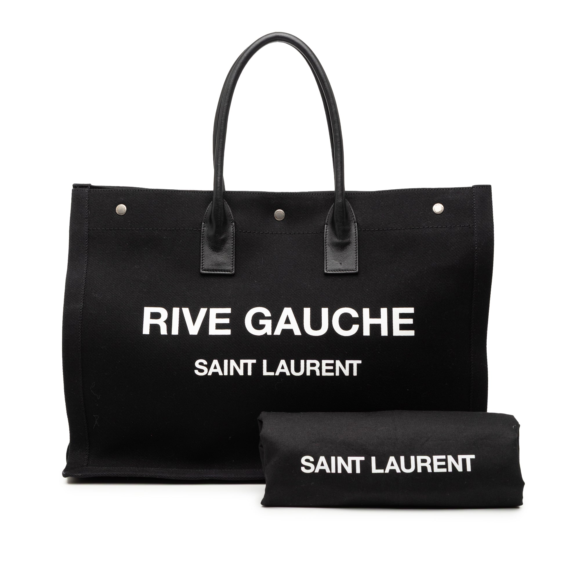 Product Details: Black Saint Laurent Canvas Rive Gauche Tote. This tote bag features a canvas body, rolled leather handles, an open top with snap button closure, and an interior zip pocket. 13" L x 18.5" W x 7.1" D. Serial number GNR509415 0419.