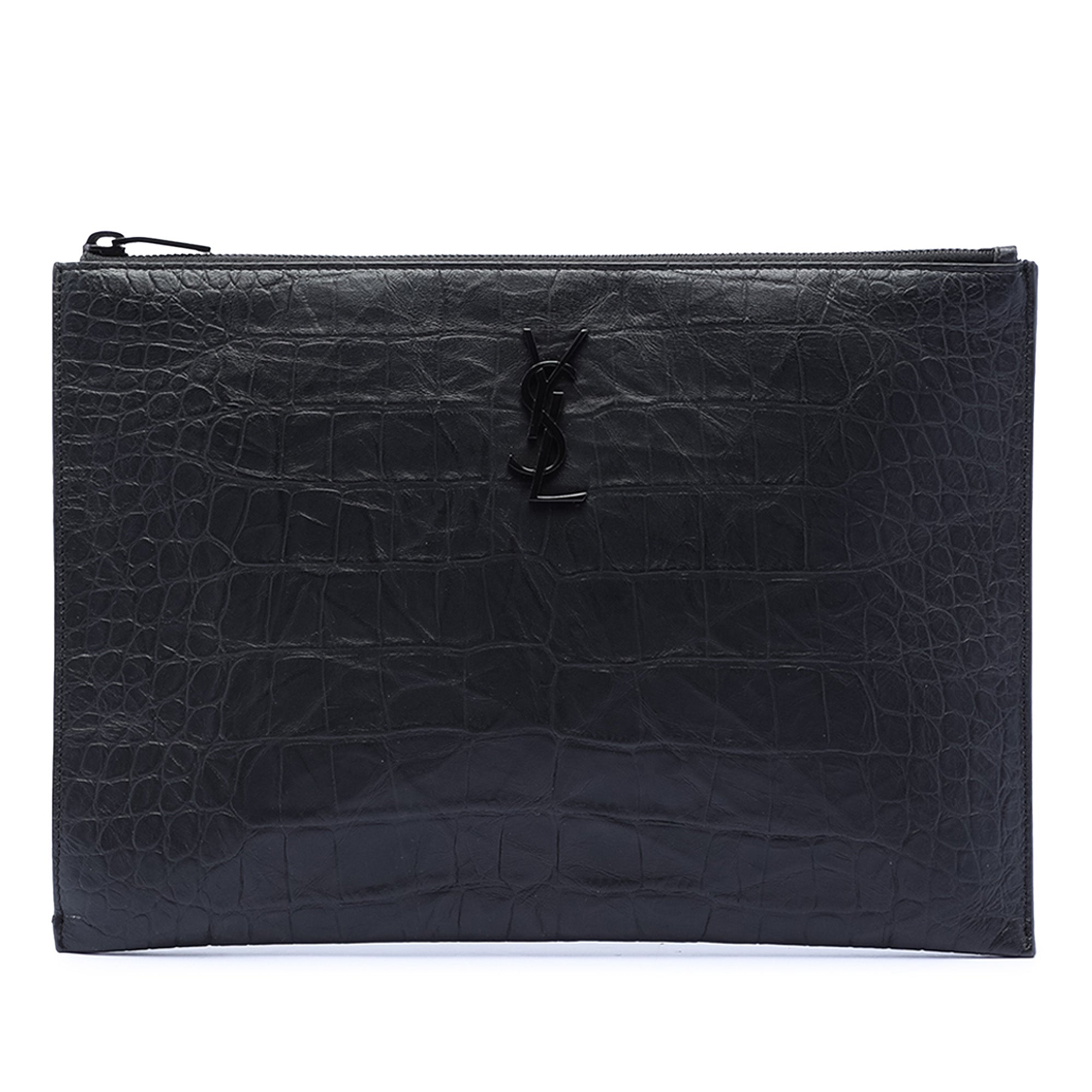 Black Saint Laurent Croc Embossed Leather Monogram Document Holder Clutch Bag