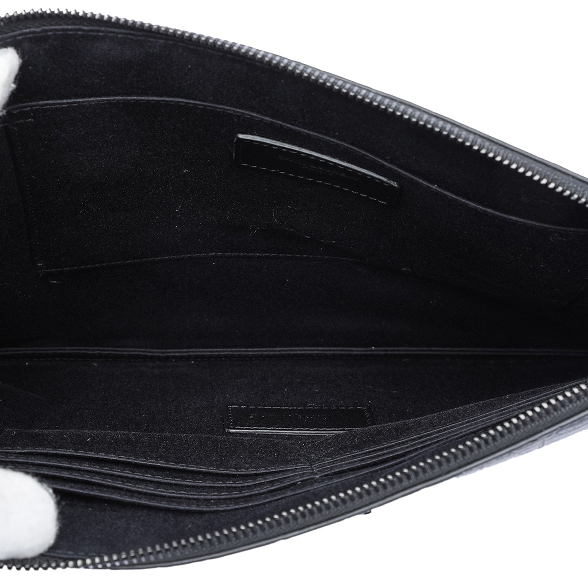 Product Details: Black Saint Laurent Croc Embossed Leather Monogram Document Holder Clutch Bag. This clutch bag features a croc embossed leather body, a top zip closure, and an interior slip pocket. 7.9" L x 11.4" W x 0.6" D. Serial number TCR453249·0617.