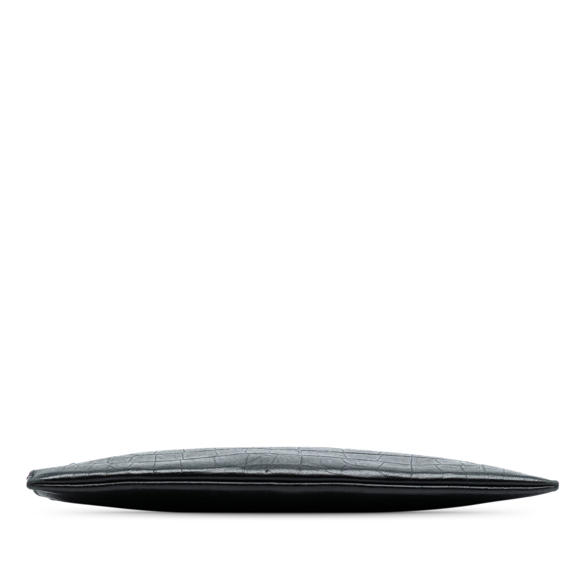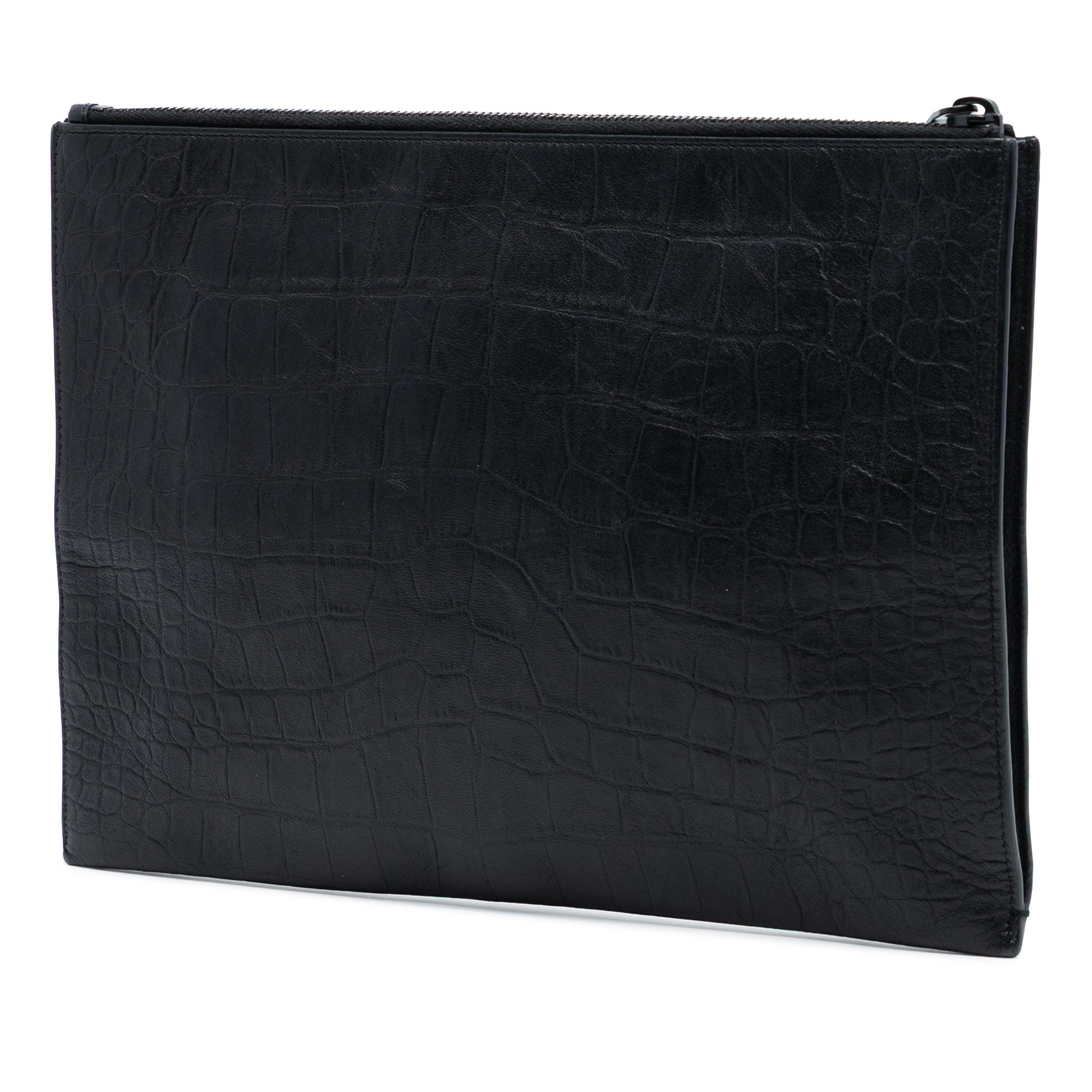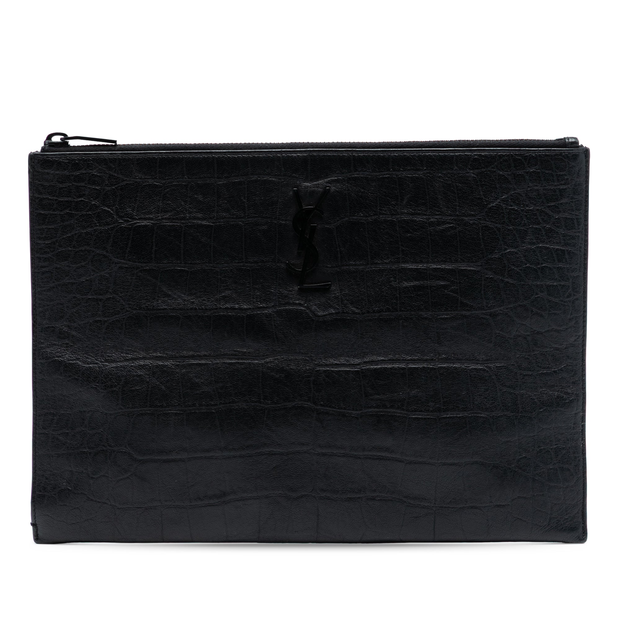 Product Details: Black Saint Laurent Croc Embossed Leather Monogram Document Holder Clutch Bag. This clutch bag features a croc embossed leather body, a top zip closure, and an interior slip pocket. 8.1" L x 11.4" W x 0.4" D. Serial number ALM·453249·0118.