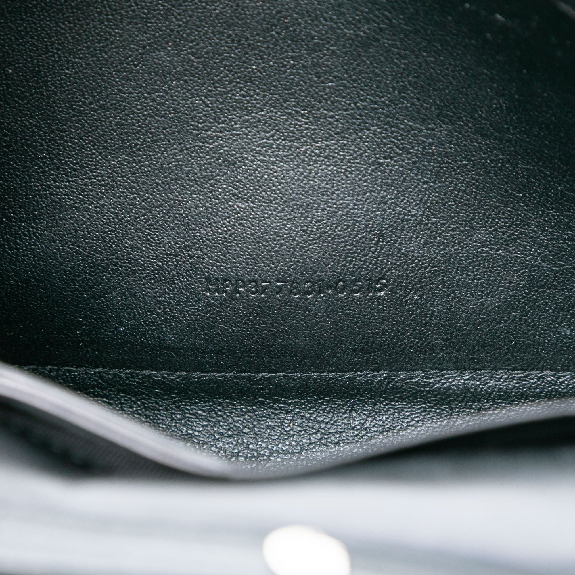 Product Details: Black Saint Laurent Croc Embossed Leather Wallet On Chain Crossbody Bag. This wallet on chain features an embossed leather body, a chain link strap, a flap with magnetic snap closure, and interior zip and slip compartments. 5.5" L x 8.7" W x 0.8" D. Serial number HPP377831·0515.
