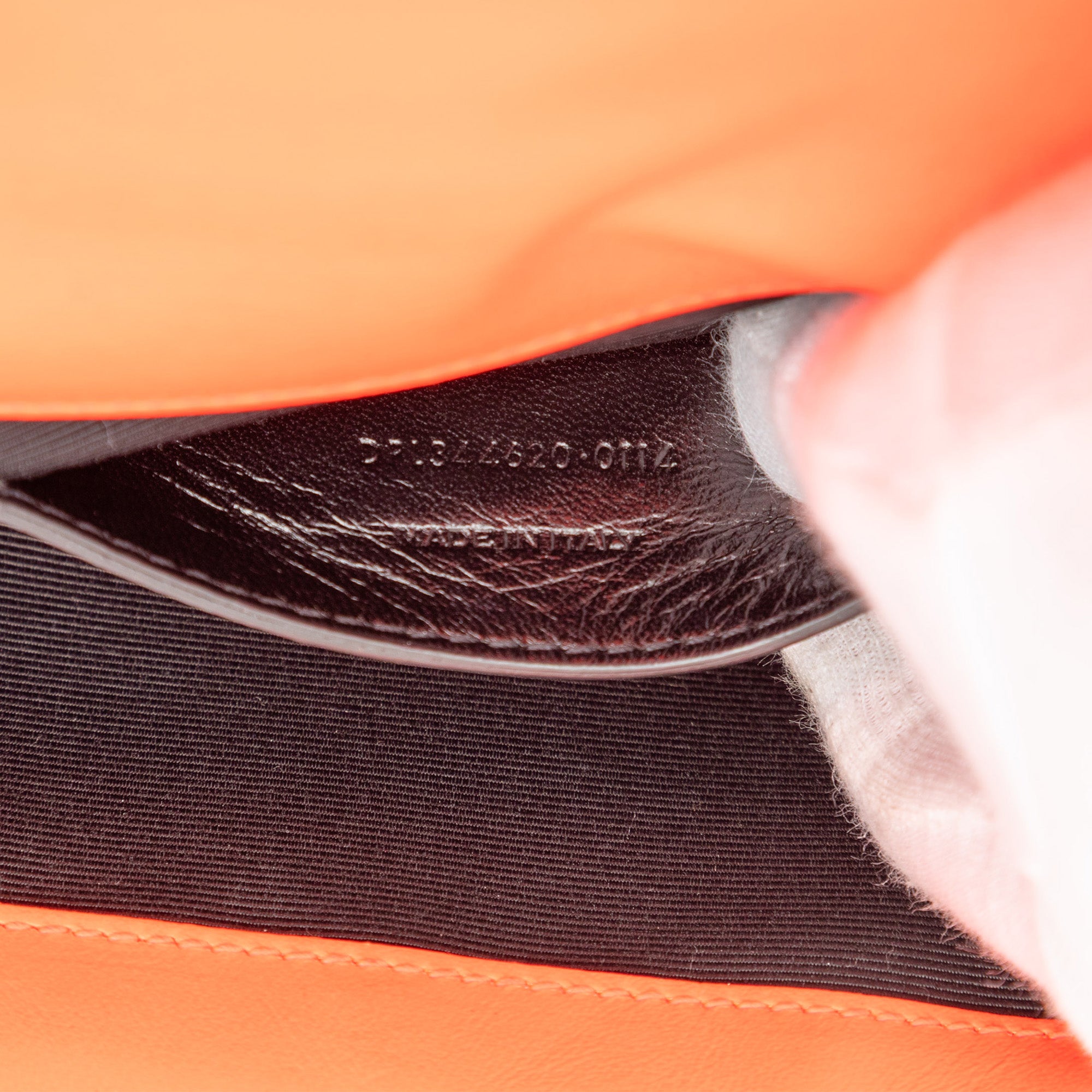 Product Details: Orange Saint Laurent Small Leather Monogram Kate Crossbody. The Kate crossbody bag features a leather body, a chain shoulder strap, a front flap with a metal YSL logo and magnetic closure, and an interior slip pocket. 4.7" L x 6.5" W x 1.6" D. Serial number DPL344620 0114.