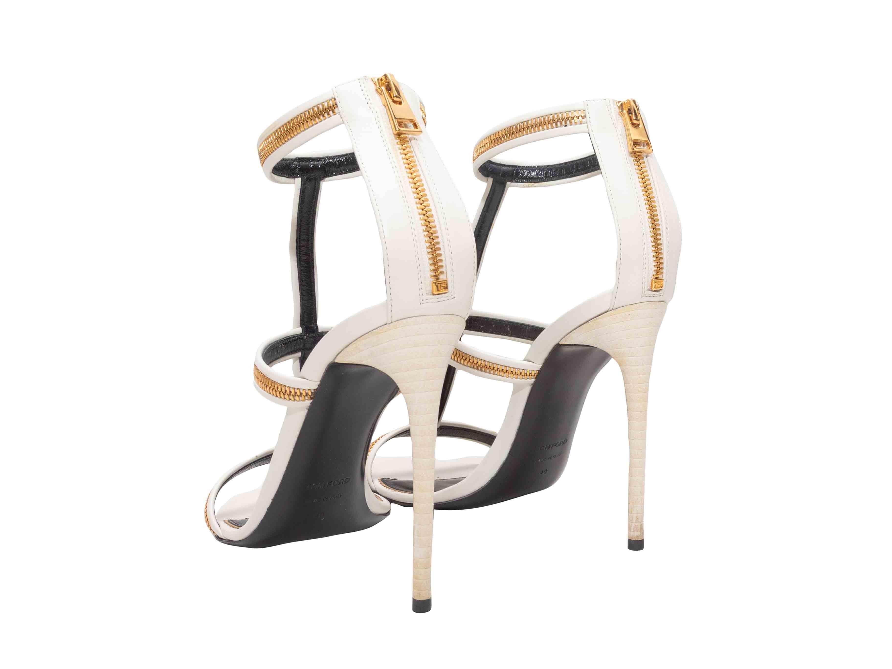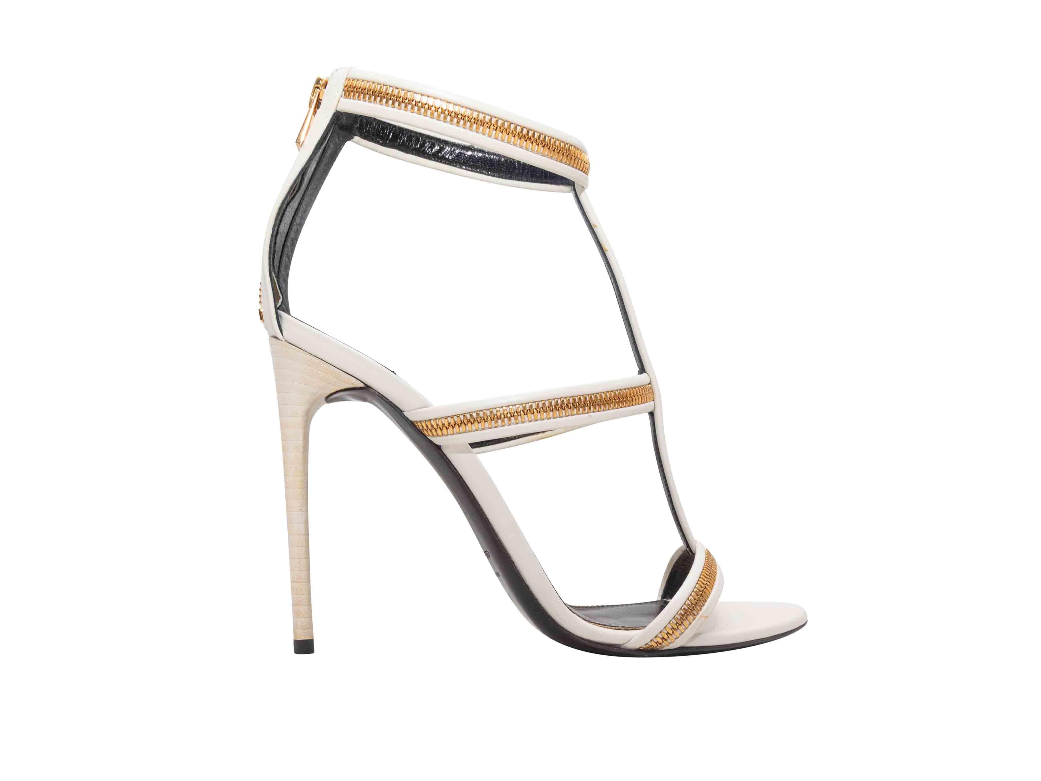 Product Details: White leather and gold-tone zipper hardware heeled sandals by Tom Ford. Zip closures at counters. 4.5" heel height.