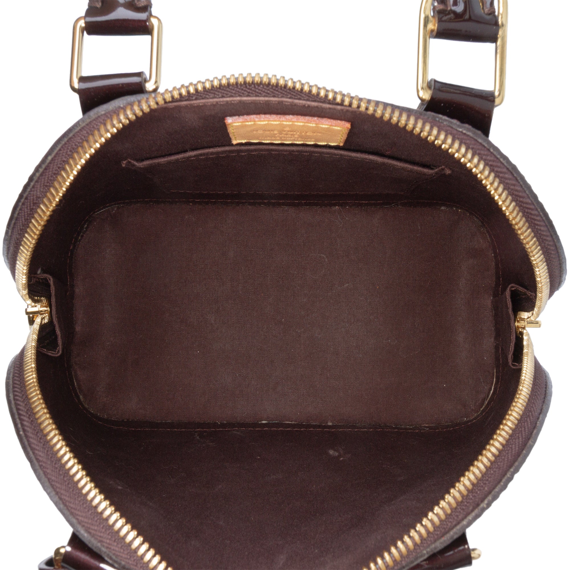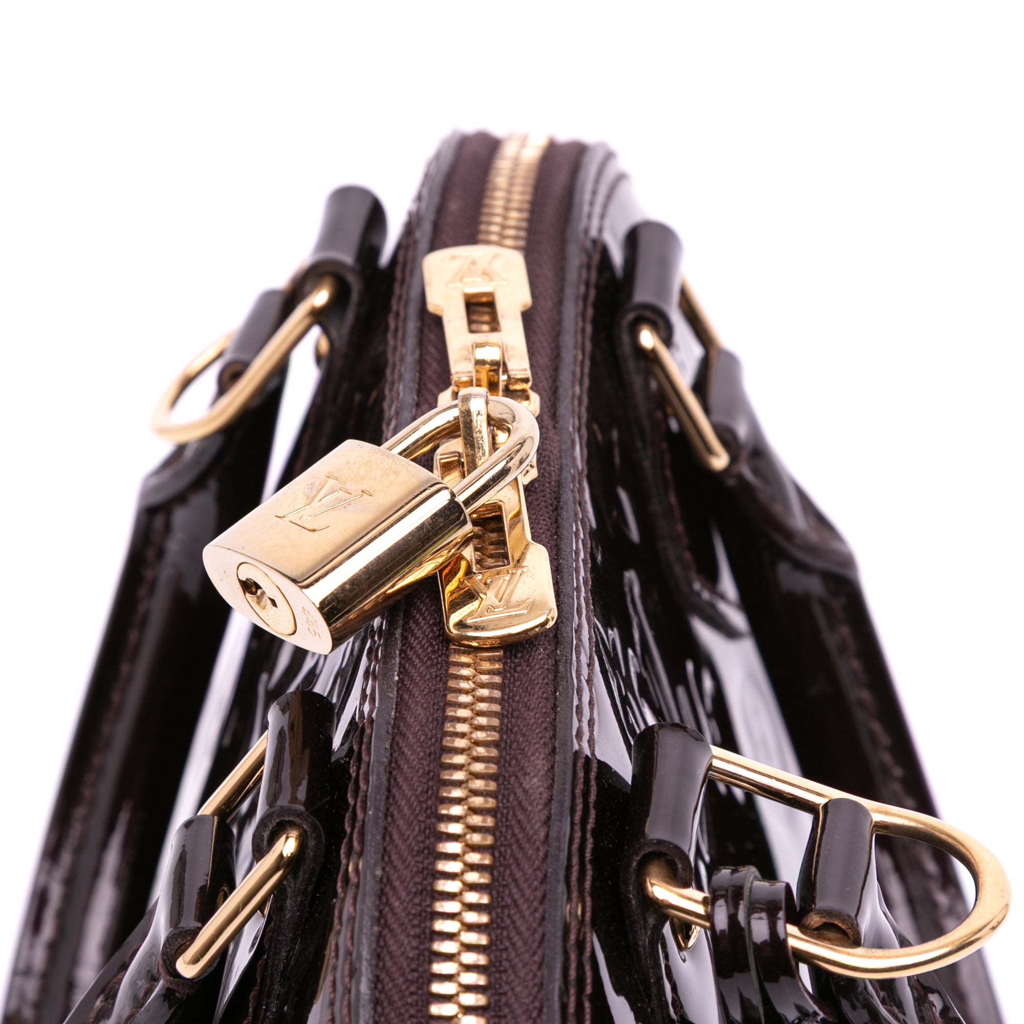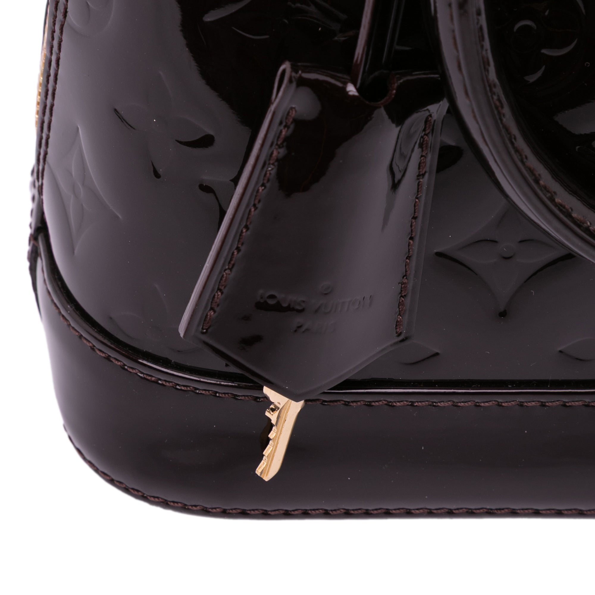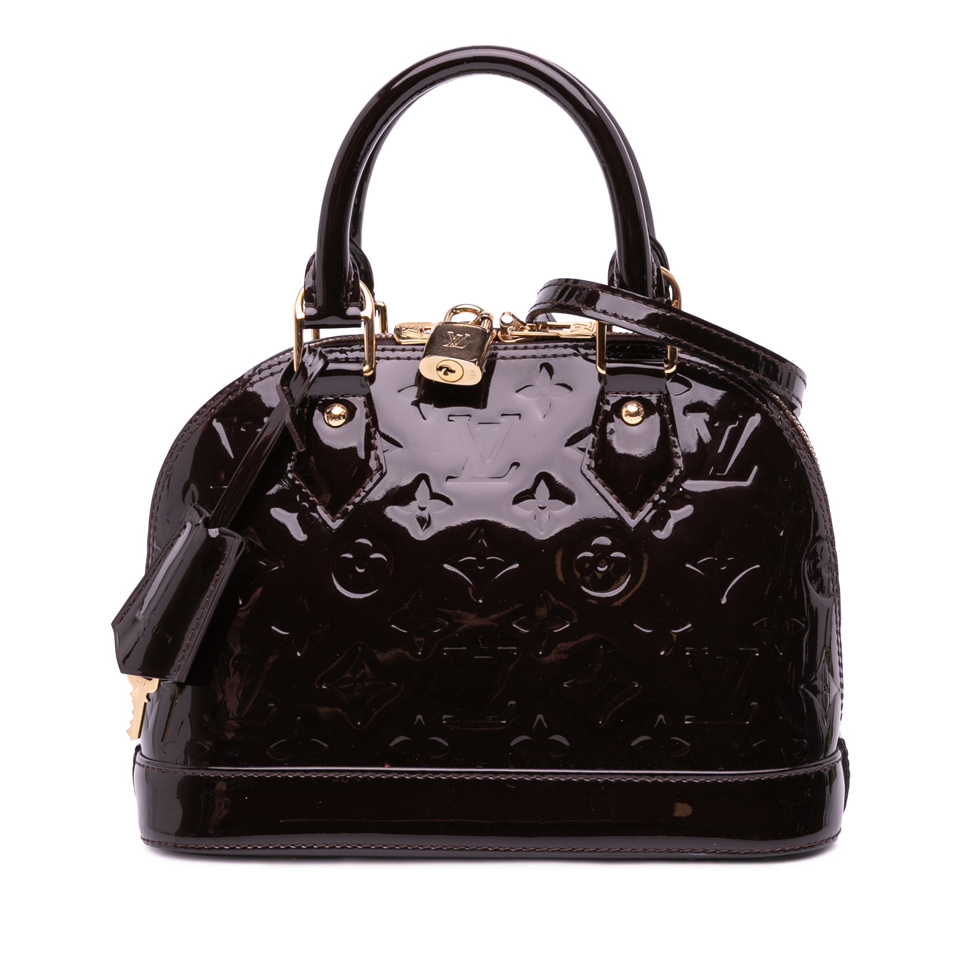 Product Details: Purple Louis Vuitton Monogram Vernis Alma BB Satchel. The Alma BB features a monogram vernis leather body, a clochette, rolled leather handles, a top zip-around closure, and an interior slip pocket. 6.7" L x 9.3" W x 4.7" D, 3.3" drop. Serial number CT4107.