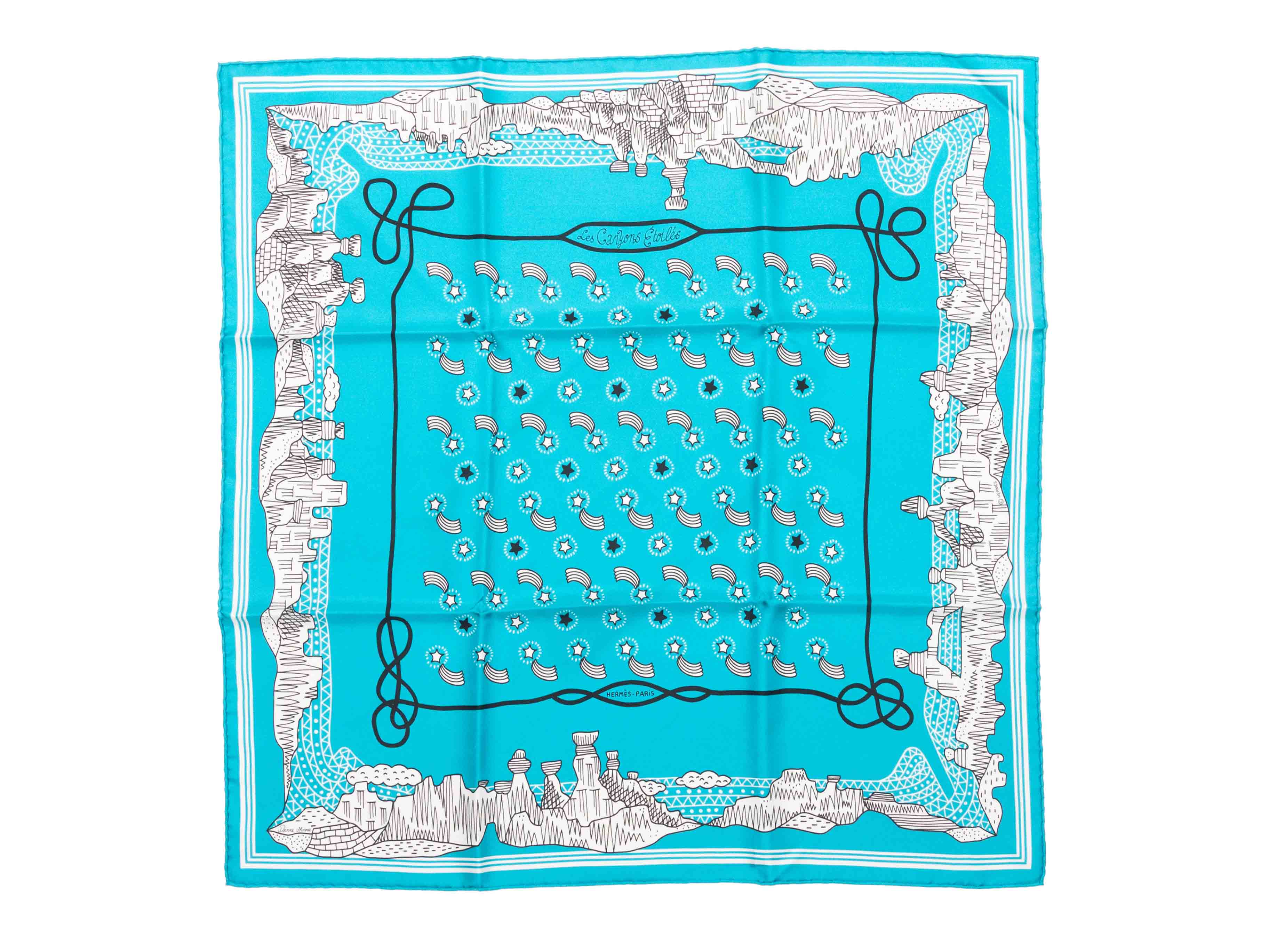 Product Details: Aqua, white, and black 'Les Canyons Etoiles' motif printed silk scarf by Hermes. 22" width, 22" length.