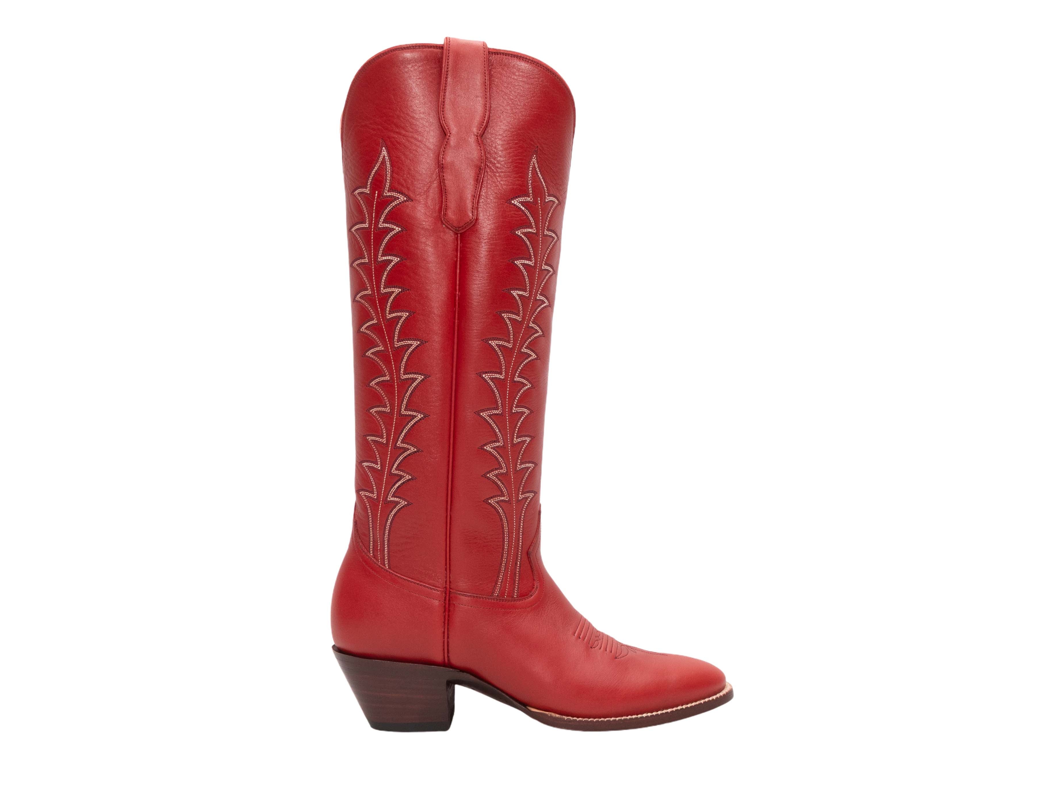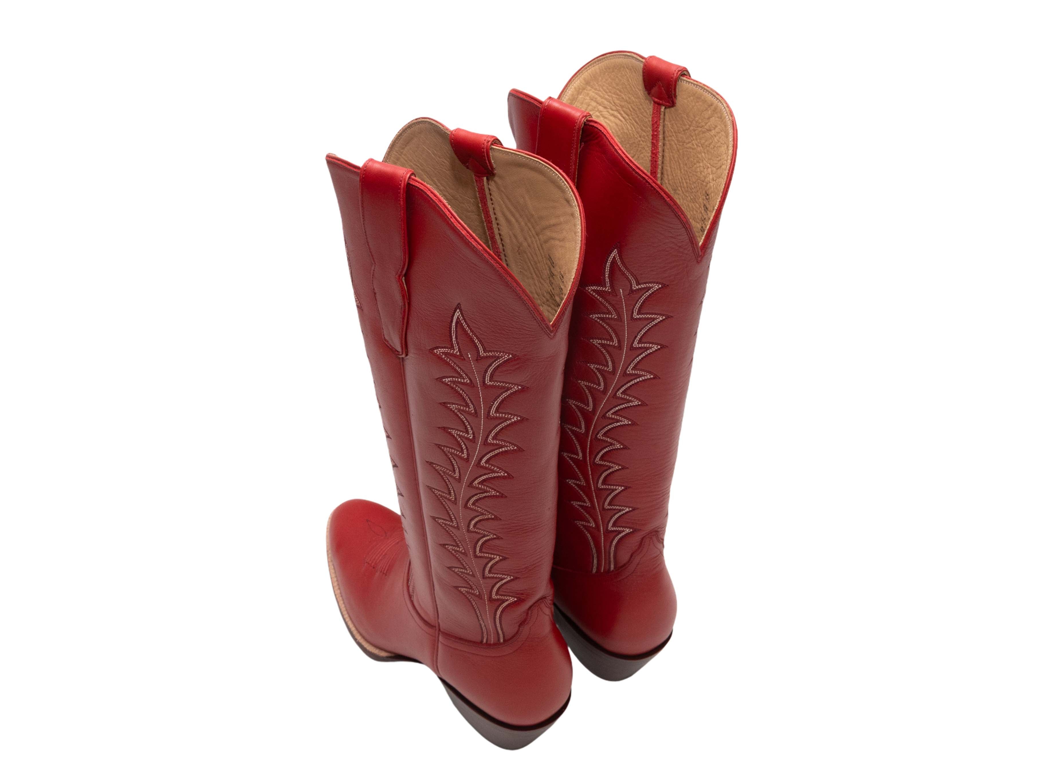 Product Details: Red leather tall cowboy boots by City. Contrast stitching throughout. Stacked heels. 12.5" shaft height, 2.5" heel height.