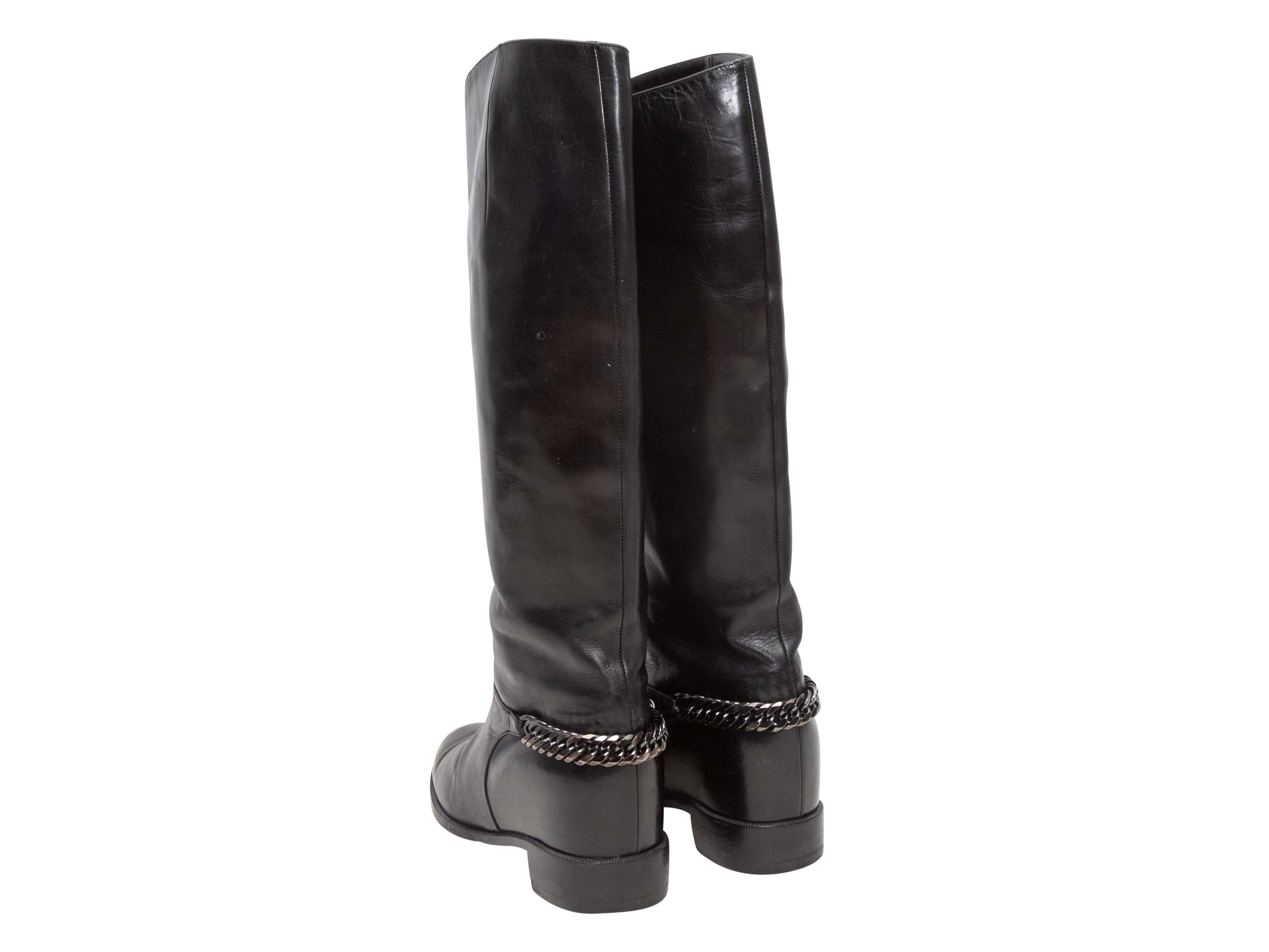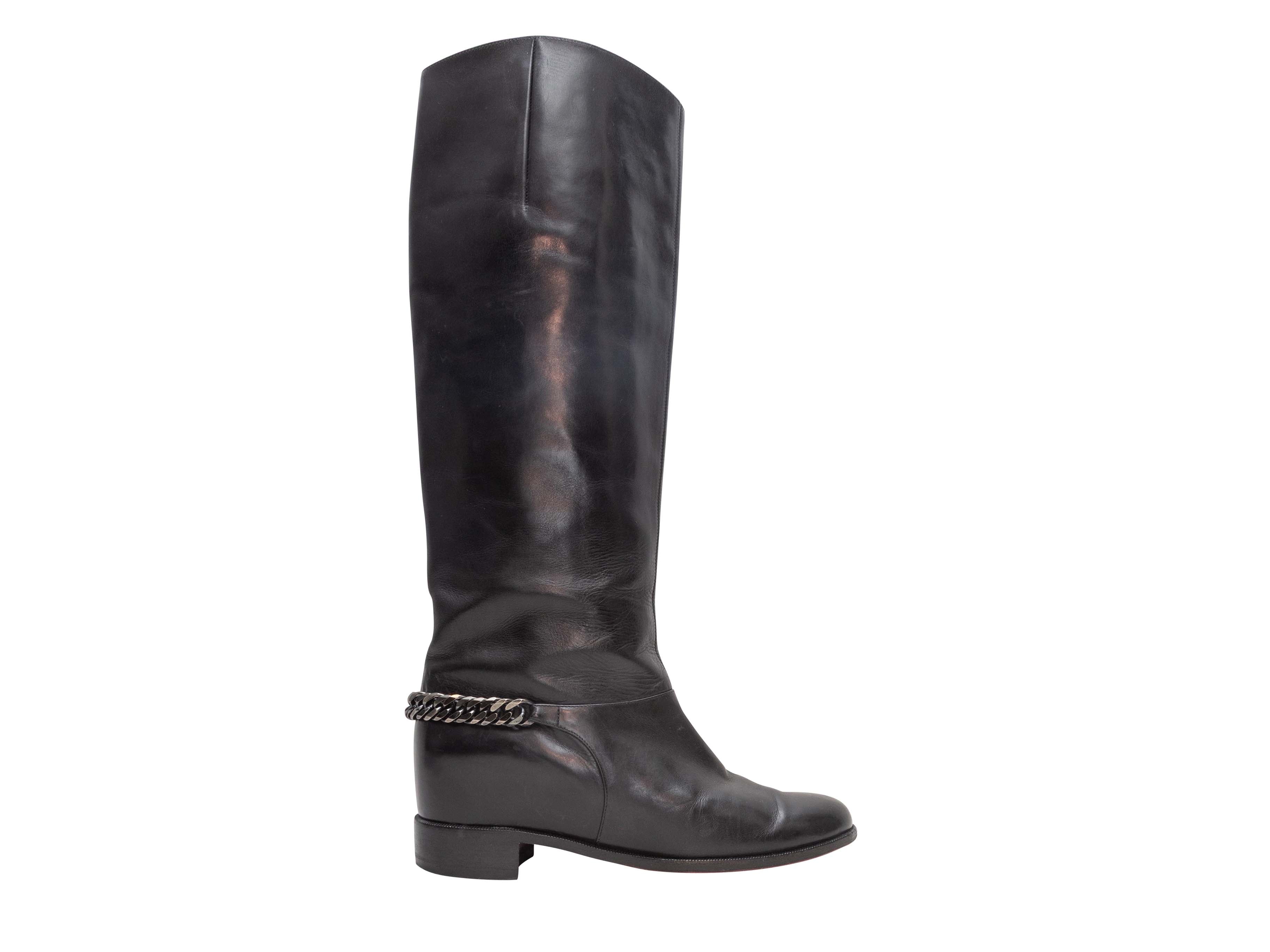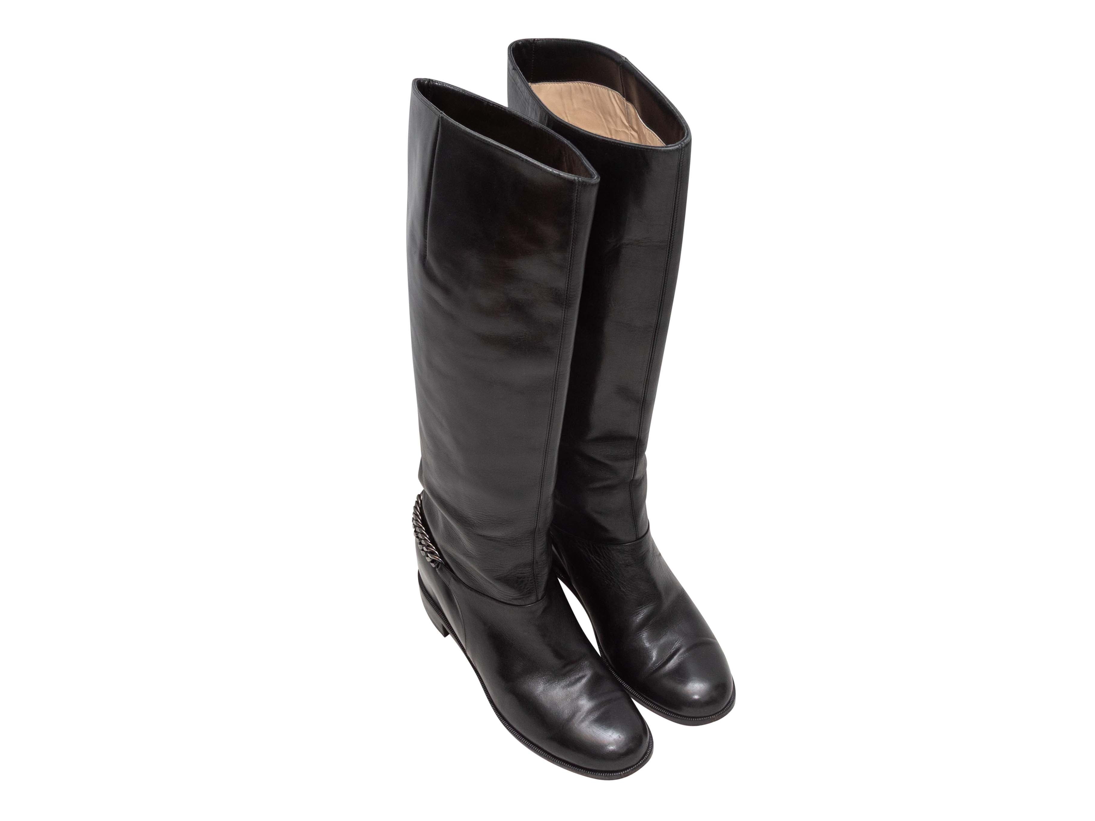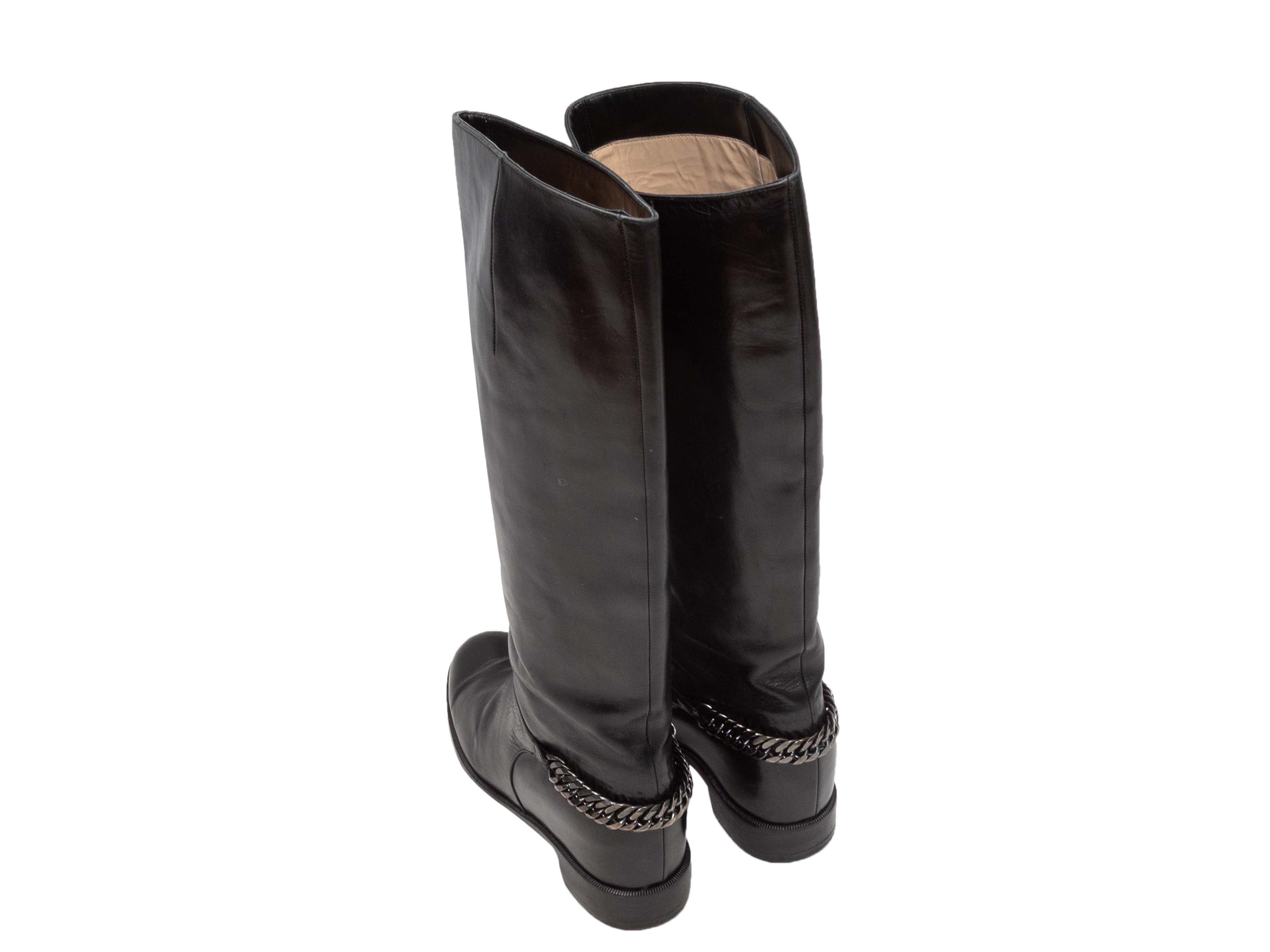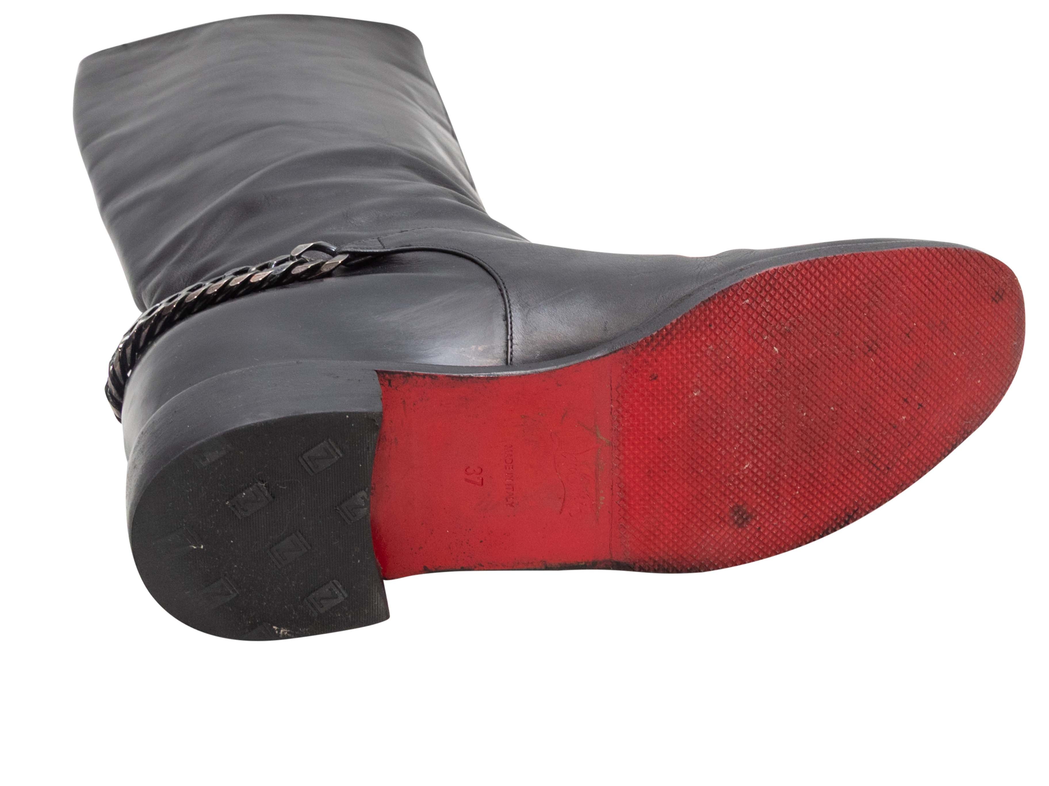 Product Details: Black leather knee-high Cate boots by Christian Louboutin. Silver-tone chain-link accents at counters. Stacked heels. 15.5" shaft height, 1" heel height.