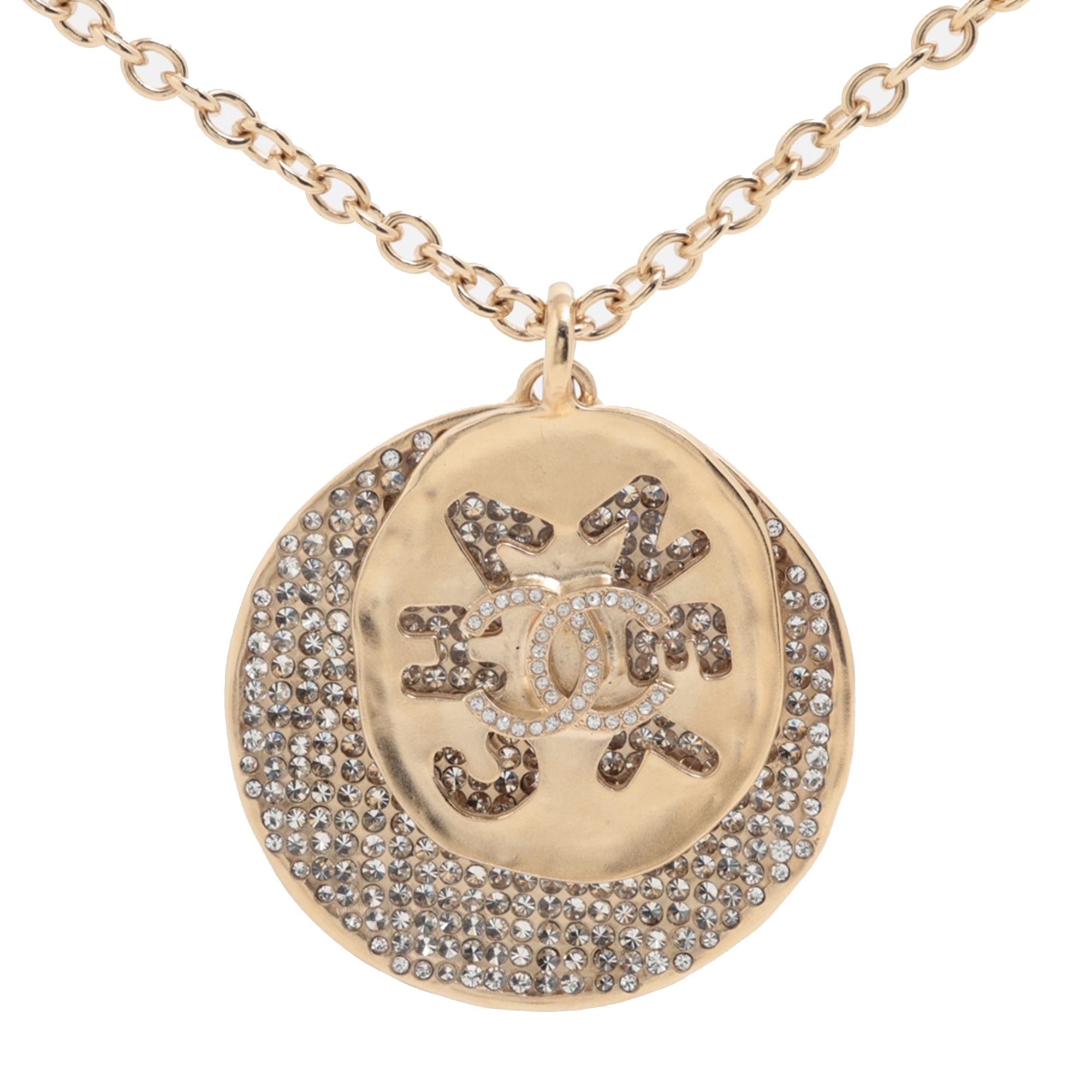 Gold Chanel CC Gold Plated Rhinestone Embellished Round Logo Pendant Necklace