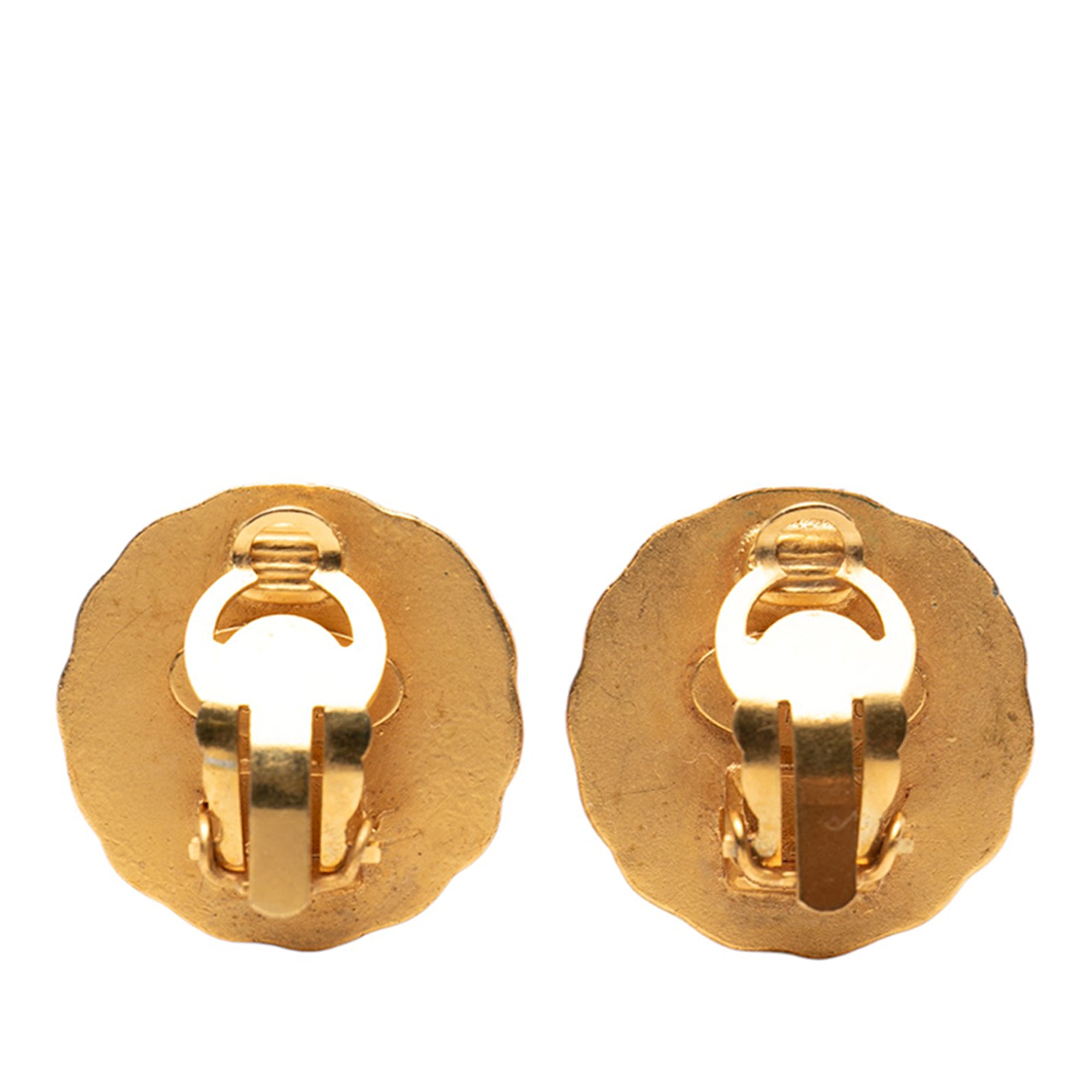 Product Details: Gold Chanel CC Gold Plated Round Clip On Earrings. These earrings feature a gold-plated metal body and clip on closures. 0.9" L x 0.9" W x 0" D. Serial number 93A.