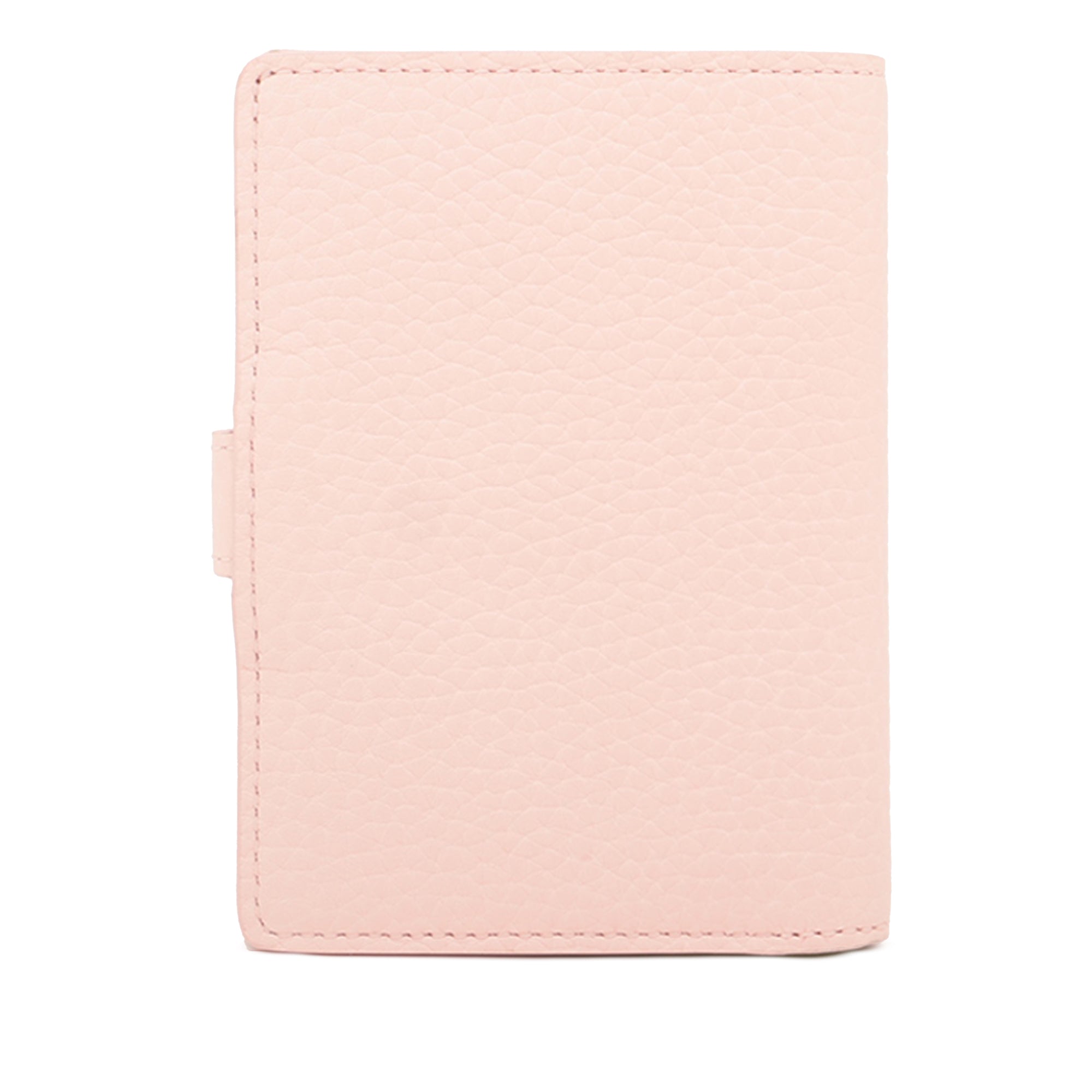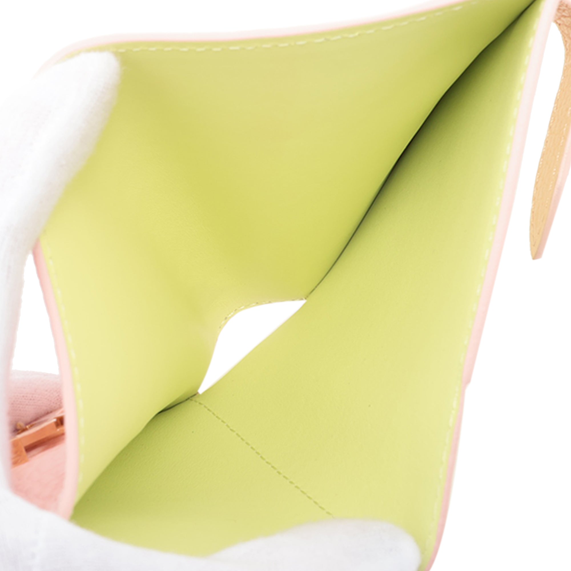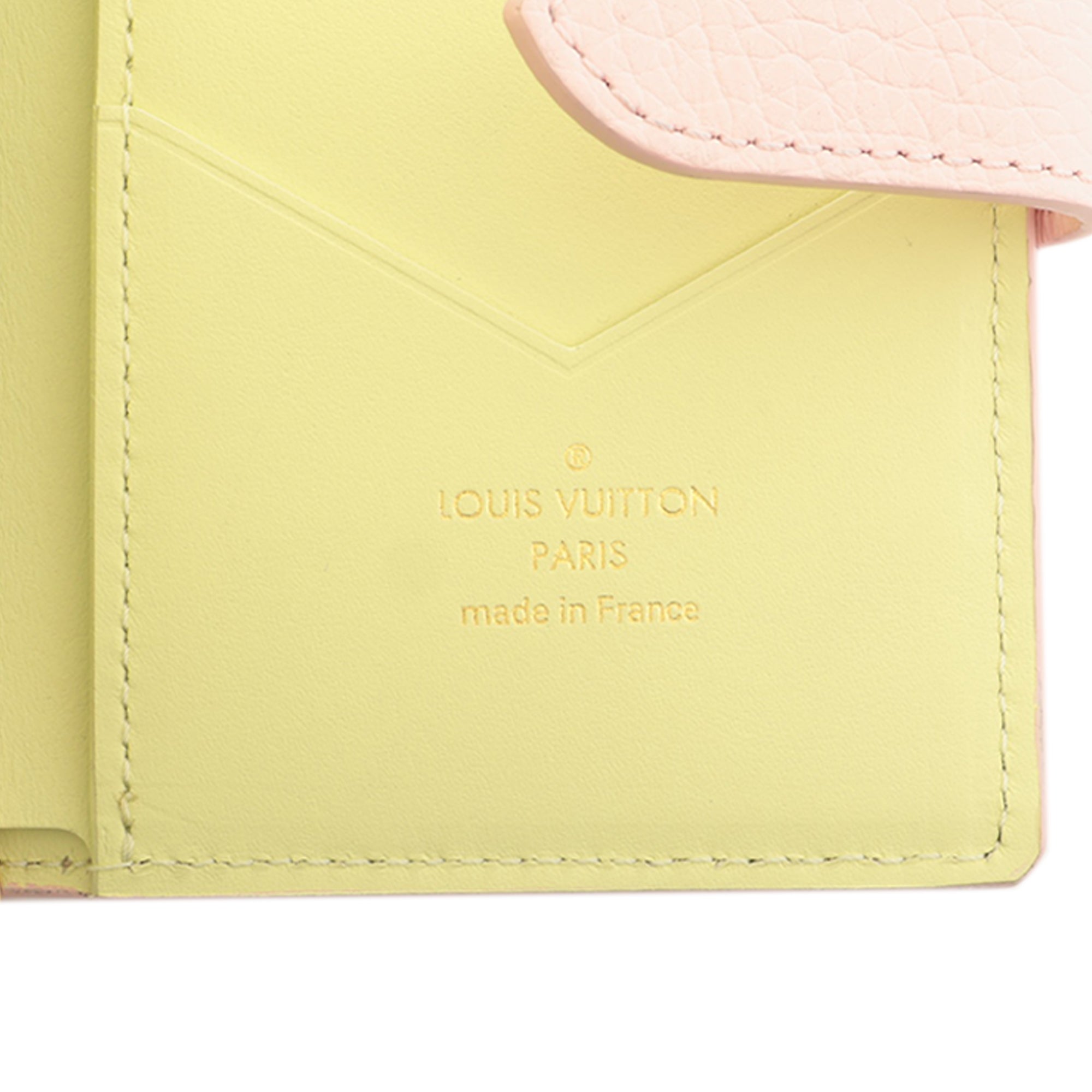 Product Details: Pink Louis Vuitton Taurillon Capucines Vertical Compact Wallet. This wallet features a taurillon leather body, a strap and snap button closure, and interior zip compartment, slip pockets and card slots. 4.7" L x 3.5" W x 0.8" D.
