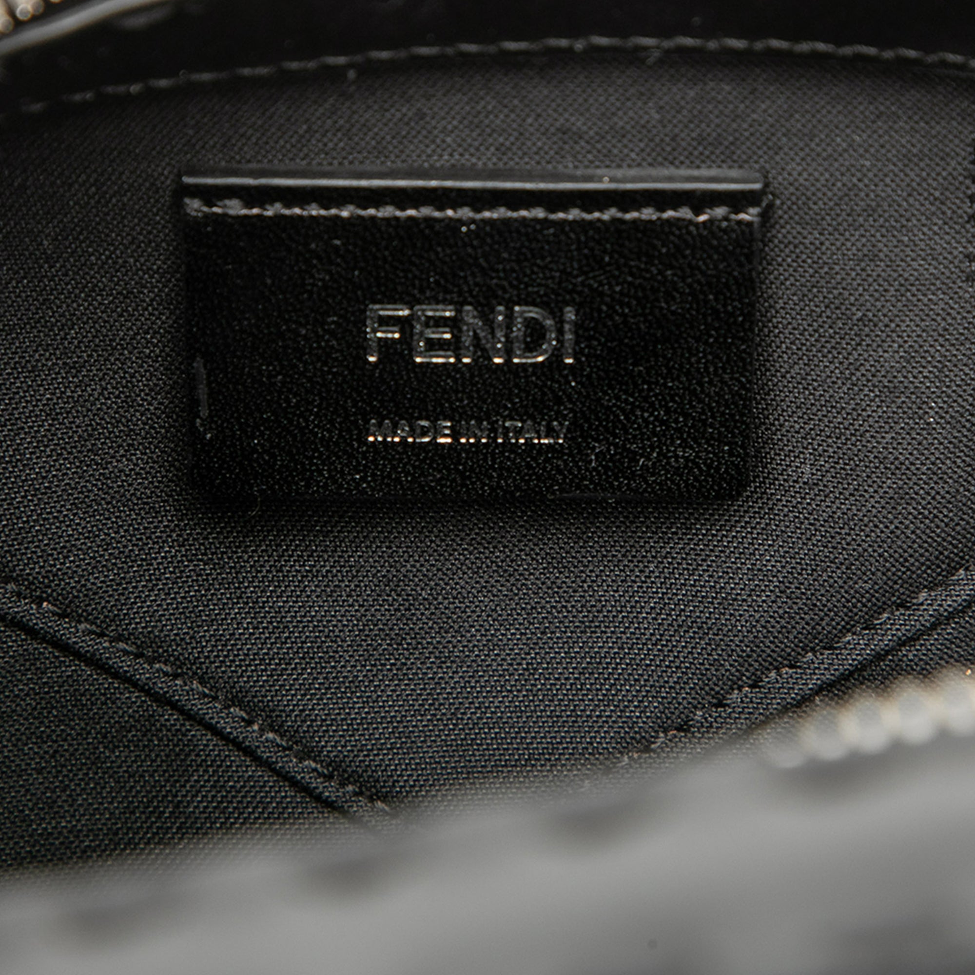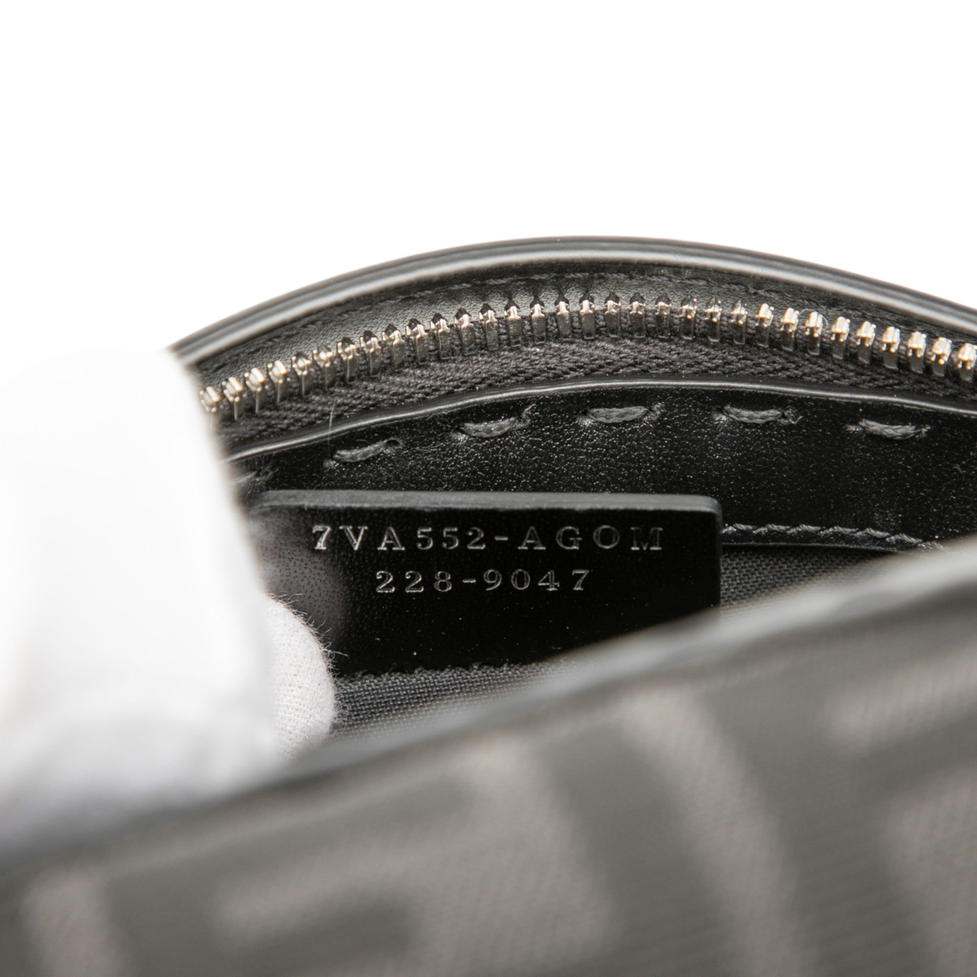 Product Details: Black Fendi Mini Zucca Canvas Suitcase Bag Satchel. This satchel features a canvas body with leather trim, a flat leather handle, a detachable flat strap, and a zip around closure. 5.1" L x 7.1" W x 3.9" D, 1.2" drop. Serial number 7VA552 AGOM 228 9047.
