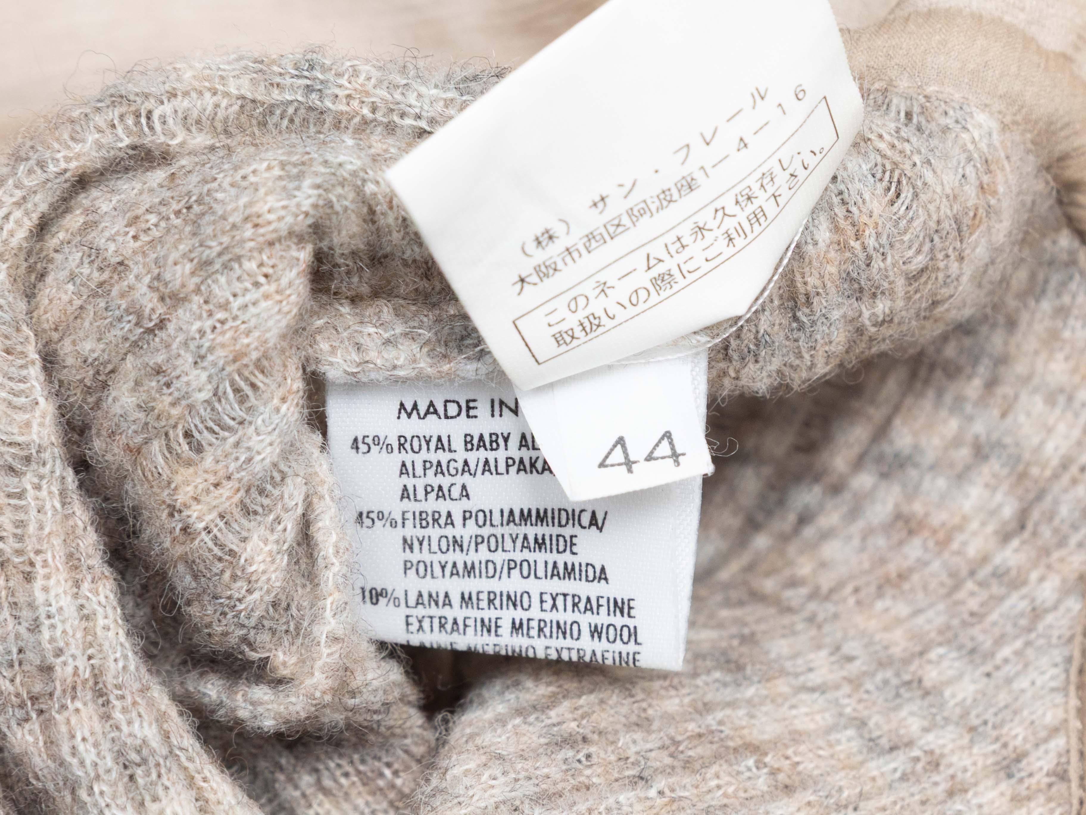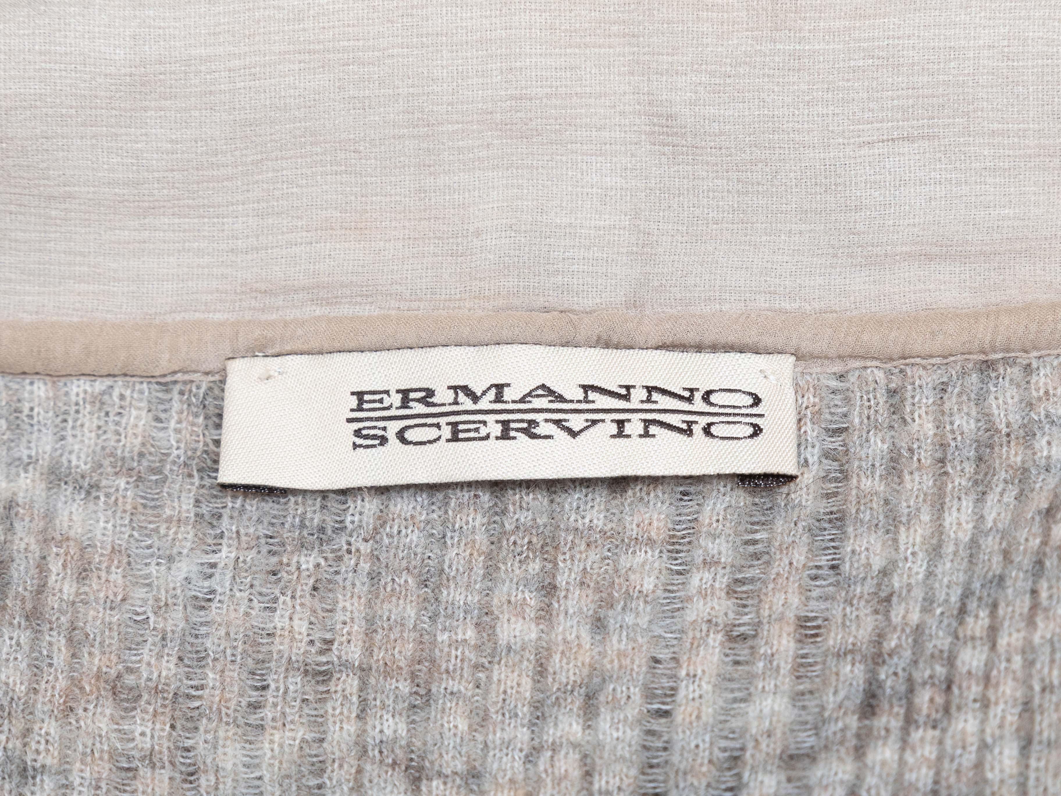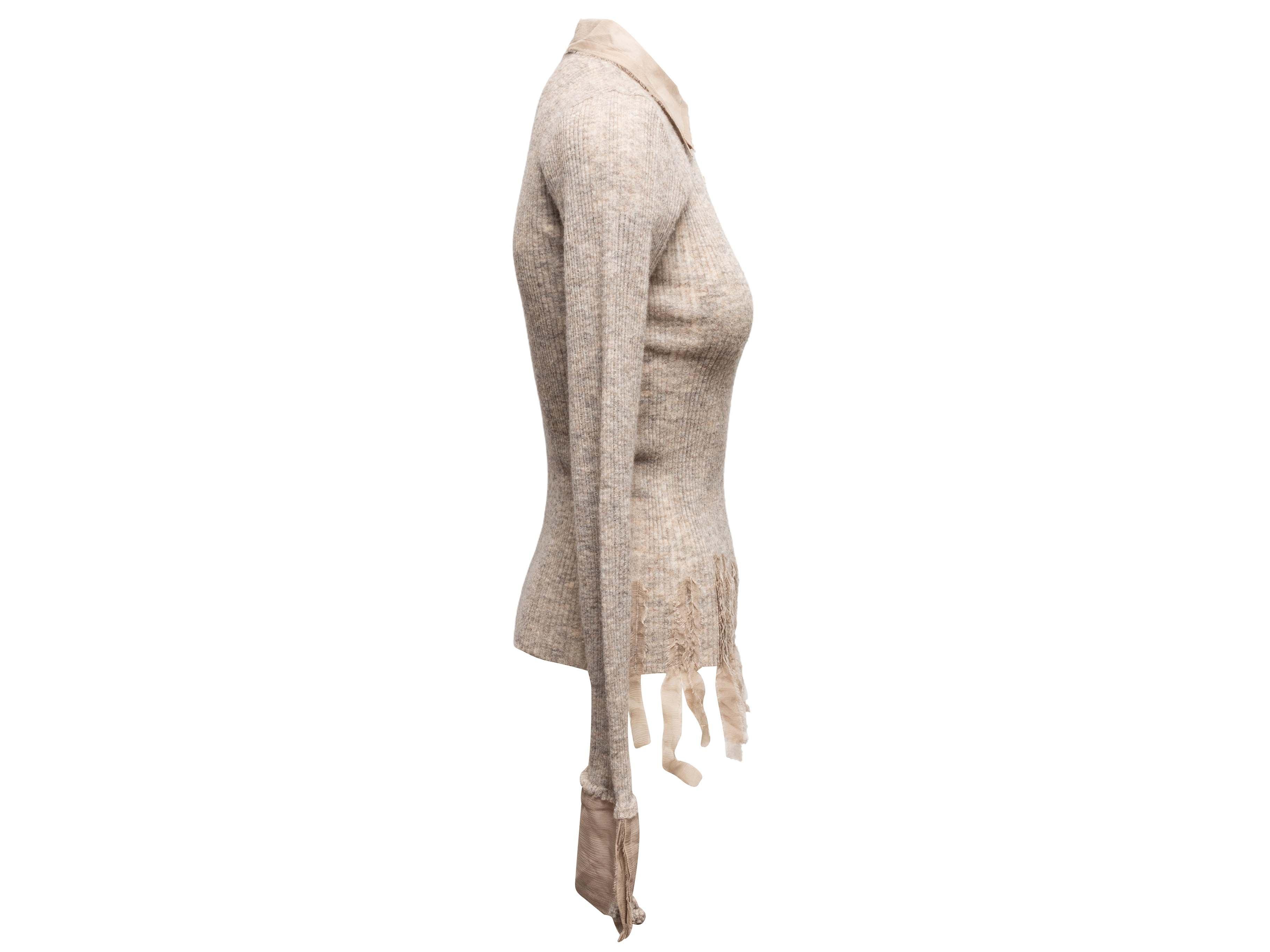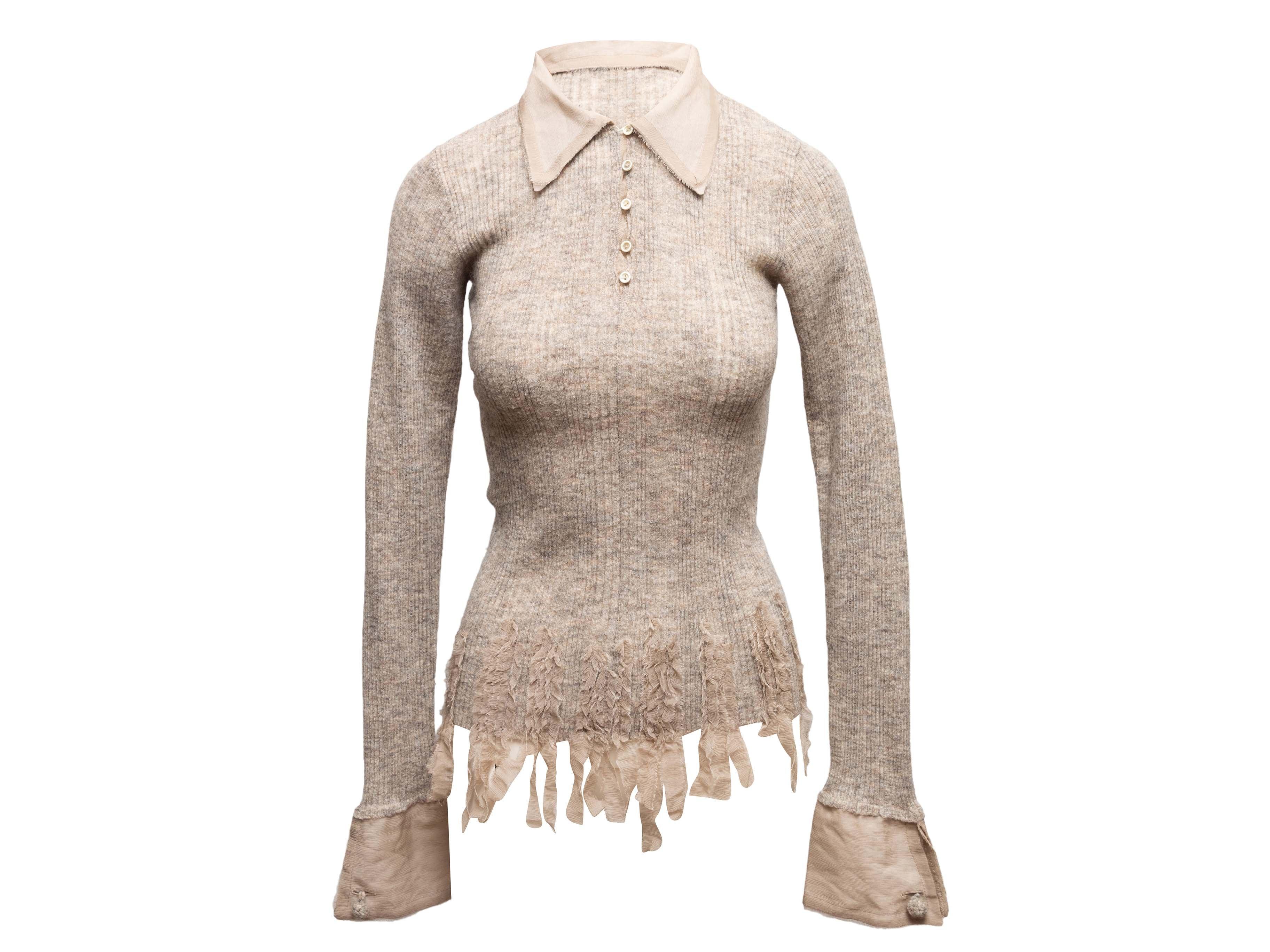 Product Details: Beige baby alpaca-blend collared sweater by Ermanno Scervino. Pointed collar. Fringe trim at hem. Button closures at front bodice. 26" bust, 15" shoulder width, 27" length.