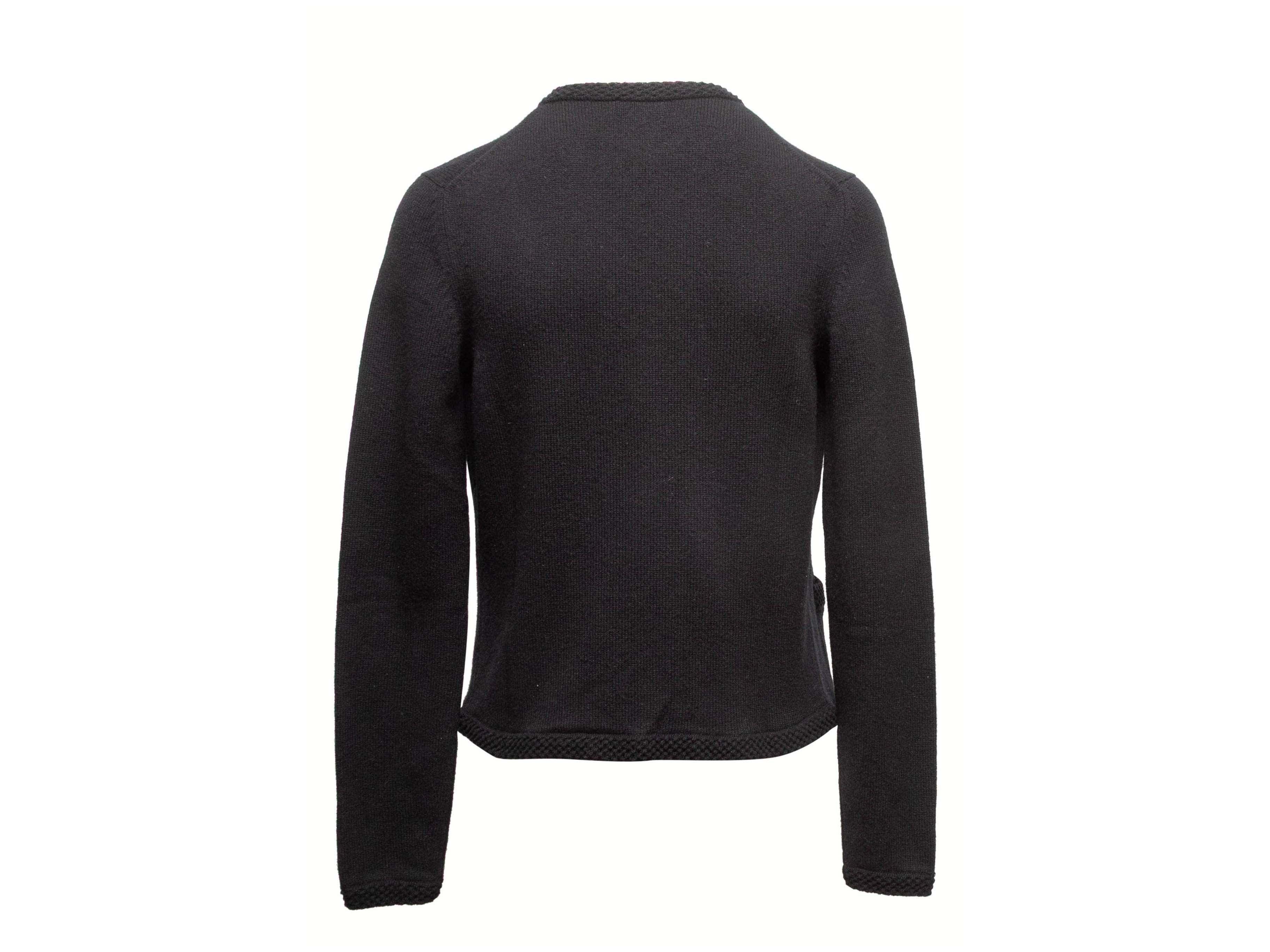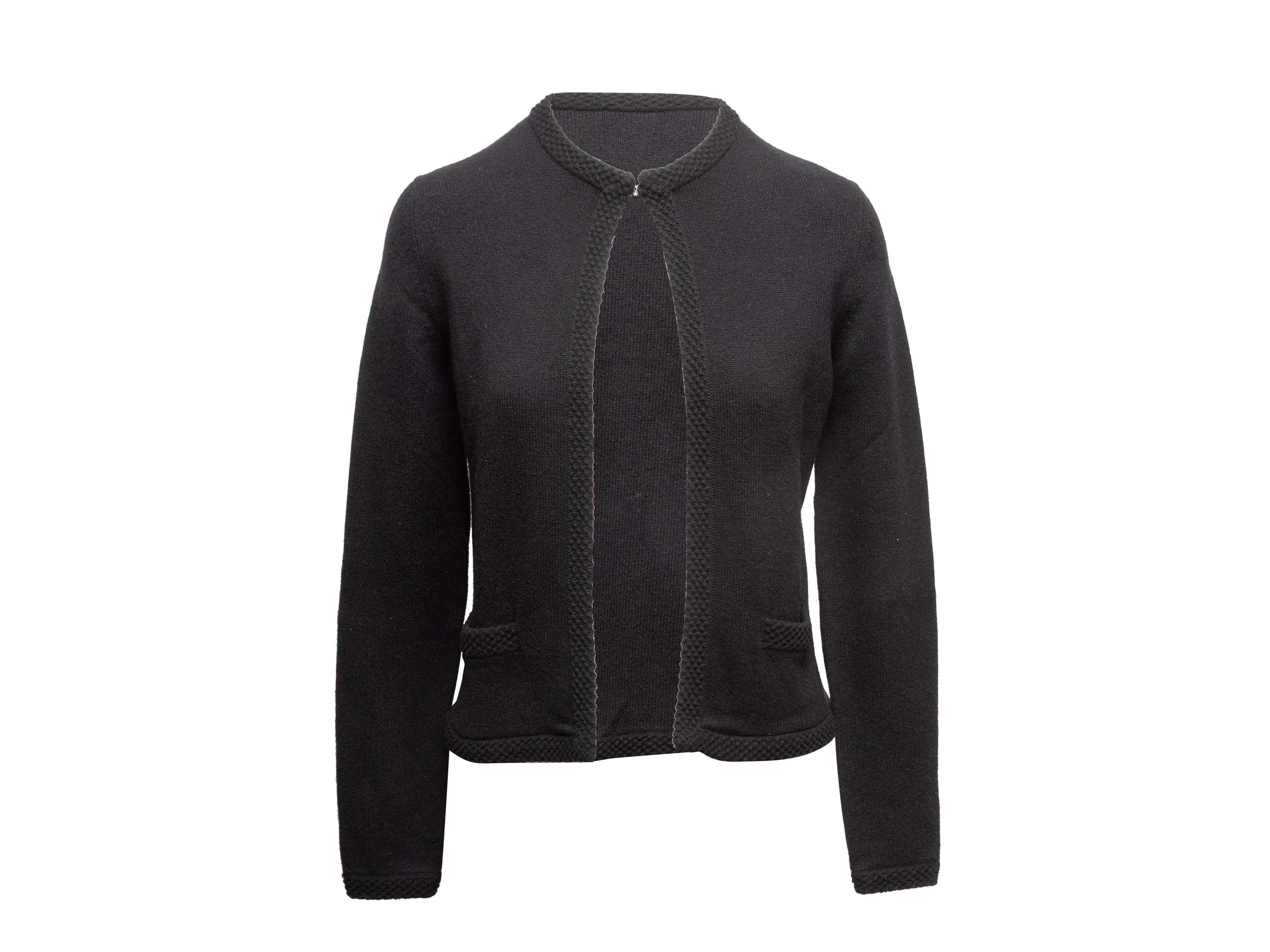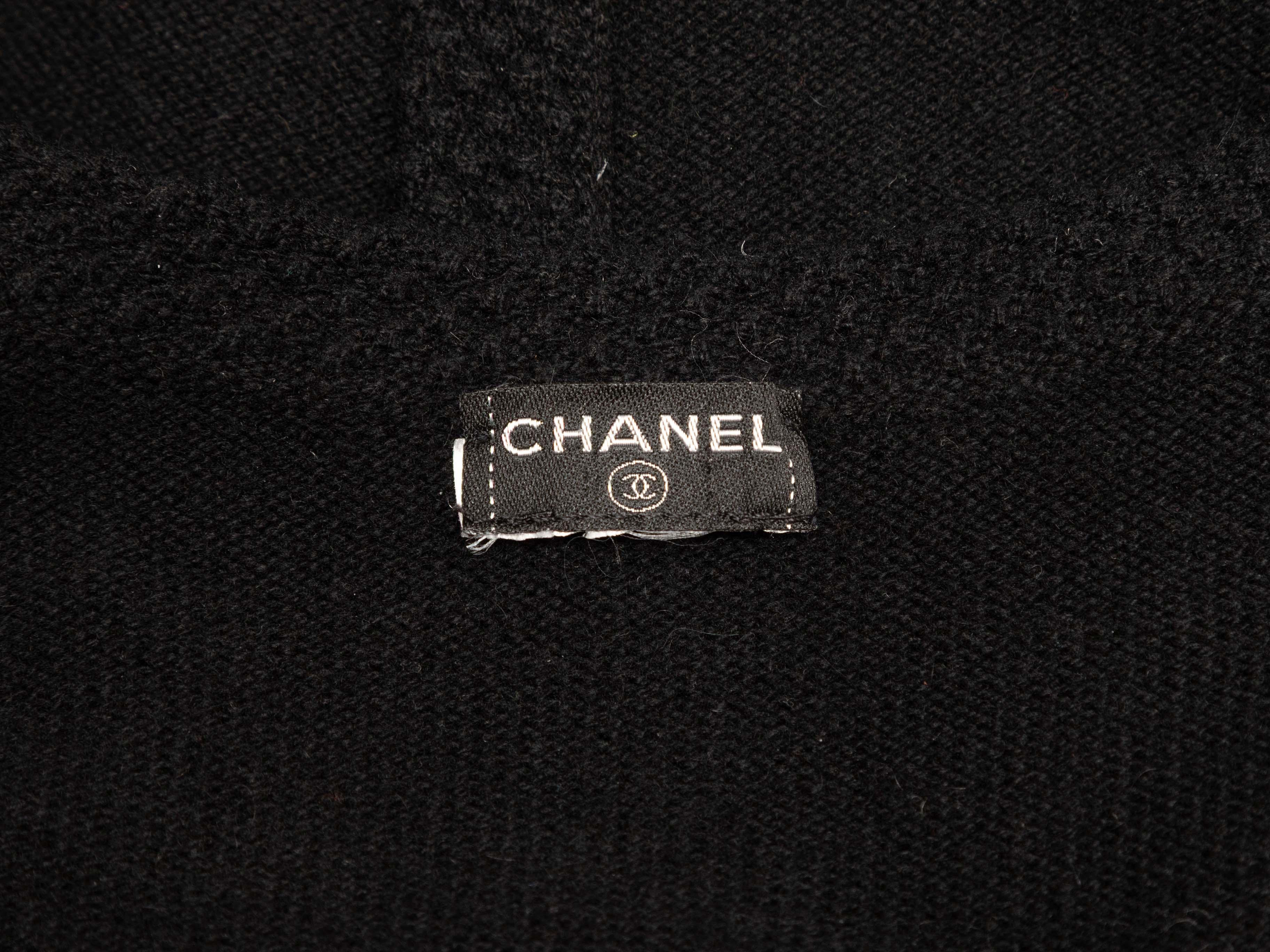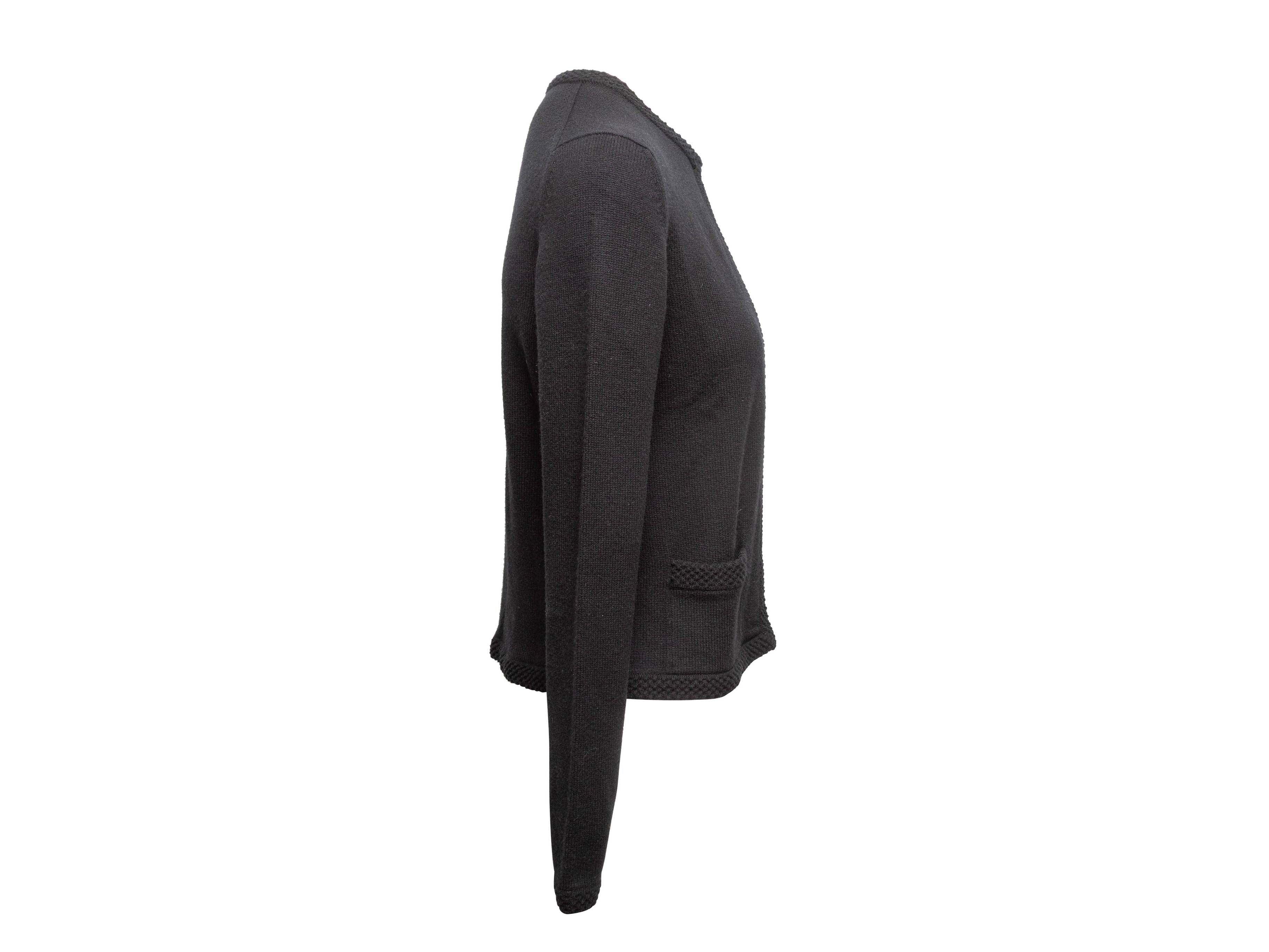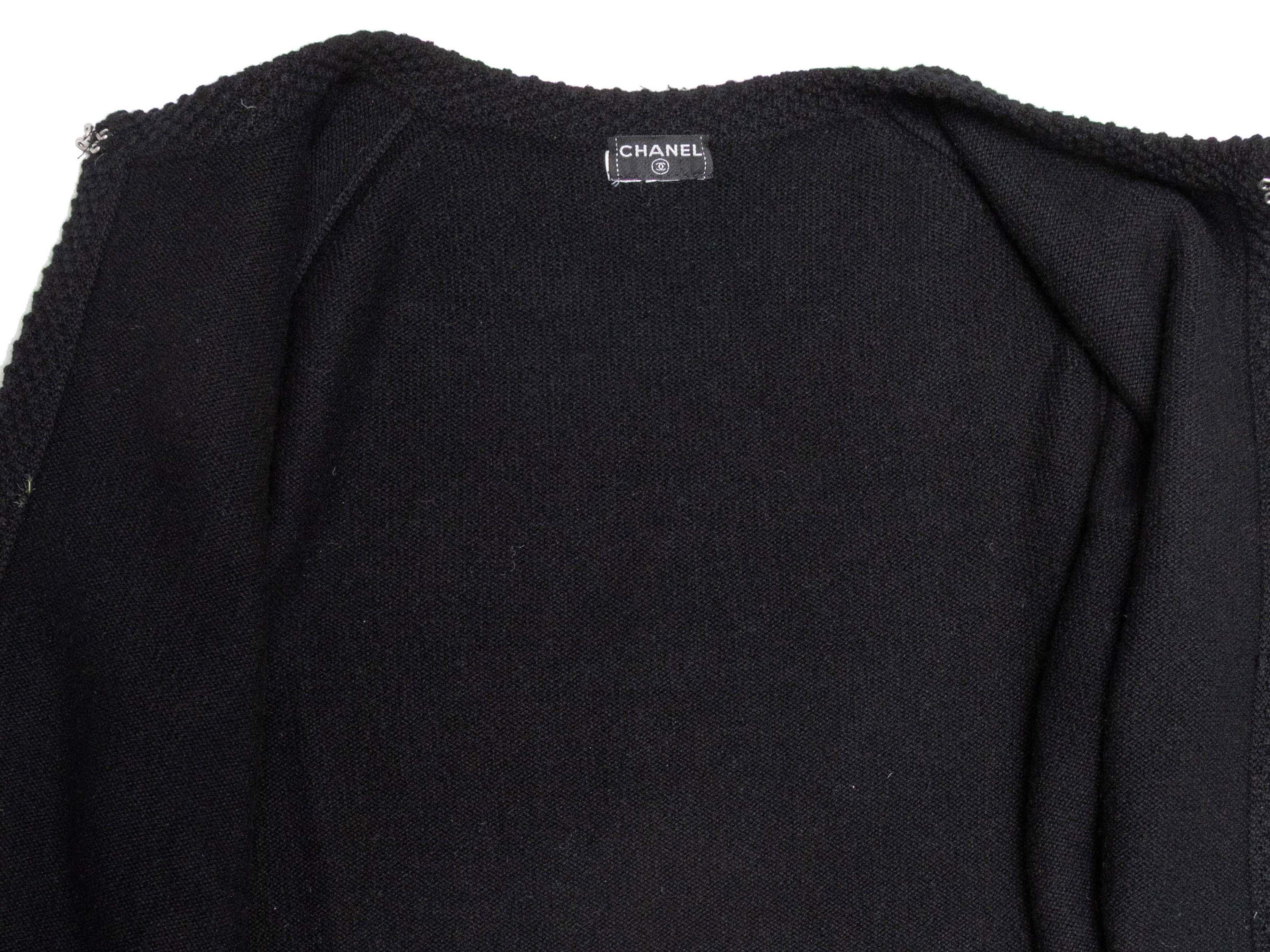 Product Details: Black cashmere cardigan by Chanel. Crew neck. Dual hip pockets. Front hook-and-eye closure. 32" bust, 14" shoulder width, 22" length.