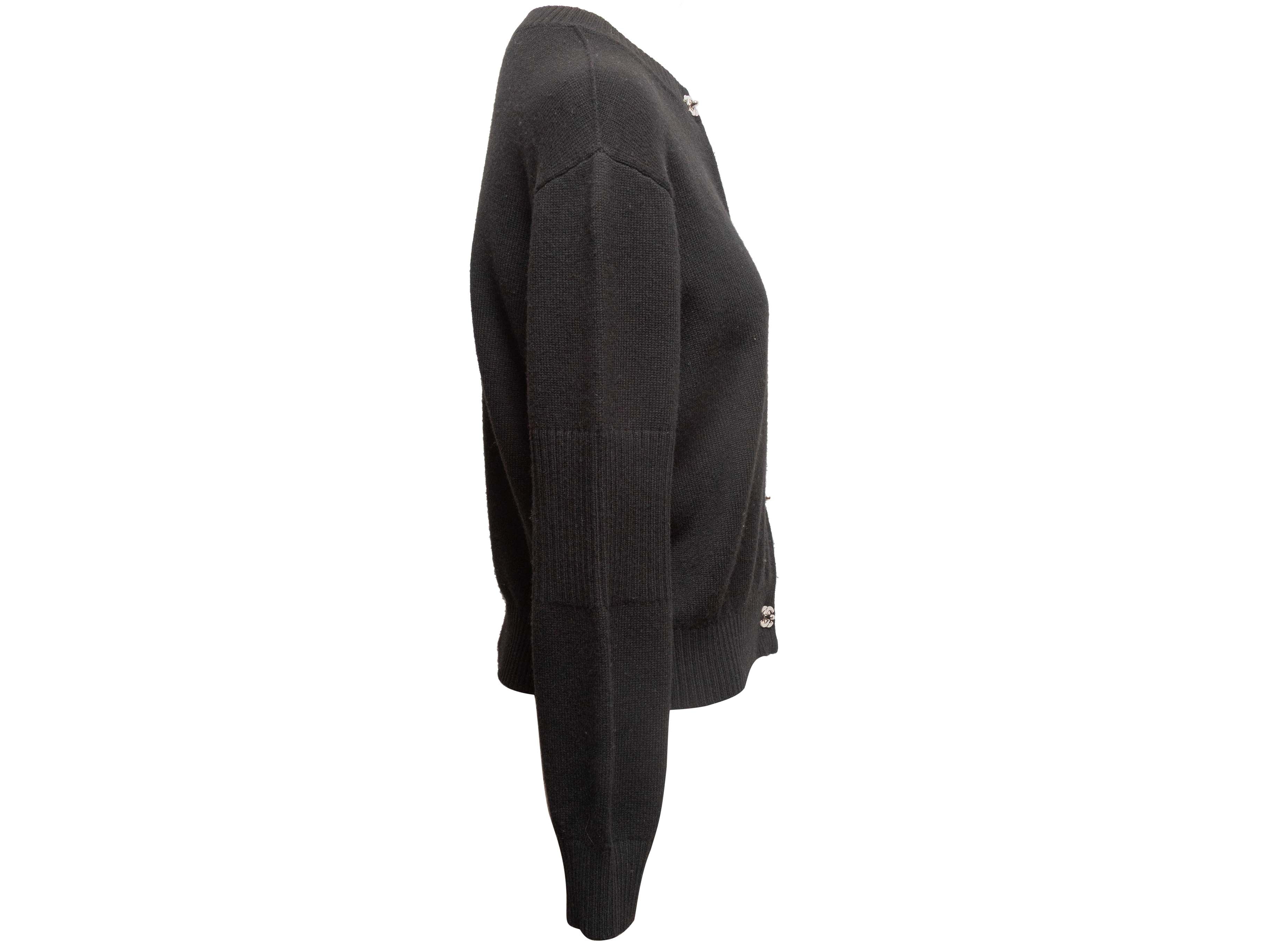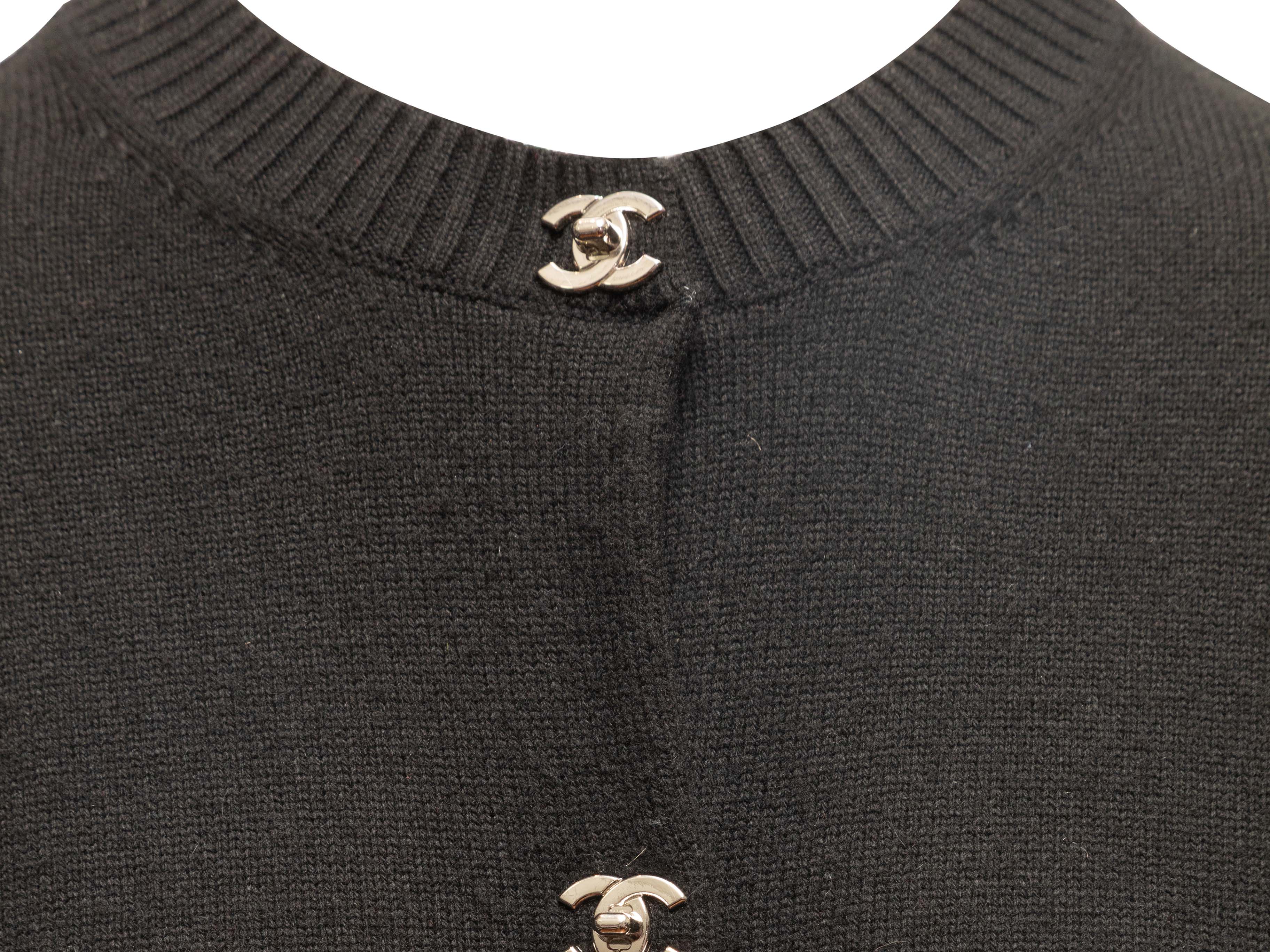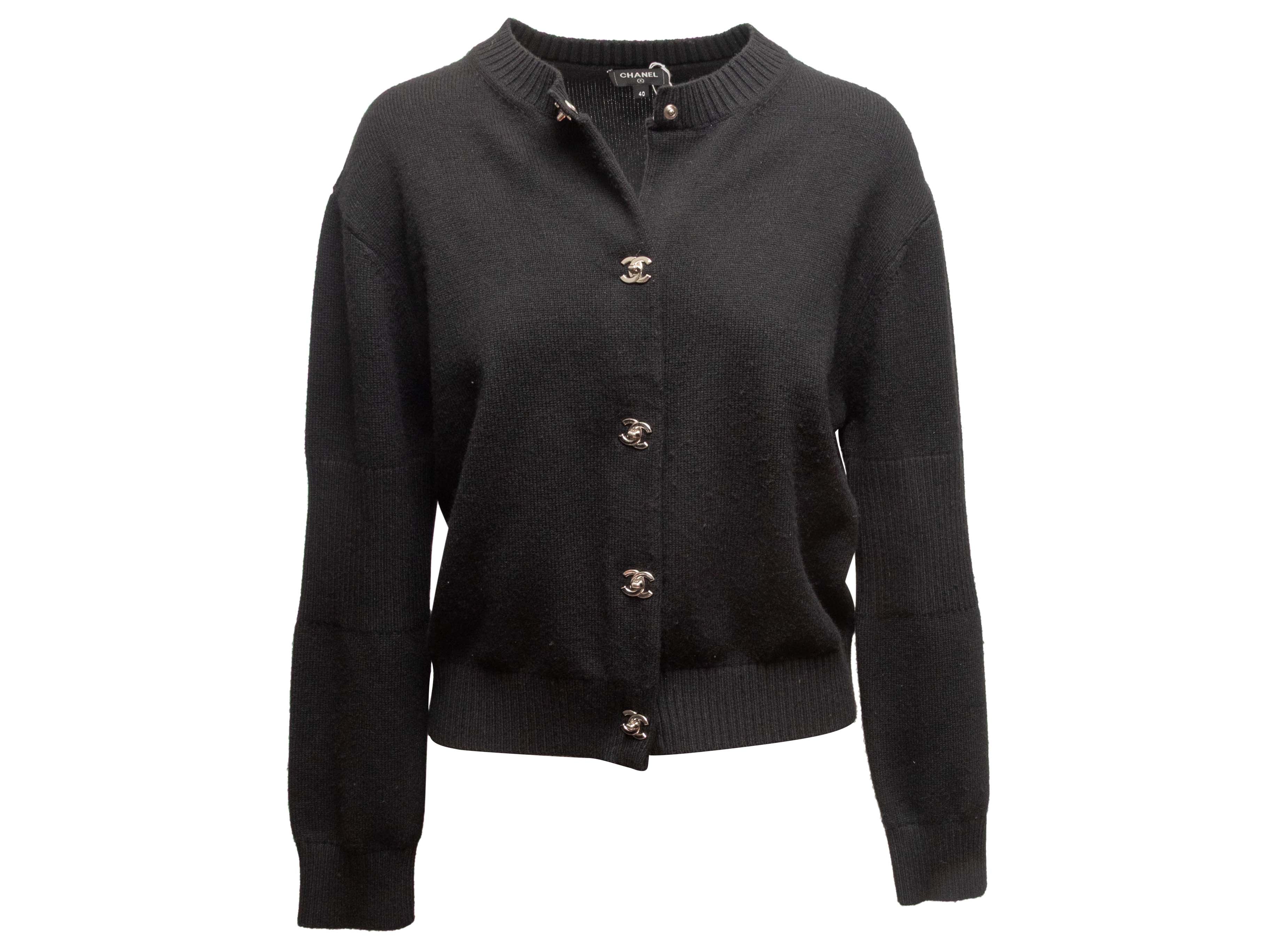 Product Details: Black cashmere cardigan by Chanel. Crew neck. Silver-tone CC turn-lock closures at front. 40" bust, 14" shoulder width, 21" length.