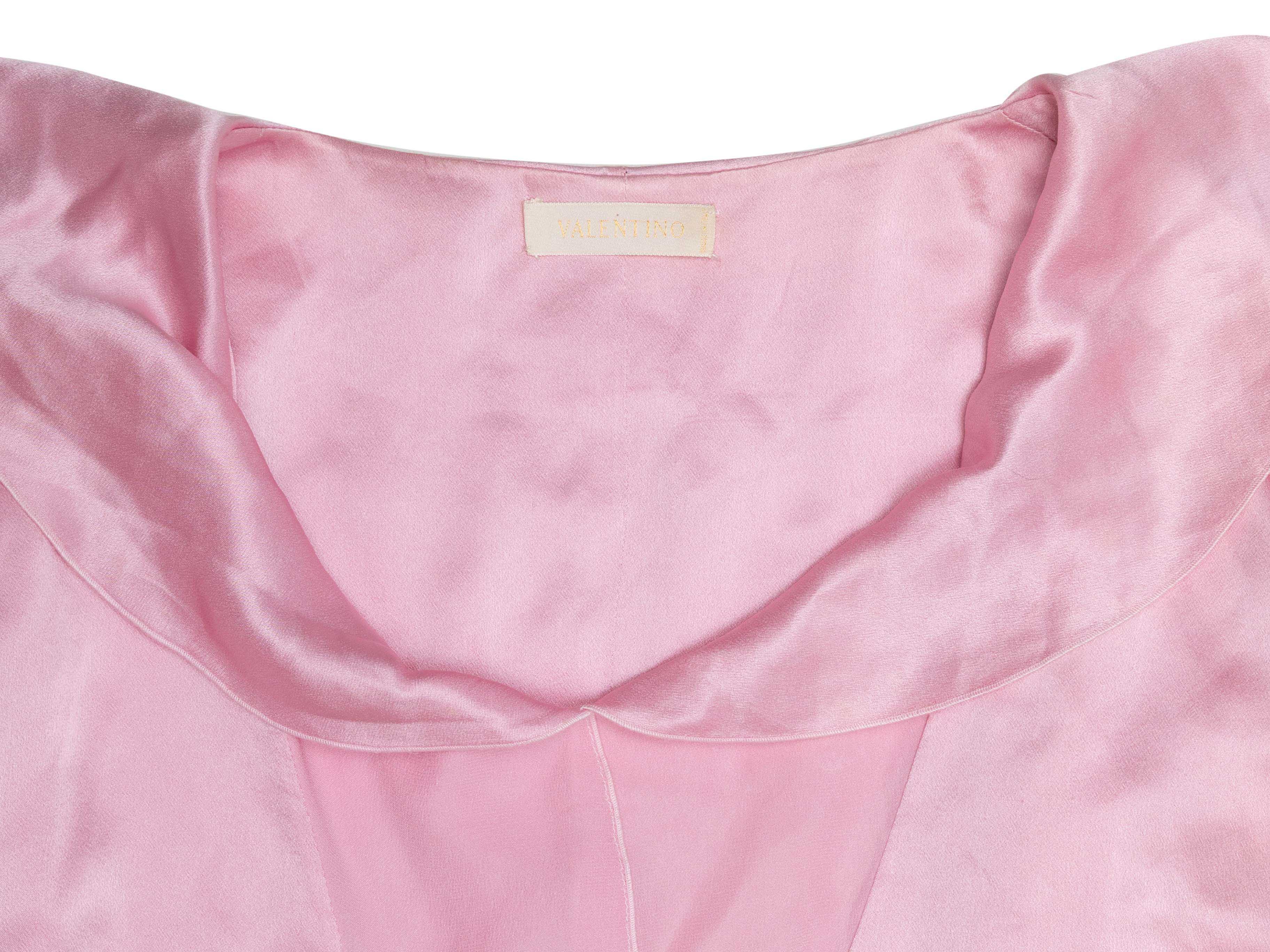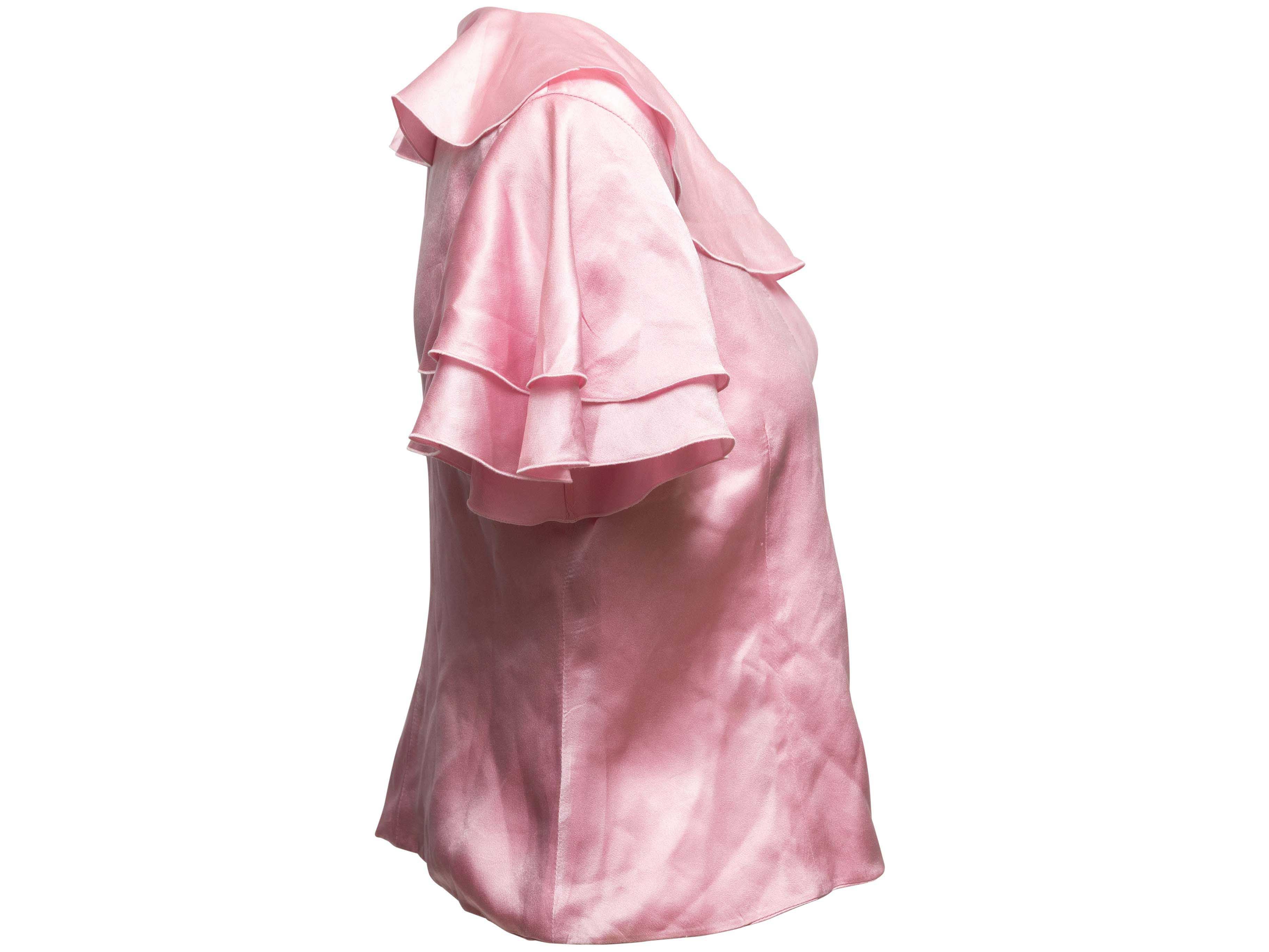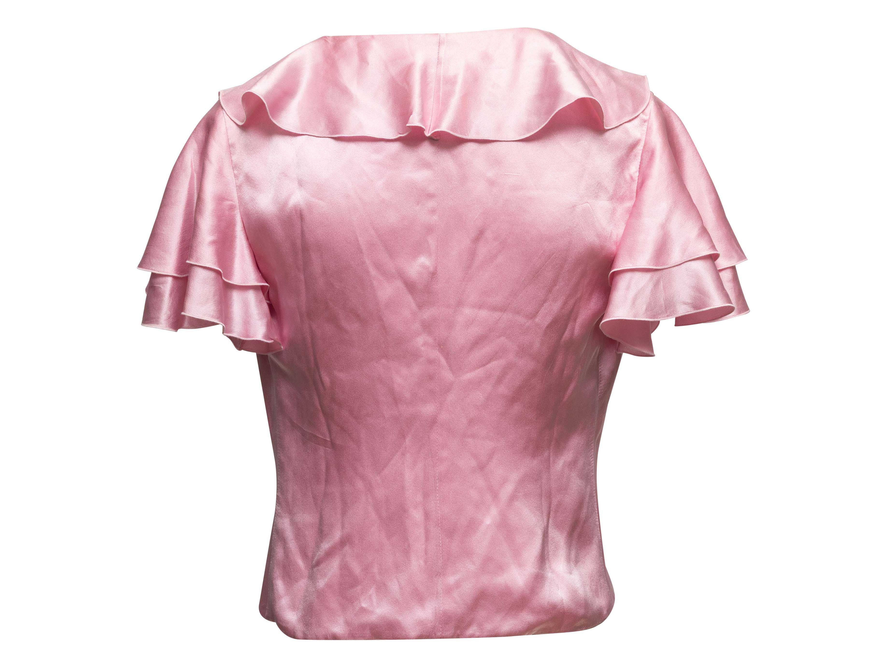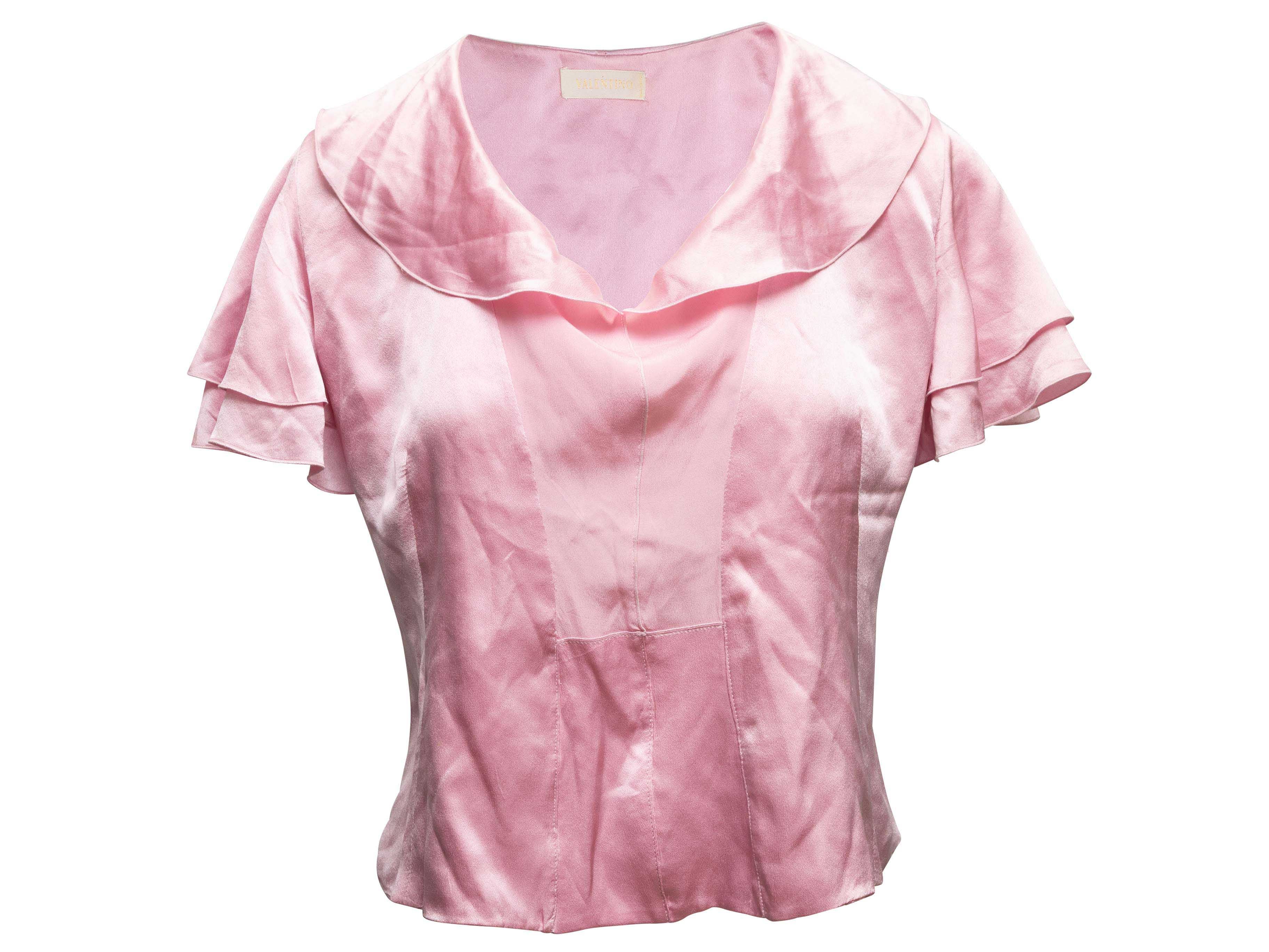 Product Details: Pink short sleeve silk blouse by Valentino. V-neck. Peter Pan collar. Ruffle sleeves. 36" bust, 15" shoulder width, 20" length.