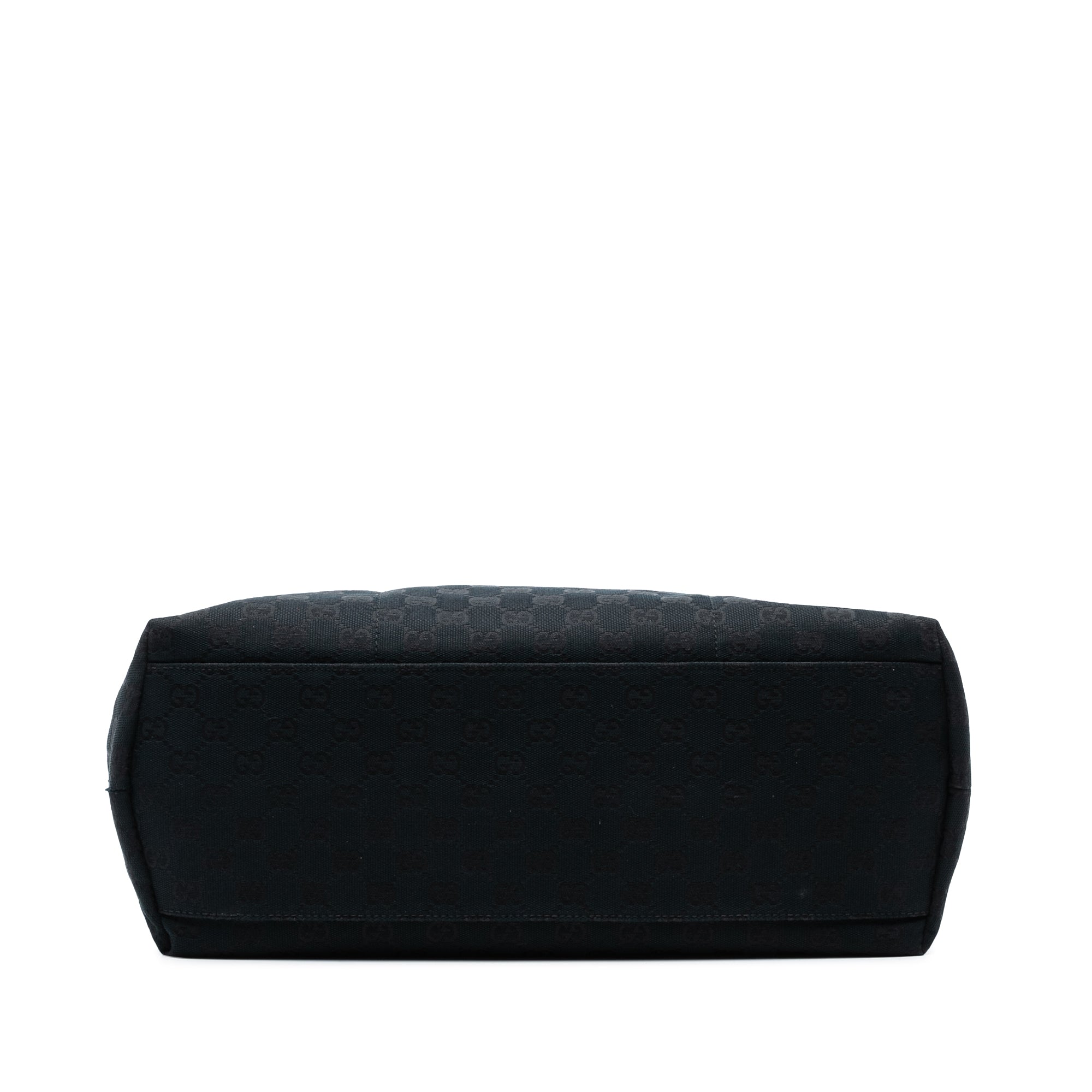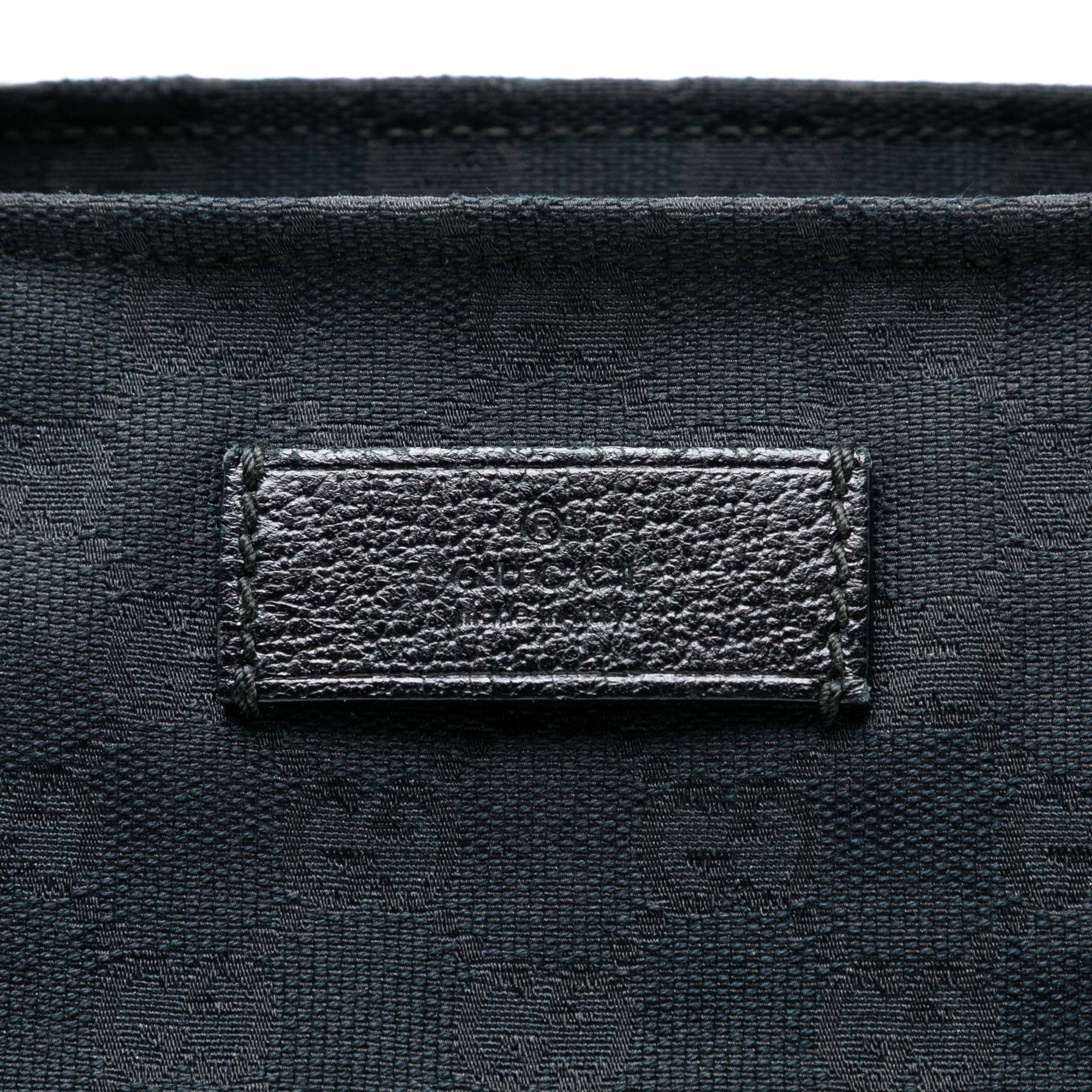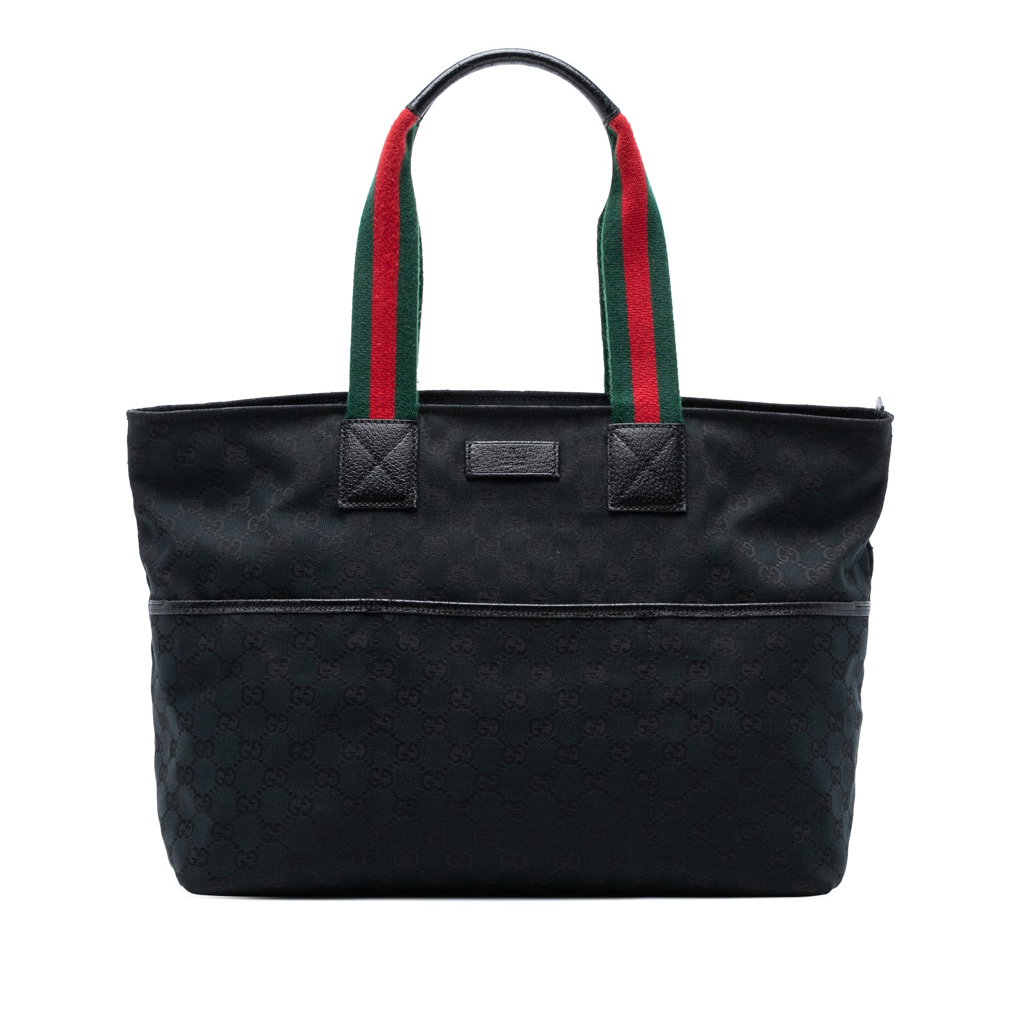 Product Details: Black Gucci GG Canvas Web Tote. This tote bag features a canvas body with leather trim, flat web canvas and leather shoulder straps, a top zip closure, front exterior slip pocket, and an interior zip pocket. 11.8" L x 14.8" W x 4.7" D, 8.7" drop. Serial number 155524 520981.