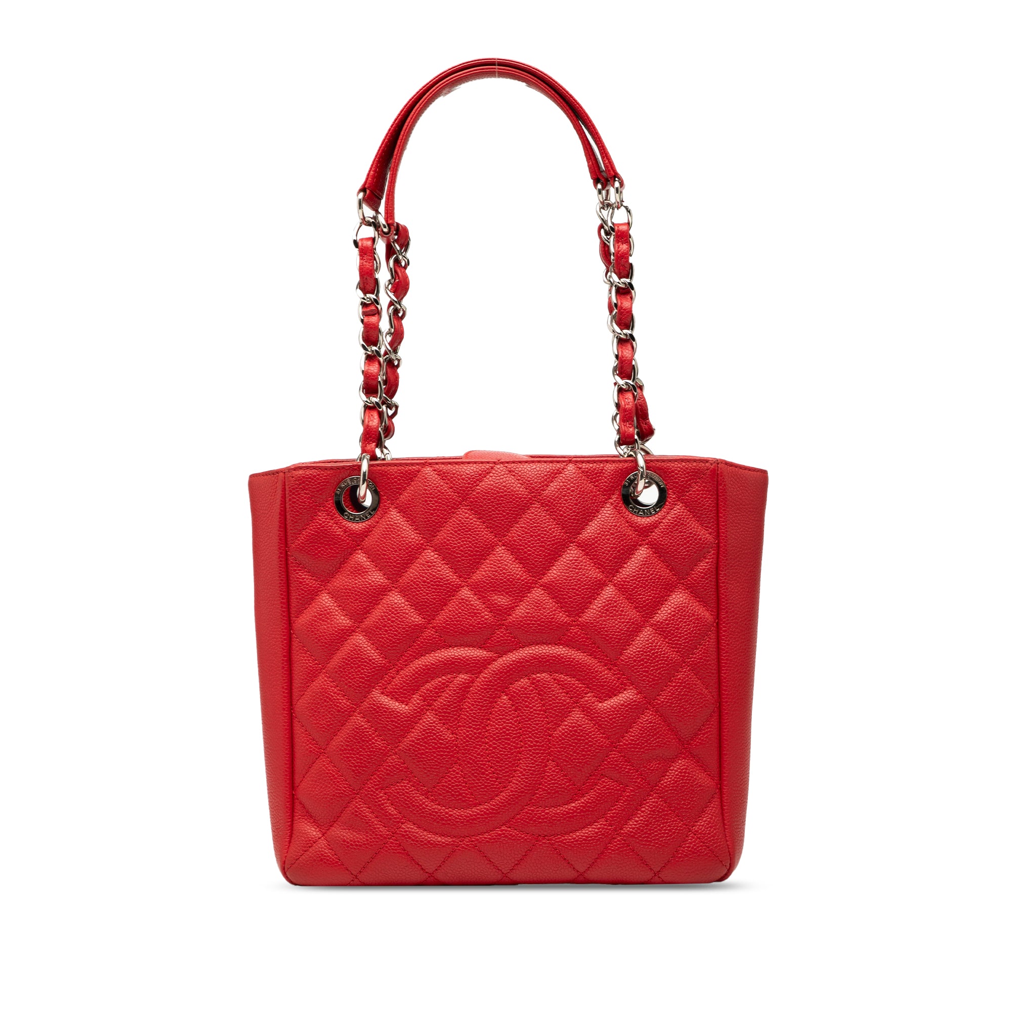 Product Details: Red Chanel Caviar Petite Shopping Tote. This tote features a quilted caviar leather body, leather woven chain shoulder straps with leather guard, an open top with magnetic snap closure, an exterior slip pocket, and interior zip and slip pockets. 9.1" L x 9.4" W x 3.1" D, 9.6" drop. Serial number 18887595.