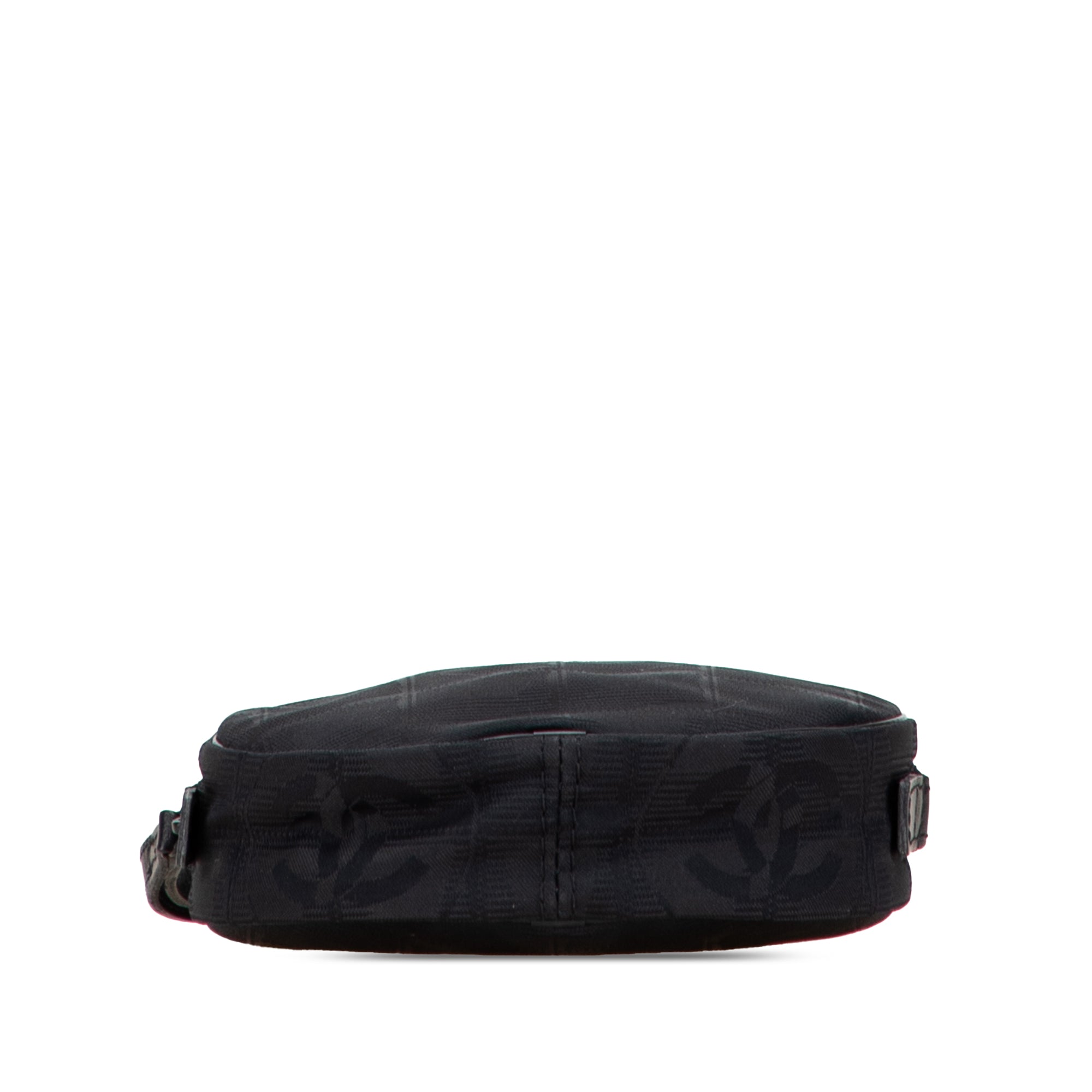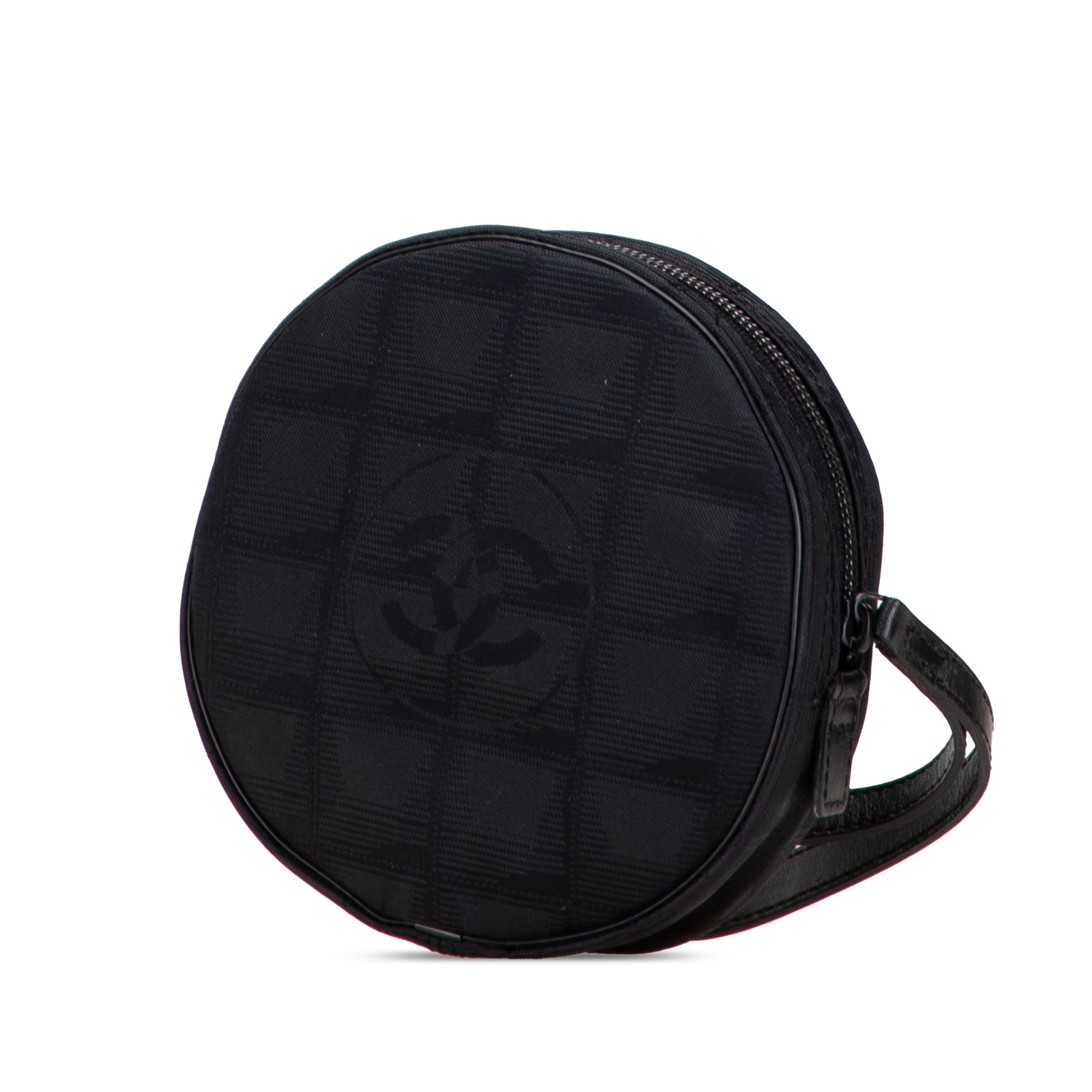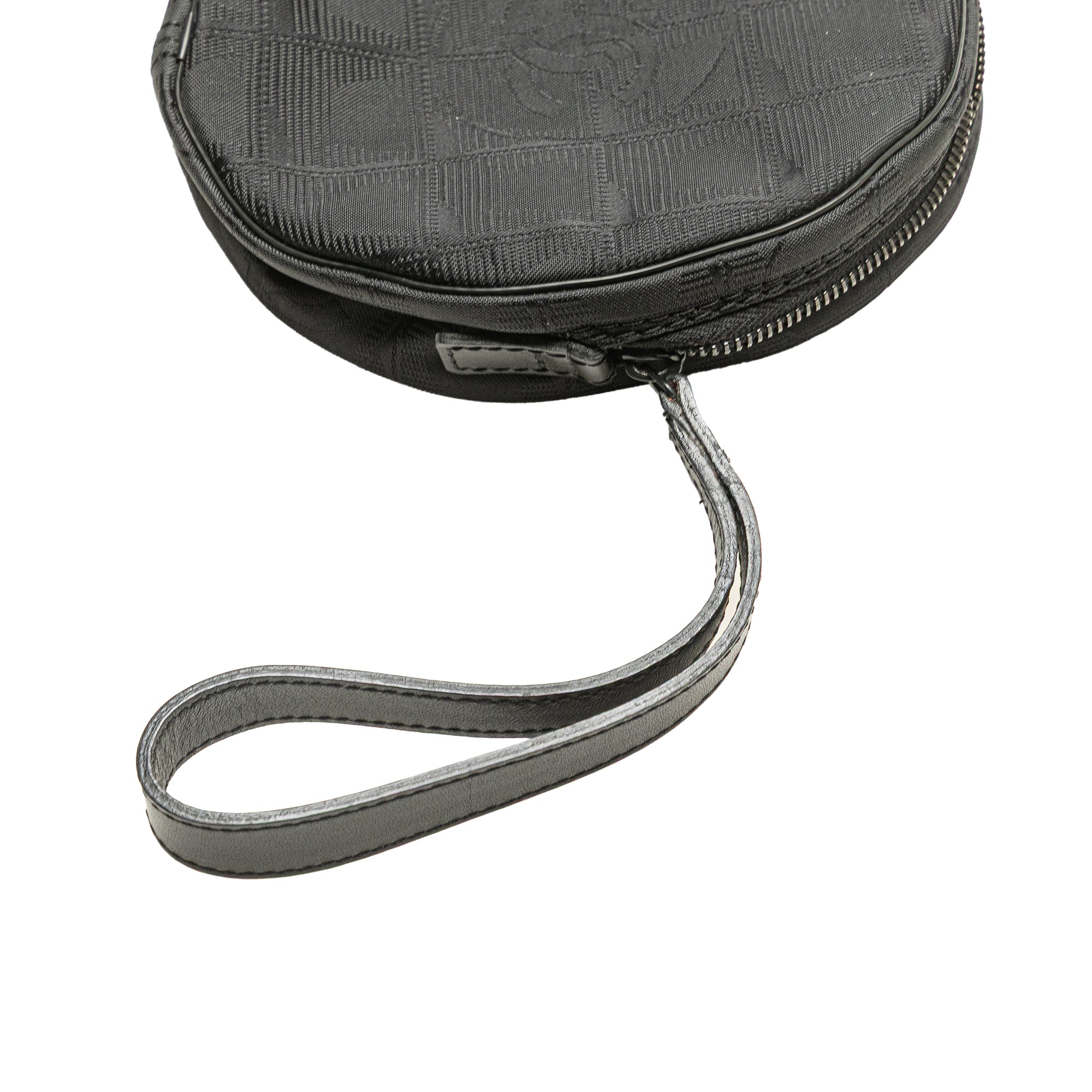 Product Details: Black Chanel New Travel Line Nylon Round Pouch. This pouch features a nylon body, a flat leather wrist strap, a top zip closure, and an interior slip pocket. 5.5" L x 5.5" W x 1.4" D, 4.9" drop. Serial number 7240225.