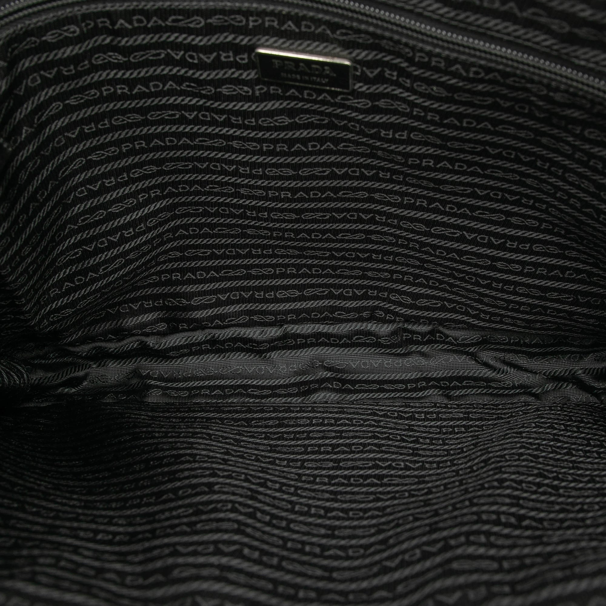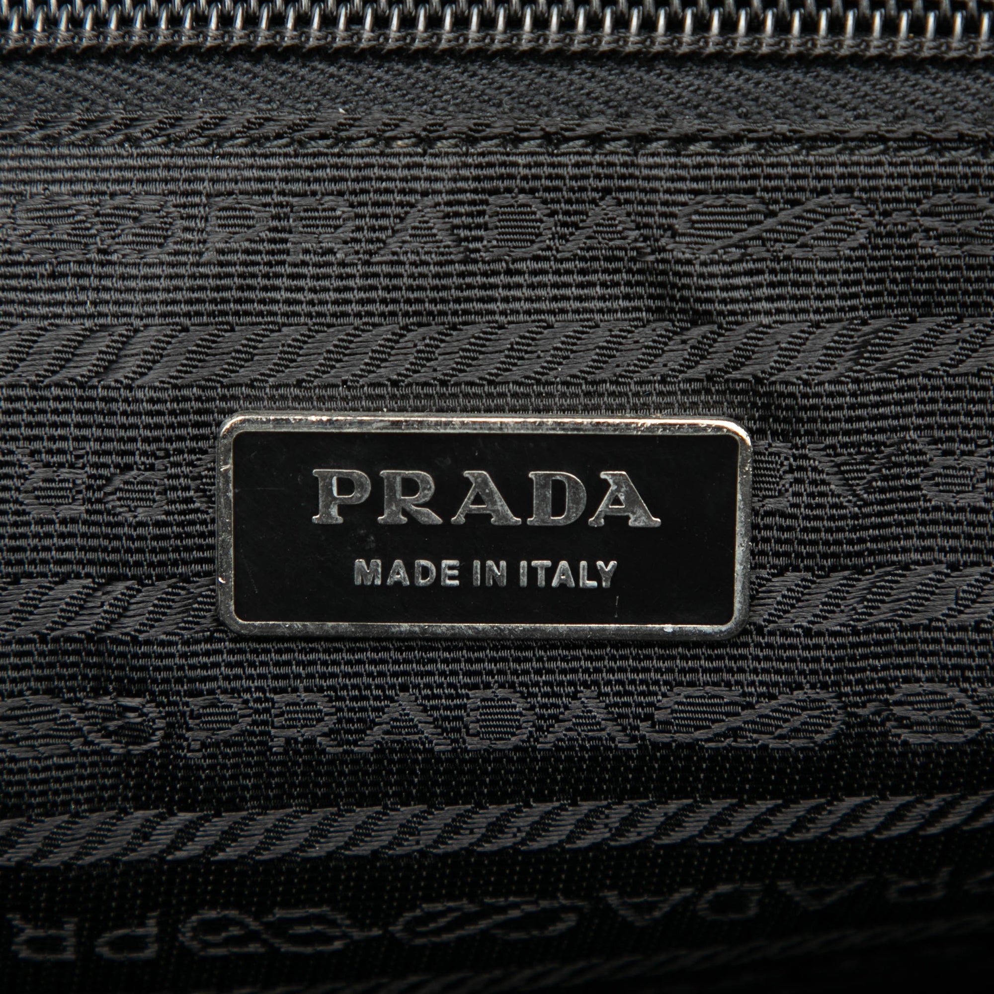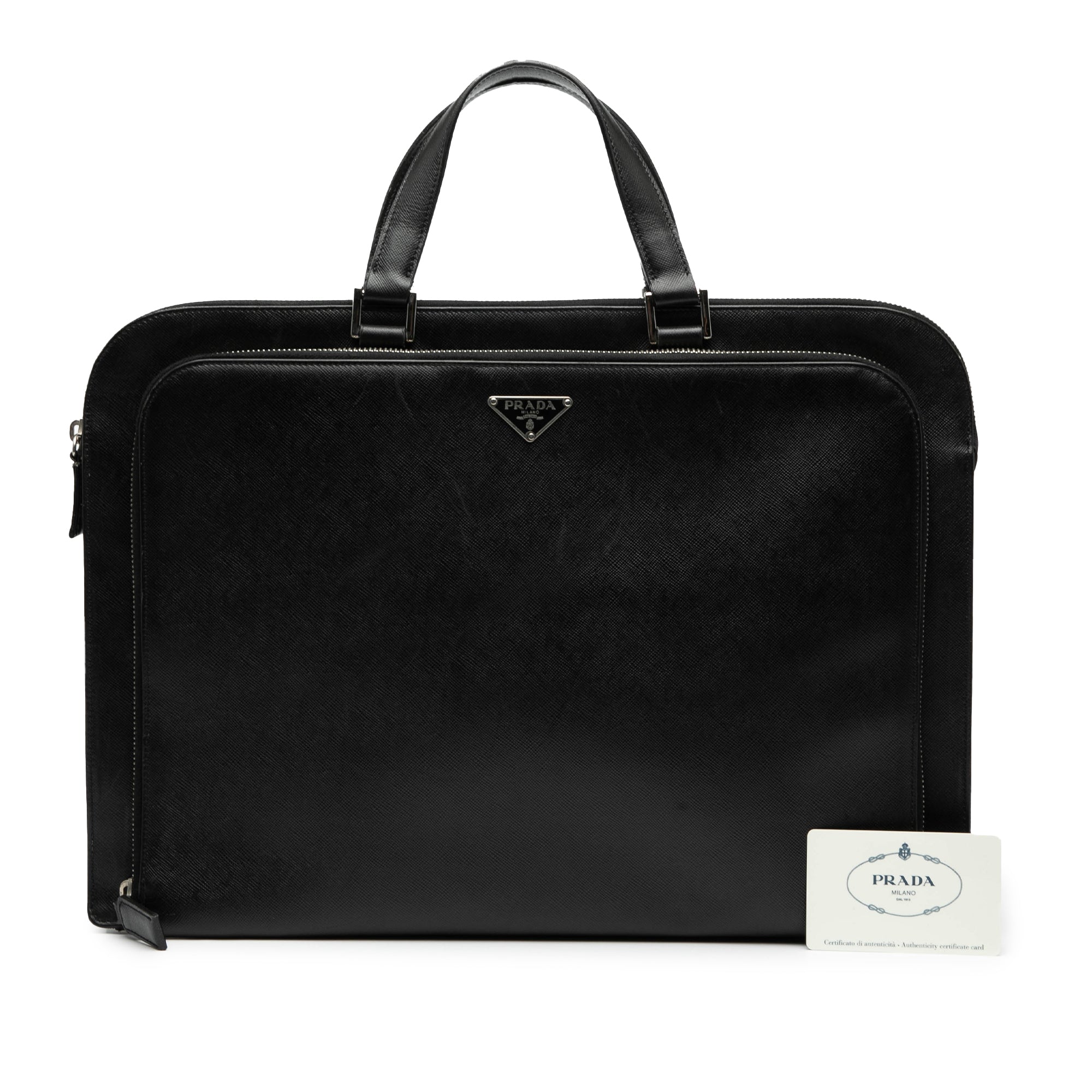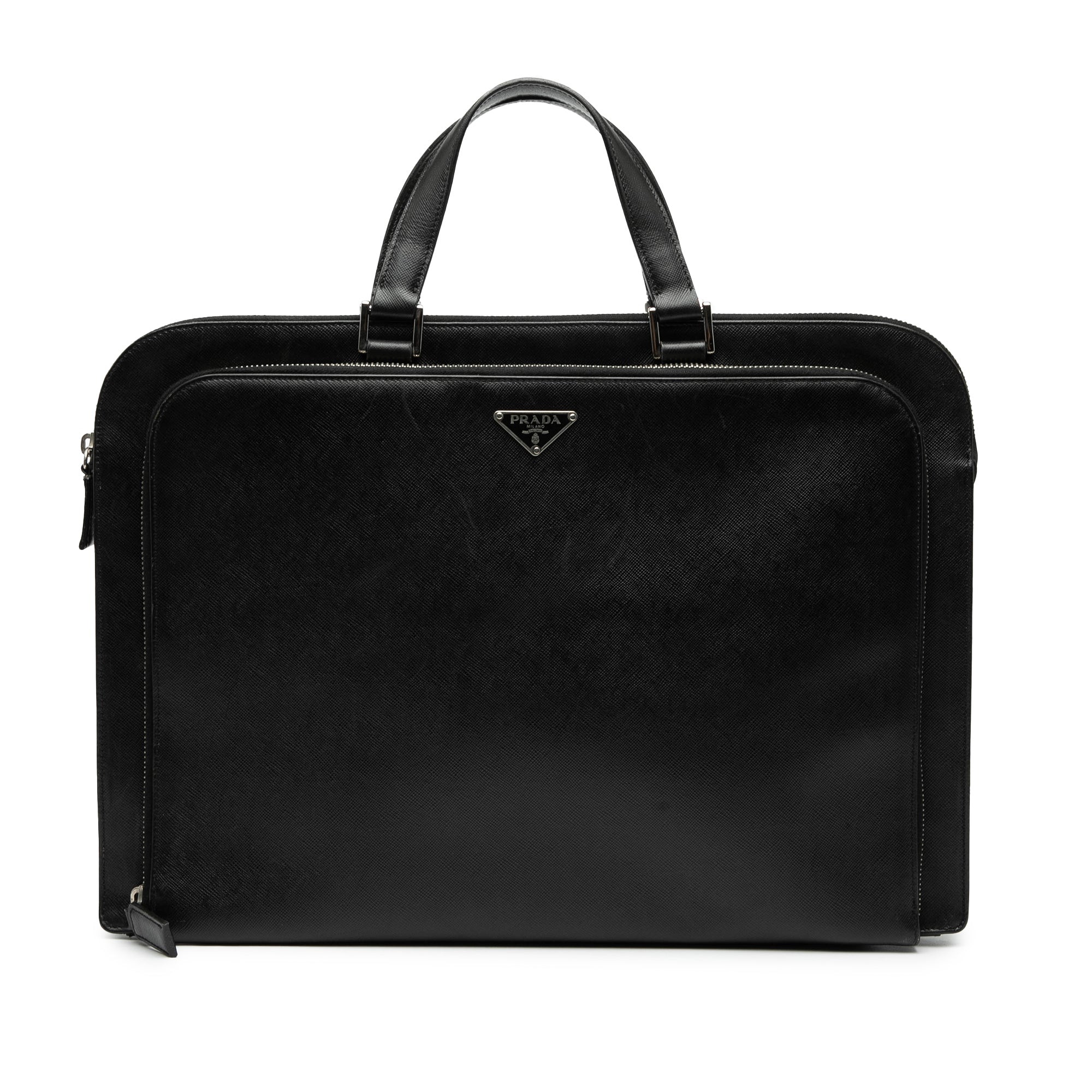 Product Details: Black Prada Saffiano Travel Briefcase Business Bag. This business bag features a saffiano leather body, flat leather handles, a top zip closure, an exterior front zip compartment, and interior zip and slip pockets. 11.2" L x 15.7" W x 3.1" D, 3.9" drop.