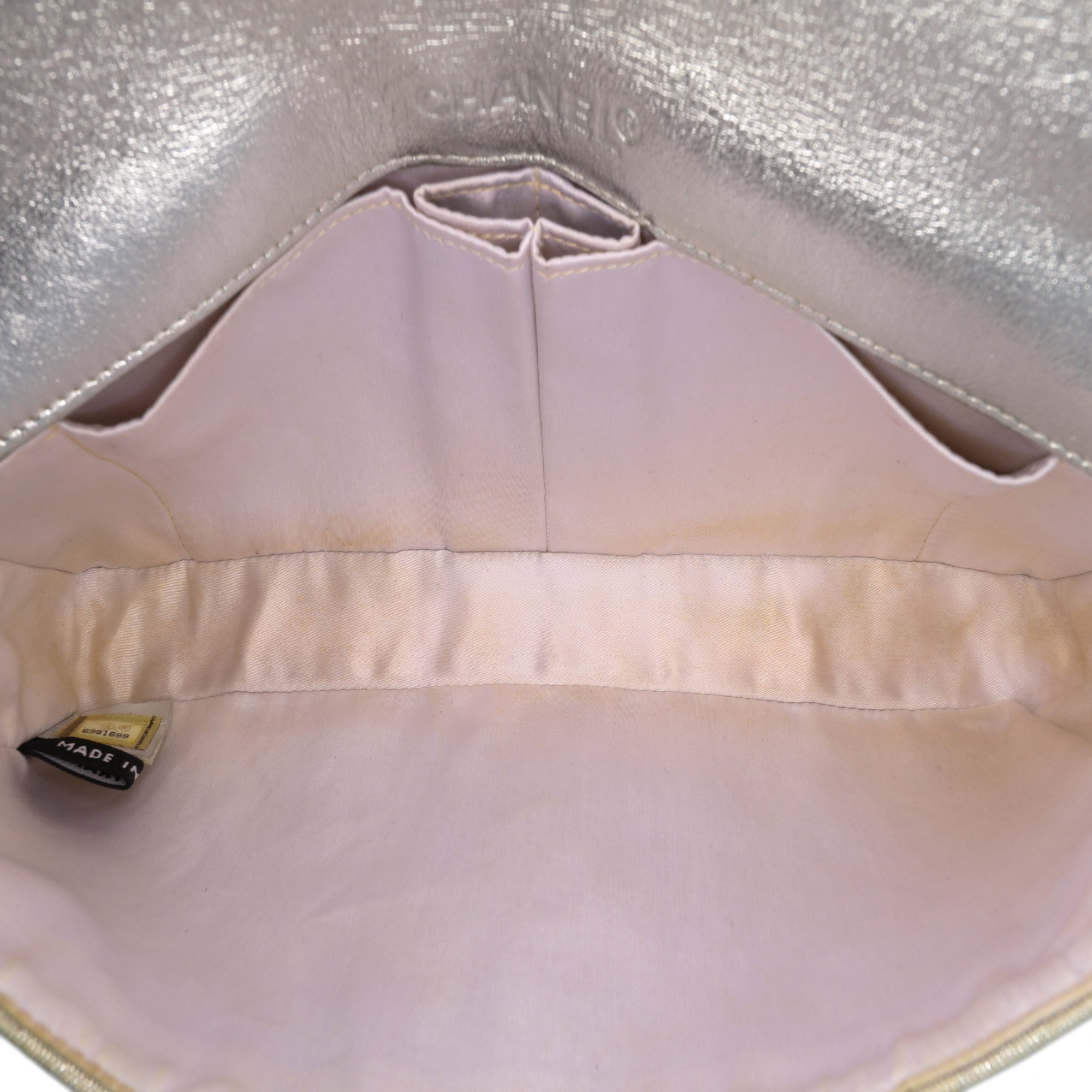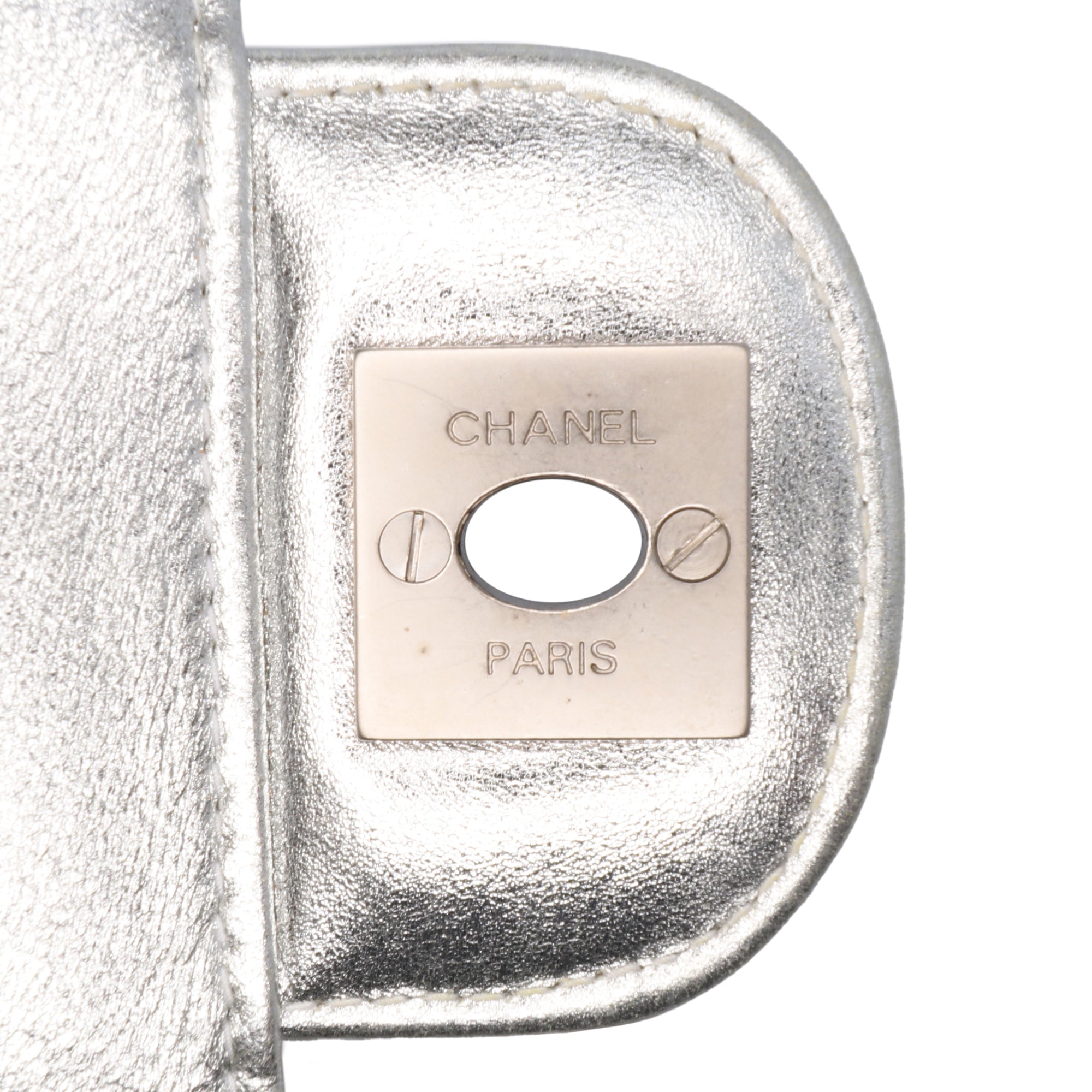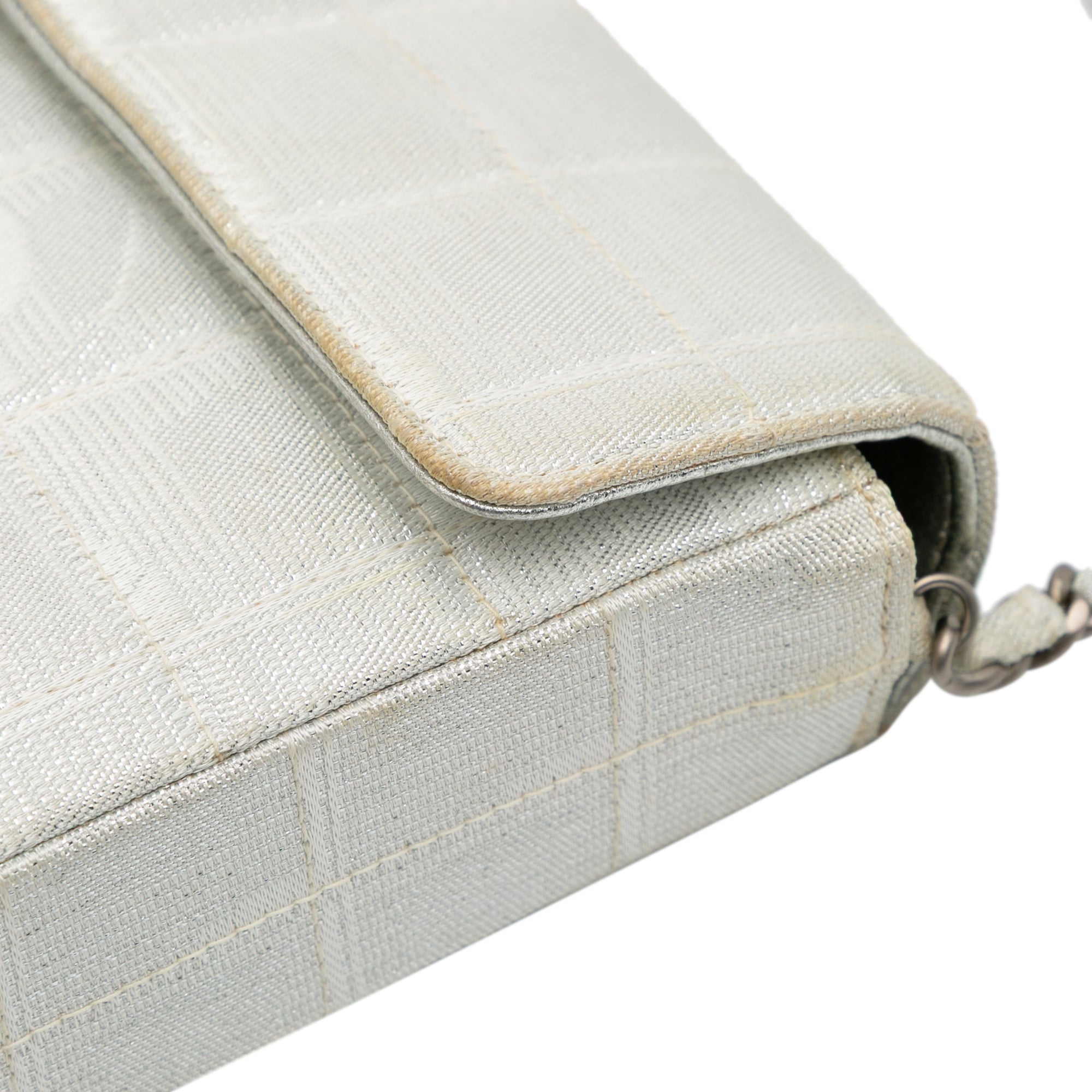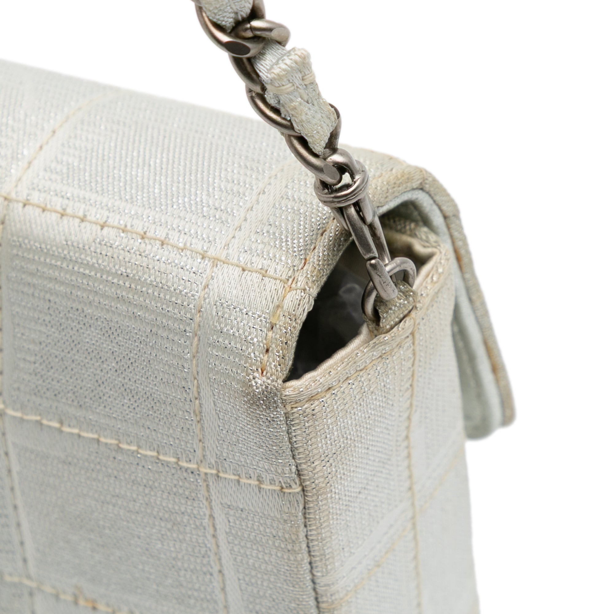 Product Details: Silver Chanel New Travel Line Nylon East West Flap Shoulder Bag. This shoulder bag features a nylon body, nylon woven chain link strap, front flap with twist lock closure, and interior slip pockets. 4.3" L x 10.2" W x 1.6" D. Serial number 6351699.