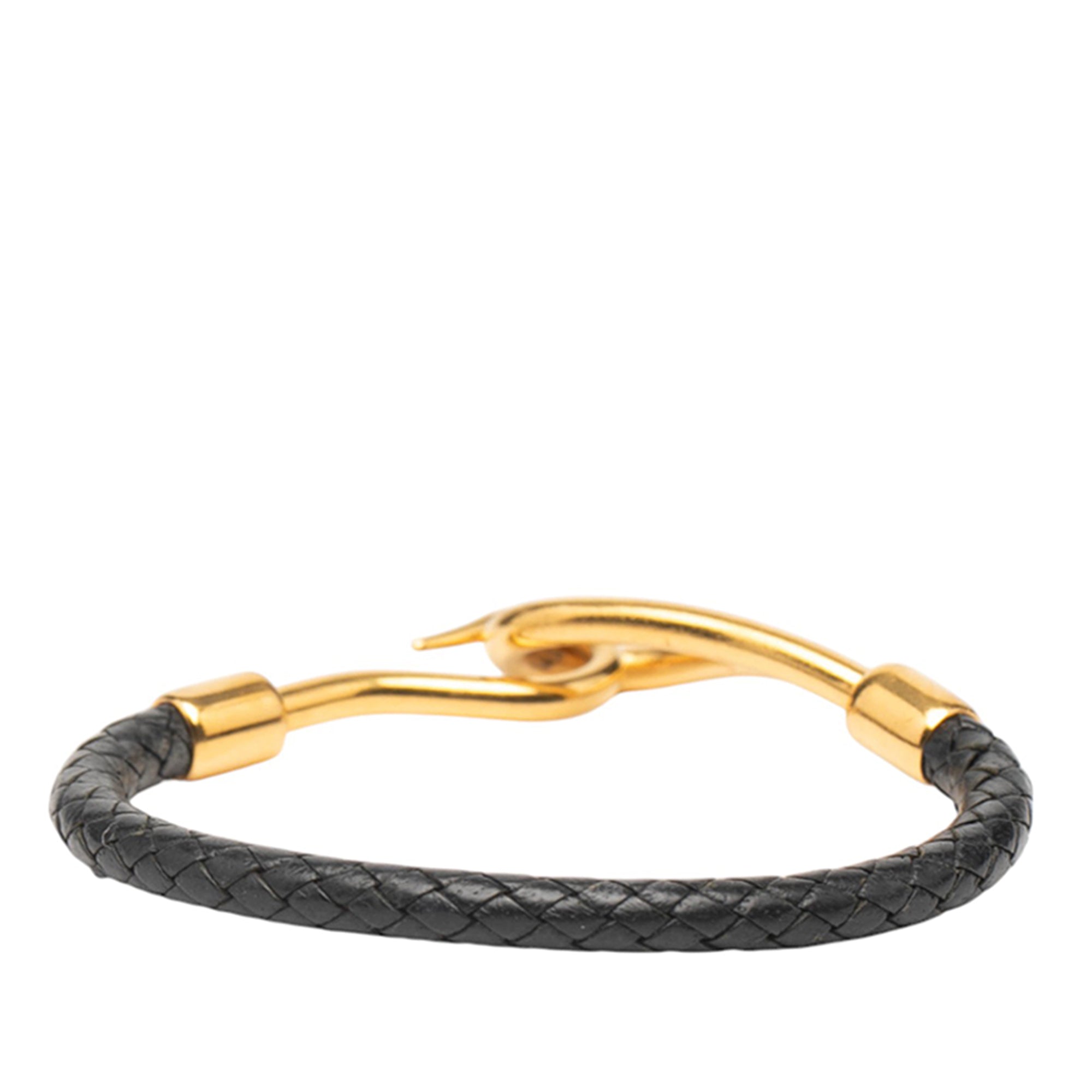 Product Details: Black Hermès Gold Plated and Braided Leather Jumbo Hook Bracelet. The Jumbo Hook bracelet features a braided rolled leather strap and a gold-tone metal hook closure. 6.9" L x 0.6" W x 0" D.