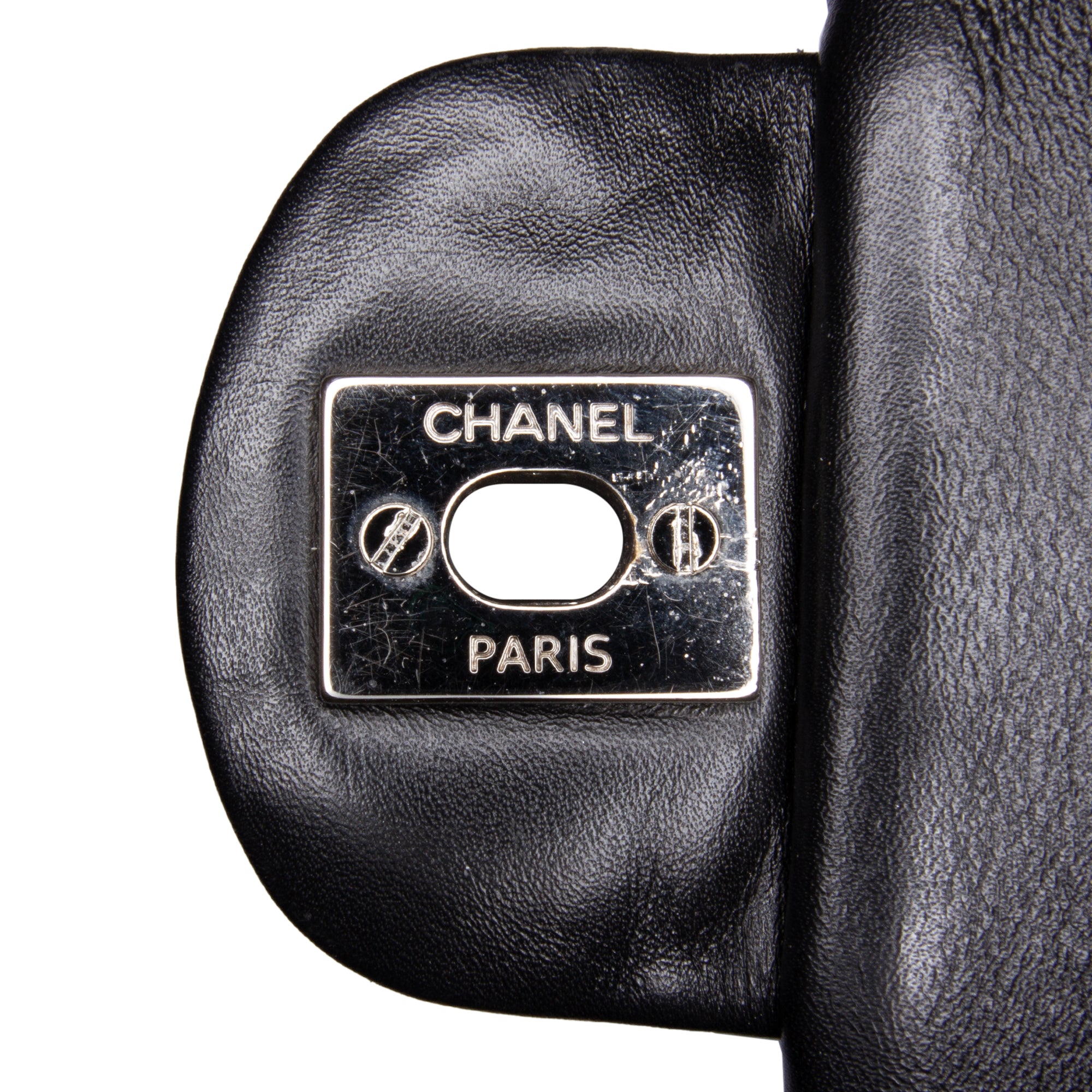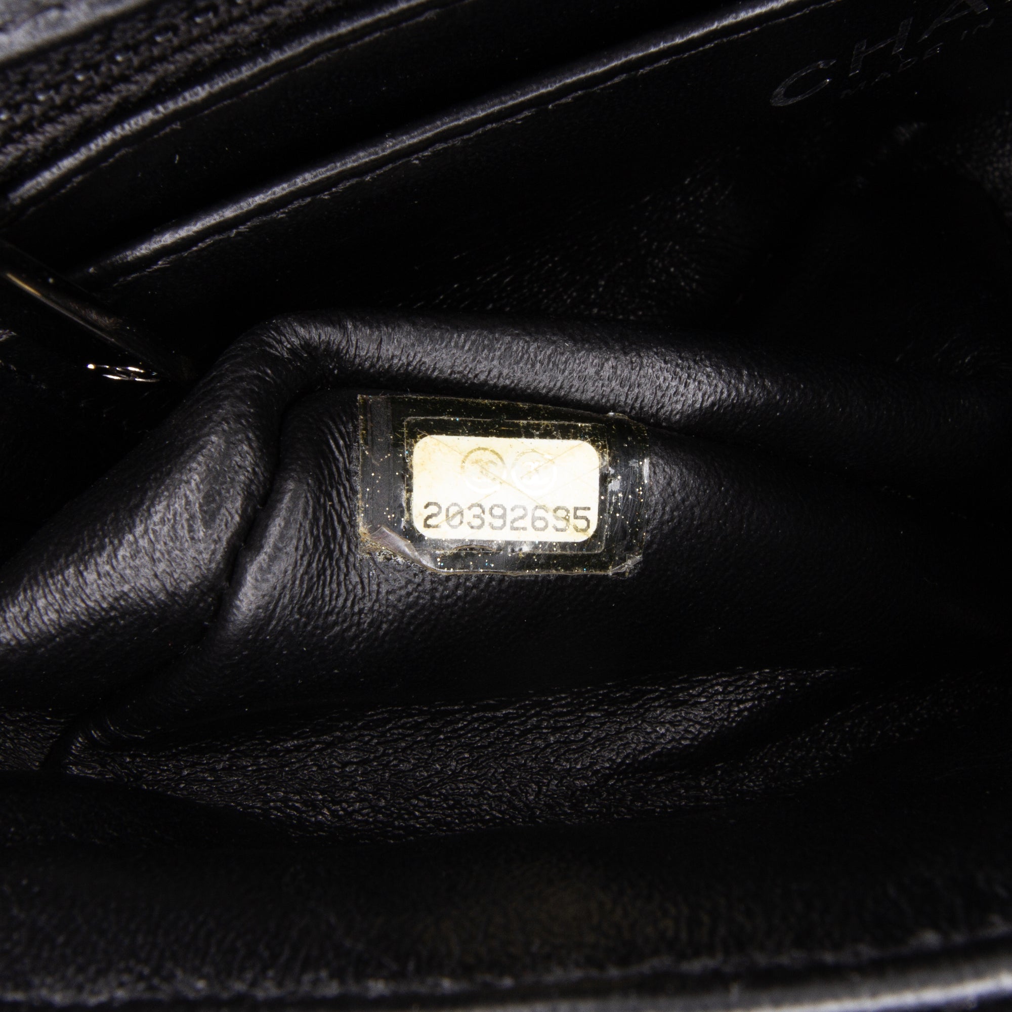 Product Details: Black Chanel Mini Rectangular Classic Patent Single Flap Crossbody Bag. This crossbody bag features a quilted patent leather body, a leather woven chain shoulder strap, a front flap with a twist lock closure, an exterior back slip pocket, and interior zip and slip pockets. 4.7" L x 7.9" W x 2.4" D. Serial number 20392695.