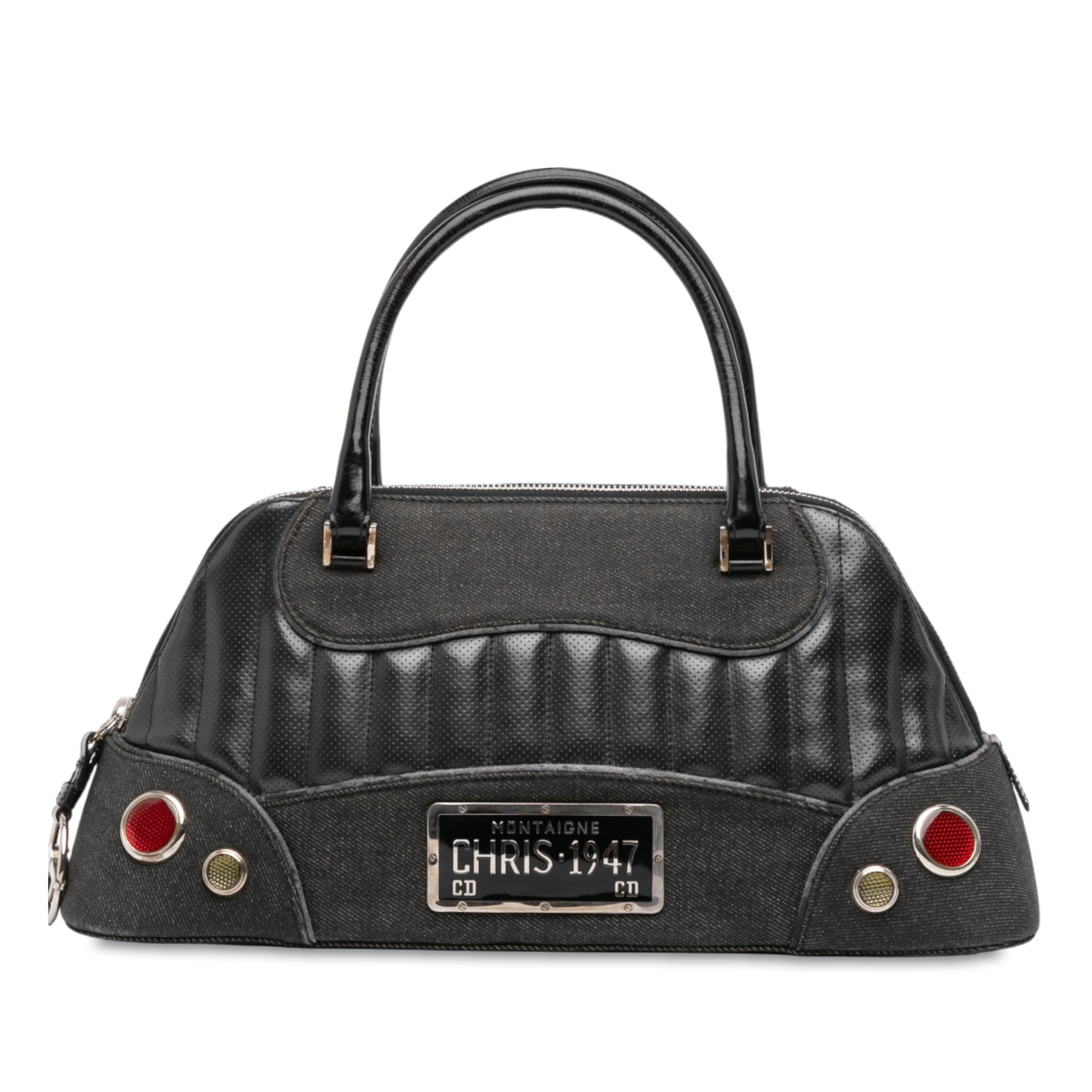 Product Details: Black Dior Perforated Leather and Denim Montaigne Chris 1947 Cadillac Top Handle Bag. This handbag features a perforated leather and denim body with metal hardware, rolled leather handles, a top zip closure, and interior zip and slip pockets. Exterior front, back and side has been repainted. 6.5" L x 14.2" W x 4.9" D, 4.5" drop. Serial number BM-0061.