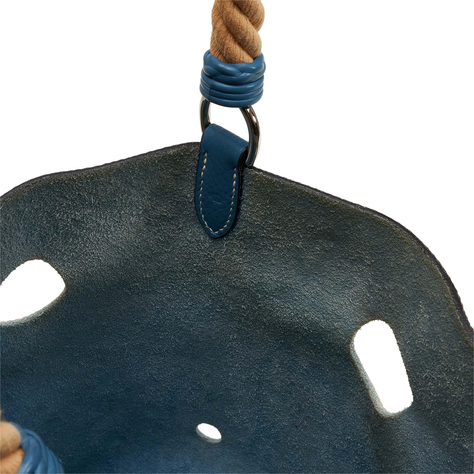 Product Details: Blue Hermès Clemence Mangeoire Bucket PM. The Mangeoire PM features a Clemence leather body with laser cut holes, a rope handle strap, silver tone hardware, and an open top. 8.3" L x 5.5" W x 5.5" D, 8.3" drop.